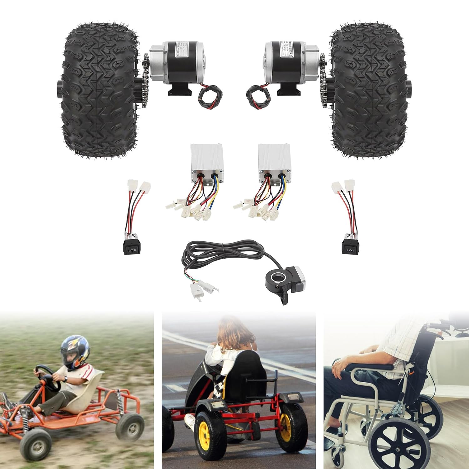 Motore potente: con il motoriduttore a spazzole da 250 W/350 W, può raggiungere una velocità massima di 10 km/h/6,21 mph. Rispetto ai motoriduttori brushless, ha un'elevata coppia di avviamento, un facile controllo e un'elevata adattabilità. Elevata sicurezza: la classe di isolamento F e la classe di protezione IP33 lo rendono sicuro e affidabile, le ruote da 10 pollici di diametro con design antiscivolo possono essere facilmente utilizzate nella maggior parte delle condizioni stradali. Quindi puoi usarlo con sicurezza. Facile da usare: il display digitale e la leva dell'acceleratore con indicatore di potenza possono regolare facilmente la potenza del motore, consentendo al conducente di vedere lo stato del veicolo a colpo d'occhio. Inoltre il veicolo è dotato di funzione di retromarcia che aumenta la flessibilità e la praticità del veicolo. Durevole: questo set di ruote doppie è realizzato in rame, ferro, alluminio, magneti e gomma di alta qualità, robusto, stabile, antiruggine e resistente all'usura, garantendo una lunga durata e un'elevata capacità di carico fino a 150-200 kg/330,69-440,92 libbre. Kit completo: questo kit contiene gli accessori completi necessari per modificare il tuo scooter senza doverlo acquistare separatamente. I kit coordinati sono adatti per piccoli go-kart, sedie a rotelle elettriche e scooter per disabili per anziani.