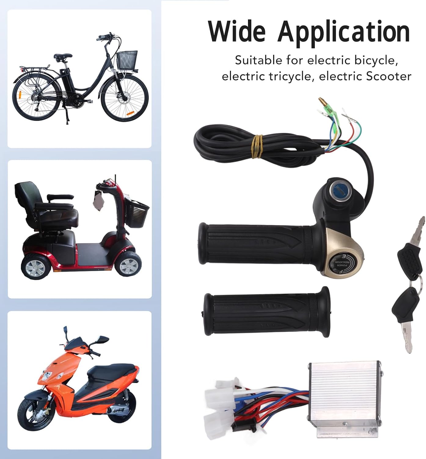 Buona dissipazione del calore: l'alloggiamento in metallo presenta scanalature che migliorano la dissipazione del calore, proteggendo i circuiti interni dal sovraccarico termico, favorendo longevità e prestazioni. Controllo costante della velocità: il nostro controller del motore a spazzole garantisce una velocità costante e fornisce un controllo sensibile durante la frenata e i cambi di direzione, rendendo le corse più fluide e sicure. Comoda impugnatura dell'acceleratore: l'acceleratore è realizzato in materiale di gomma morbida presa comoda, riducendo l'affaticamento durante i viaggi prolungati e migliorando l'esperienza dell'utente. Prestazioni affidabili: progettato per funzionare a 24 V con una potenza di 250 W, questo controller elettrico offre prestazioni stabili e affidabili per varie bici elettriche. Applicazione versatile: questo kit di conversione per bici elettrica è compatibile con biciclette elettriche, tricicli e motociclette, rendendolo una soluzione perfetta per un'ampia gamma di applicazioni.