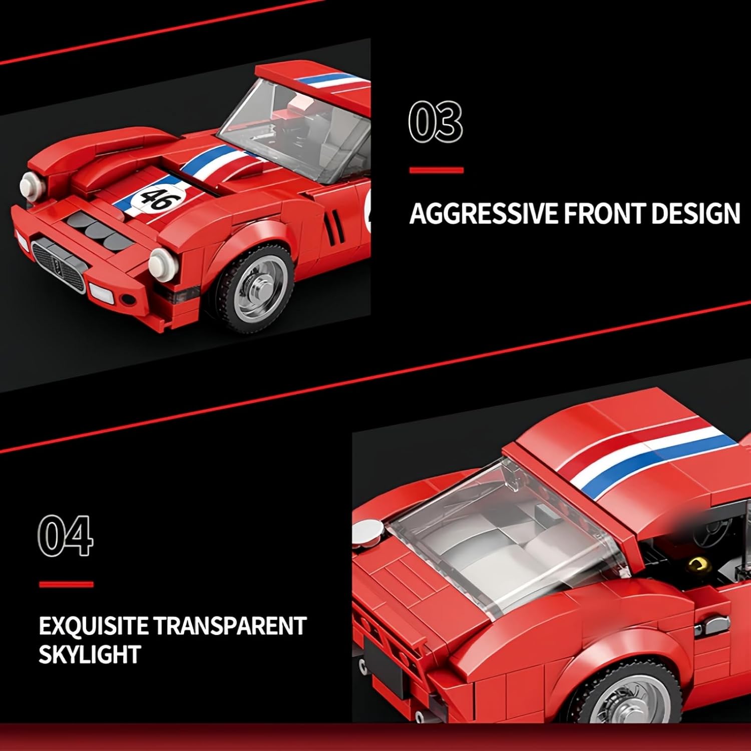 Modello di auto d'epoca: replica di un'auto classica e retrò con kit per una collezione della leggendaria Ferrari 250 GTO, un'auto super sportiva classica che spinge la velocità verso l'alto. La struttura dell'intero veicolo si basa sul design Widebody Stance e contiene elementi dei vari modelli classici. Le linee sono chiare e concise. Il protagonista del veicolo galoppa per la città e corre selvaggio come un animale. Mini auto da collezionare e decorare: questo set di auto da collezione con dimensioni adeguate, design innovativo e aspetto elegante vale la pena di essere esposto e collezionato a casa o in ufficio ed è una straordinaria aggiunta alla tua collezione o alla decorazione dell'ufficio. Materiale ABS: utilizzando parti di fusione di precisione in plastica di alta qualità, innocue e sicure con bordi lisci, senza sbavature e senza odori, la sicurezza del processo di assemblaggio è garantita, elevata compatibilità del prodotto e nessuna caduta. Facile da costruire: con istruzioni passo passo chiare e illustrate, il kit modello offre ai costruttori un'esperienza di assemblaggio semplice e divertente. Con non più di 500 elementi costitutivi, questo set è un gioco da ragazzi e aiuta i collezionisti di Speed Champion a vivere un'esperienza di costruzione fluida. OTTIMA IDEA REGALO: regala a te stesso o a chi ama le supercar e i modelli di veicoli con il nostro mini kit per auto da corsa. Sorprendili con un regalo creativo per il compleanno, il Natale e altre occasioni speciali. È ideale da posizionare sul tavolo della camera da letto o dell'ufficio e crea un'atmosfera accogliente.