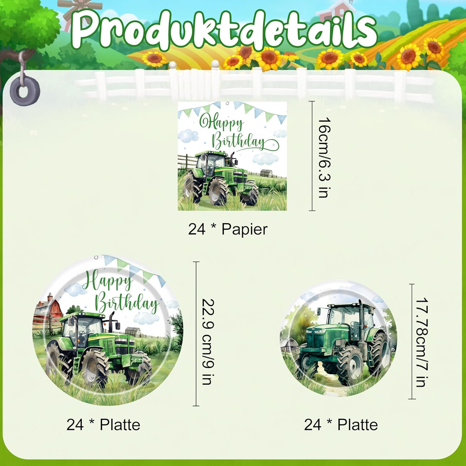 La confezione include: riceverai un set di piatti per feste a tema trattore, tra cui 24 piatti di carta grandi da 22,9 cm, 24 piatti di carta piccoli da 17,8 cm, 24 tovaglioli, totale 96 pezzi per 24 ospiti Materiale elevato: il set di piatti per feste a tema trattore è realizzato in carta di alta qualità, leggero, facile da trasportare, robusto e durevole, non facile da immergere di olio. I tovaglioli sono morbidi e delicati sulla pelle, garantendo ai tuoi ospiti un'esperienza culinaria confortevole Facile da usare: questo set di posate è progettato per comodità. Non c'è bisogno di lavare le posate dopo l'uso, possono essere scartate direttamente, risparmiando tempo e fatica. Con questo set di posate, puoi goderti di più la tua festa e concentrarti sulla creazione di un'esperienza divertente e memorabile per tutti Design unico: le decorazioni a tema trattore mostrano il classico stile country, aggiungendo divertimento e vigore alla tua festa. Immergiamoci in questa energica festa del trattore e condividiamo un buon momento di festa. Ravviva la festa di compleanno del tuo bambino di 2 anni con il nostro set di decorazioni a tema camion da costruzione Occasioni applicabili: la decorazione a tema trattore è perfetta per organizzare feste di compleanno a tema trattore, feste a tema fattoria, feste a tema agricoltori, feste a tema camion ingegneristico, ecc., creerà momenti indimenticabili e meravigliosi per feste in fattoria per te