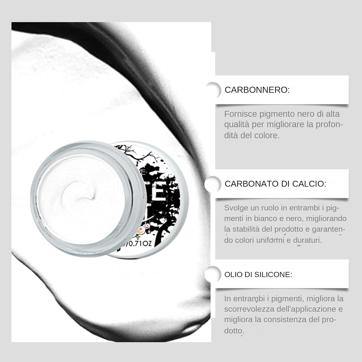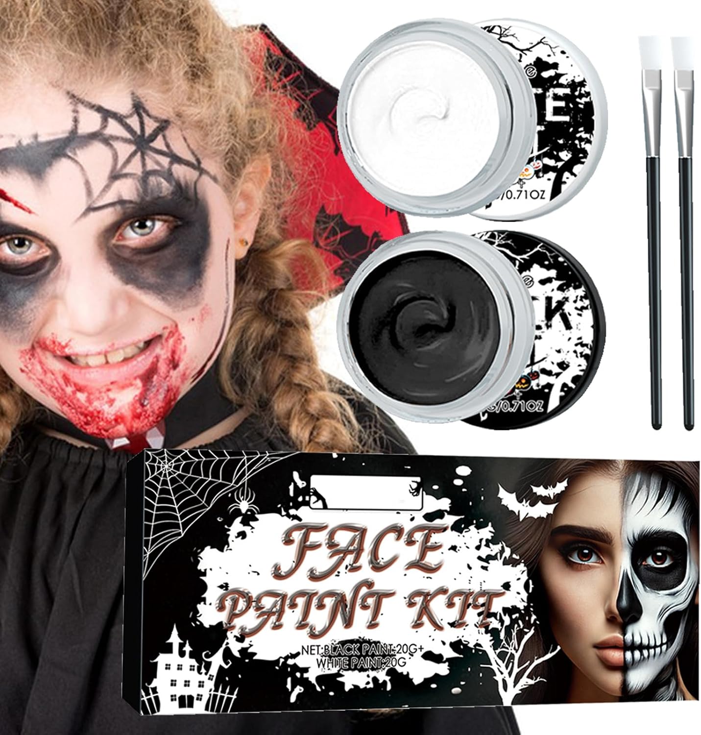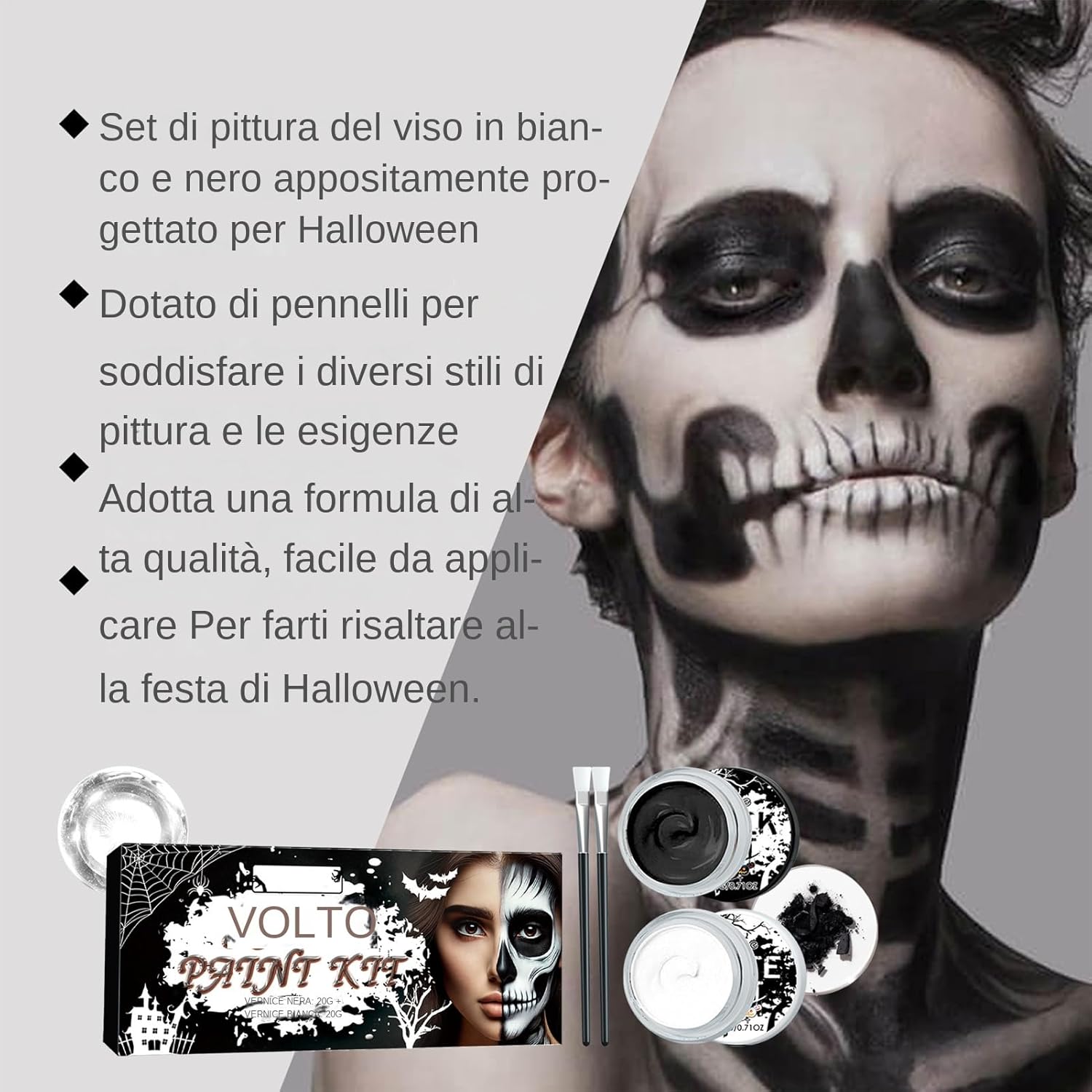 Gentle sulla pelle: formulato con ingredienti per il trucco delicati e non irritativi, questa vernice per il viso in bianco e nero garantisce un carico zero sulla pelle, rendendolo adatto a tutti i tipi di pelle, inclusa la pelle sensibile. Ombra in bianco e nero: le tonalità in bianco e nero si adattano perfettamente a questo tema misterioso e inquietante di Halloween, fortemente contrastante per entrare istantaneamente nella festa , che ti trasformi in fantasmi, zombi o personaggi classici di film in bianco e nero. Facile da usare: la nostra vernice per il viso in bianco e nero garantisce una facile applicazione, consentendo anche ai principianti di rappresentare facilmente motivi sorprendenti sul viso e sul corpo. Trucco duraturo: la nostra vernice per il viso in bianco e nero promette una colorazione lonsg e ferma che rimane intatta tutta la notte. La sua formula resistente al sudore e impermeabile ti assicura di rimanere la presenza più luminosa della festa, anche sotto lo sfregamento leggero. Rimuovi senza sforzo: risparmia la pelle dallo strofinamento duro con la nostra vernice per il viso in bianco e nero. Può essere lavato senza sforzo con un normale detergente o un rimborso del trucco, causando .