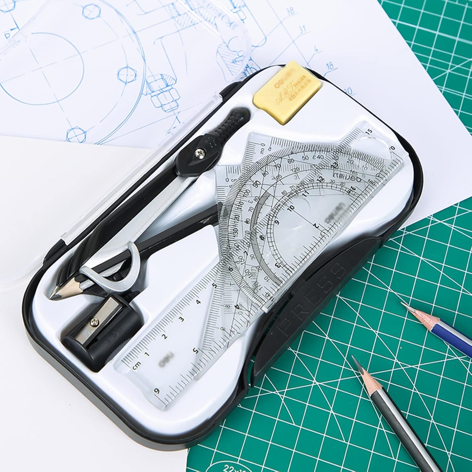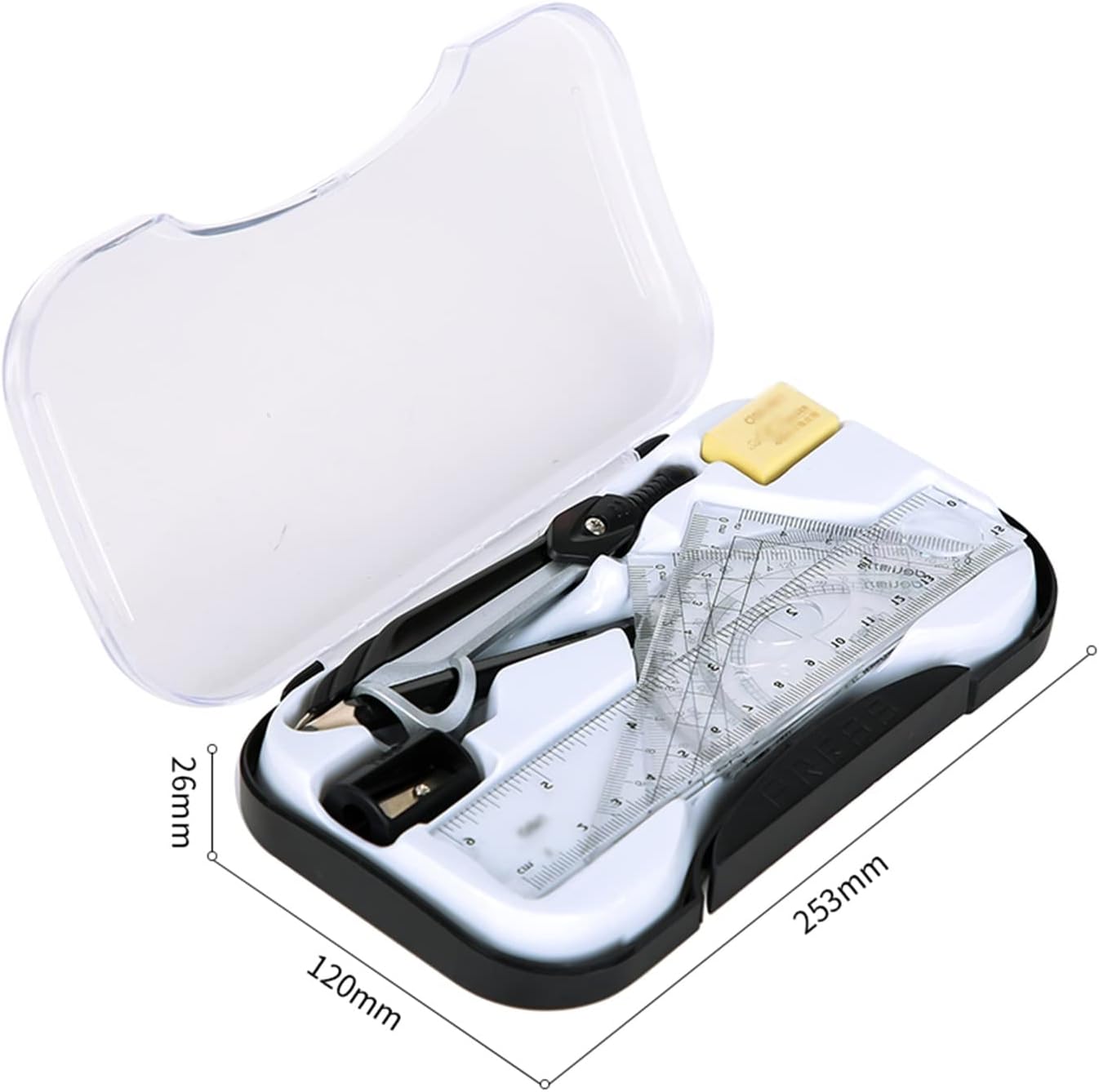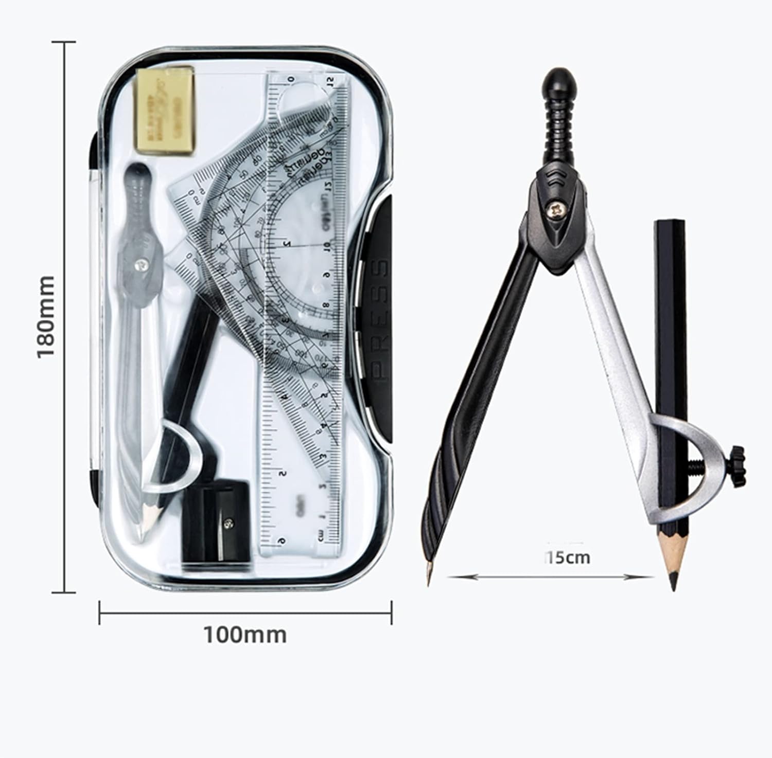 Il set di kit di geometria da 7 pezzi include: 1 compasso da studio in metallo, 2 triangoli (45° e 30°), 1 righello, 1 Protresor, matita per compasso, temperamatite, facilitatore. Il compasso è aperto sul bordo e può tracciare un cerchio del diametro di 30 cm. La testa della bussola dal design ergonomico è comoda da tenere, supporto universale per bussola con qualsiasi matita o penna di dimensioni standard, righelli, triangoli e protactor. Graduazioni per una facile identificazione insieme a una scatola di immagazzinaggio resistente, facile da trasportare e riporre. Una buona scelta per insegnanti e studenti: è anche un regalo perfetto per i tuoi bambini e amici, facile da portare in classe e riporre in classe e a casa. Adatto a insegnanti e studenti, il nostro set di compassi può disegnare qualsiasi forma geometrica.