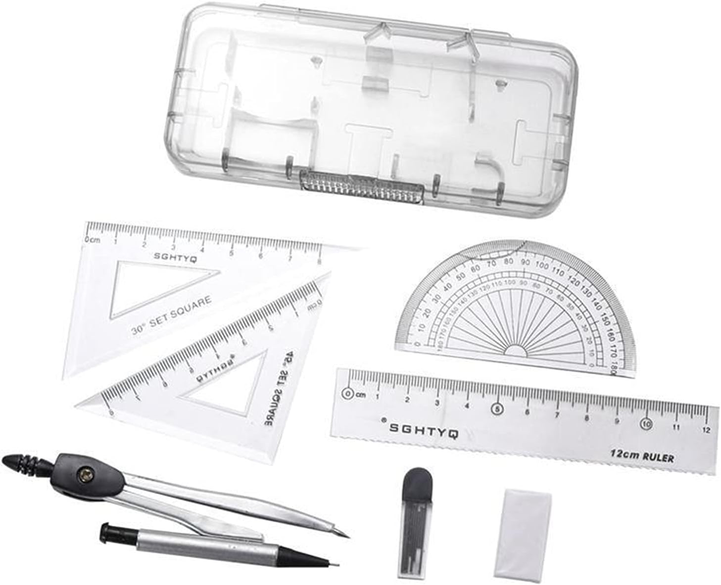 Compagno Affidabile: Strumenti come compasso e goniometro con marcature precise soddisfano tutte le esigenze di geometria di base, assistendo gli studenti in esercizi di disegno durante lezioni e routine di studio Strumenti essenziali studenti: Il set geometria include tutti gli strumenti indispensabili, bilanciando praticità e stile mentre migliora la produttività in classe; il design curato appassiona studenti dalla settima alla dodicesima classe, ideale come regalo per il rientro a scuola che unisce funzionalità ed estetica moderna per compiti di geometria quotidiani Accessibilità ottimizzata: Con la sua soluzione di archiviazione ben progettata, il kit di geometria assicura che ogni elemento di un set di 8 strumenti sia fissato saldamente in scomparti individuali, evitando perdite e mantenendo l'ordine in zaini o cassetti, per creativi e studenti che gestiscono multiple strumenti giornalmente Design Accattivante: Questo set di geometria per studenti unisce motivi geometrici a un aspetto bicromo trasparente, creando una combinazione di colori moderna e attraente che si adatta perfettamente all'estetica adolescenziale e rende lo studio più piacevole. Strumento didattico a basso riflesso: La presenza di scale a contrasto attenuato e superfici opache minimizza i riflessi, garantendo massima chiarezza d'uso durante compiti di matematica o progetti tecnici mentre favorisce l'apprendimento concentrato