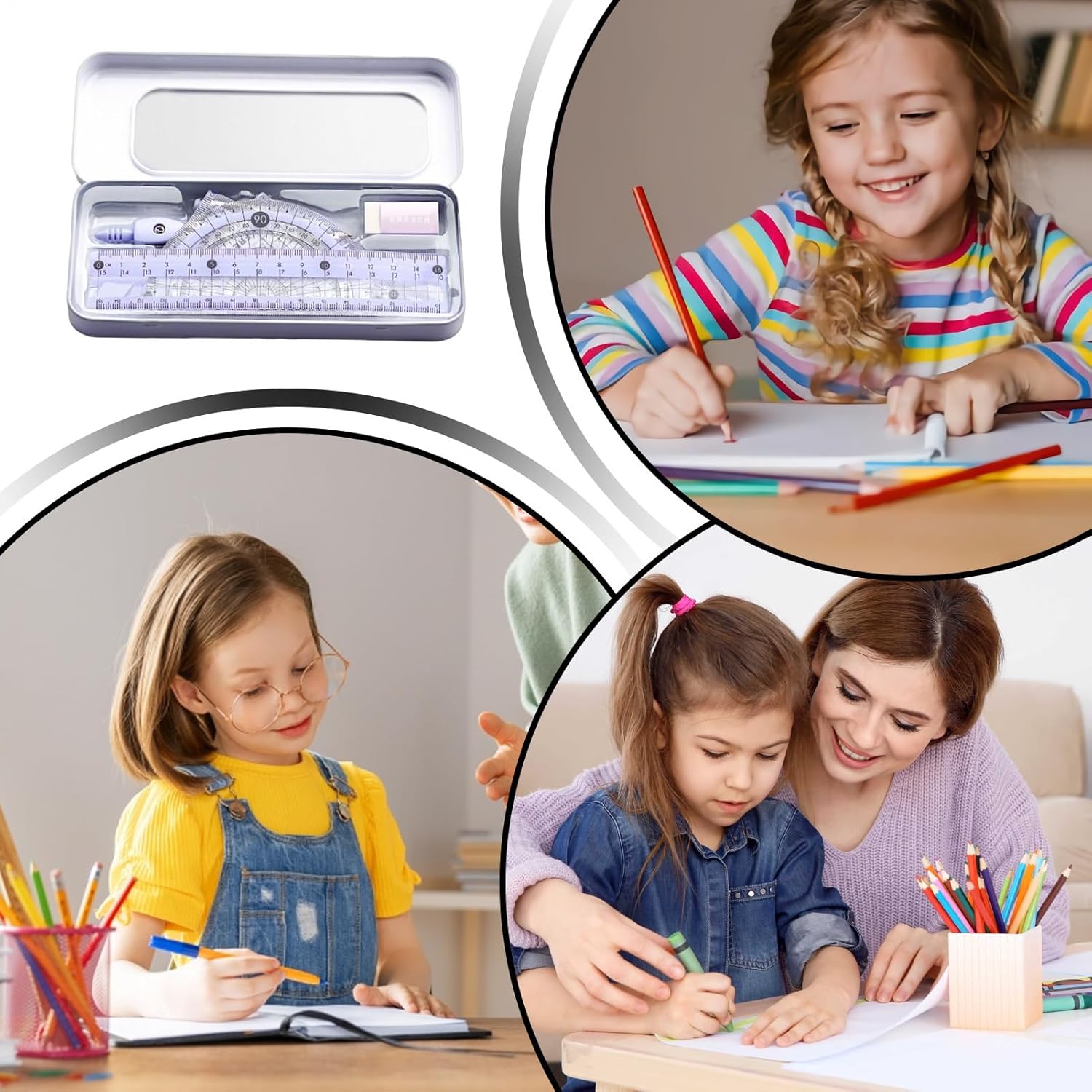 Strumenti di Geometria Precisi: Compasso e goniometro con scale chiare e accurate affrontano le esigenze di disegno tecnico, aiutando gli studenti a ottenere risultati migliori in attività matematiche dentro e fuori la scuola Regalo premuroso studenti: Questo set di righelli geometria combina strumenti con attenzione ai dettagli, studiato per studenti che cercano efficienza ed eleganza; il design attraente e l'utilità versatile lo rendono indispensabile dalla settima alla dodicesima classe, oltre ad essere un regalo pensato per ogni studioso Risparmio spazio intelligente: Il kit di geometria offre una soluzione pratica con scomparti segmentati per contenere un set di 8 strumenti, riducendo il disordine e prevenendo la perdita degli , mentre si adatta facilmente a zaini o cassetti, vantaggioso per professionisti e studenti che necessitano di supplie ordinati a portata di mano Estetica Coinvolgente: Il set geometrico integra motivi originali con un design bicromo trasparente, offrendo un effetto colorazione bicolore elegante che cattura l'attenzione dei giovani e si abbina al loro stile contemporaneo. Design per concentrazione: Le scale a contrasto morbido migliorano la visibilità riducendo l'abbagliamento, favorendo un utilizzo confortevole durante attività dettagliate come compiti di geometria o esercizi di disegno tecnico