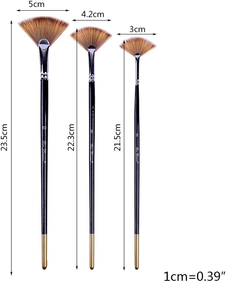 3 spazzole a forma di ventaglio in rame Tubo in rame antiruggine + manico in legno: setole morbide e flessibili, manico in legno per un controllo e una presa ottimale e una grande sensazione al tatto Ampia varietà: questi pennelli sono ideali per acquerello, olio, pittura acrilica, corpo, unghie, pittura del viso, miniatura, modello, ceramica, pittura artistica. Ideale per bambini, principianti, artisti o chiunque si diverta a dipingere Versatilità: questo fantastico set di 3 pennelli è perfetto per qualsiasi artista, dai principianti ai professionisti o al tipo di pittura. Che siate pennelli per hobby, pennelli per bambini o pennelli, questo set di pennelli per artisti vi piacerà Facile da pulire: per pulire, passare i pennelli sotto l'acqua calda, lavare la vernice e utilizzare delicatamente le dita per rimodellare