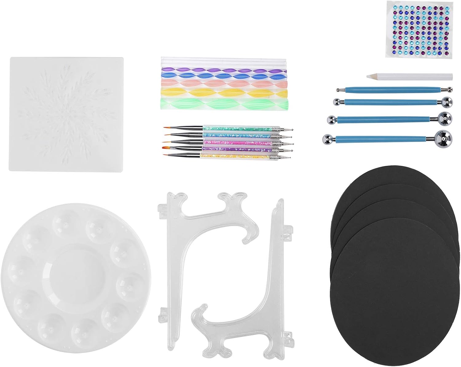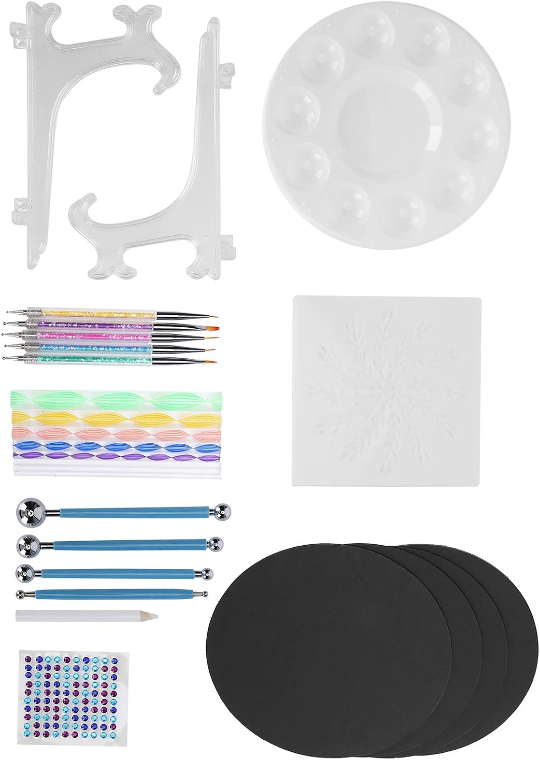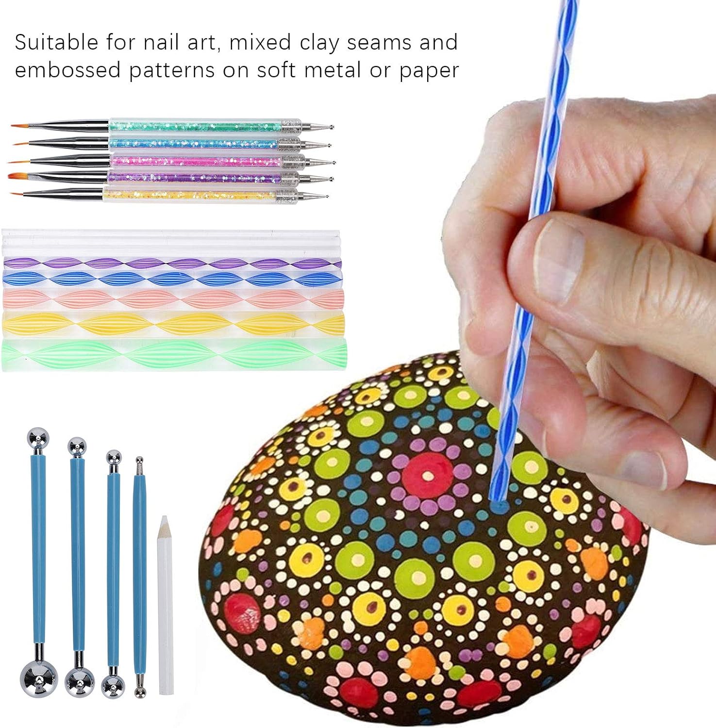 [KIT MANDALA PREMIUM DA 34 PEZZI] Il nostro set completo include tutto il necessario per splendidi modelli mandala art-8, 5 penne diamantate, 4 stilo in acciaio, 8 bastoncini acrilici e altro ancora. per creare intricati motivi a punti su rocce, tele, carta e altre superfici con risultati professionali. [STRUMENTI DI GRADO PROFESSIONALE] Progettati con acciaio inossidabile di alta qualità e materiali acrilici durevoli, questi strumenti di punteggiatura non si deformano né si deformano. Il design ergonomico offre il controllo per creare punti uniformi e motivi mandala impeccabili con punte di diverse dimensioni. [ DI MODELLI FACILE DA USARE] Sia i principianti che gli esperti adoreranno gli stencil inclusi che aiutano a delineare i disegni dei mandala. Combinalo con penne punteggiate di varie dimensioni per creare opere d'arte mozzafiato con simmetria e risultati dall'aspetto professionale. [SET CREATIVO MULTIUSO] Oltre all'arte dei mandala, questi strumenti versatili funzionano magnificamente per disegni di nail art, decorazione di torte, modellazione di argilla, goffratura di metalli e altri progetti di artigianato. Un must per artisti, artigiani e appassionati di fai da te. [FACILE DA PULIZIA E PORTATILE] Tutti gli strumenti sono dotati di superfici lisce che si puliscono facilmente con un panno umido. La struttura leggera ma resistente rende questo set adatto agli artisti in movimento. Include una comoda soluzione di archiviazione per mantenere i tuoi strumenti organizzati.