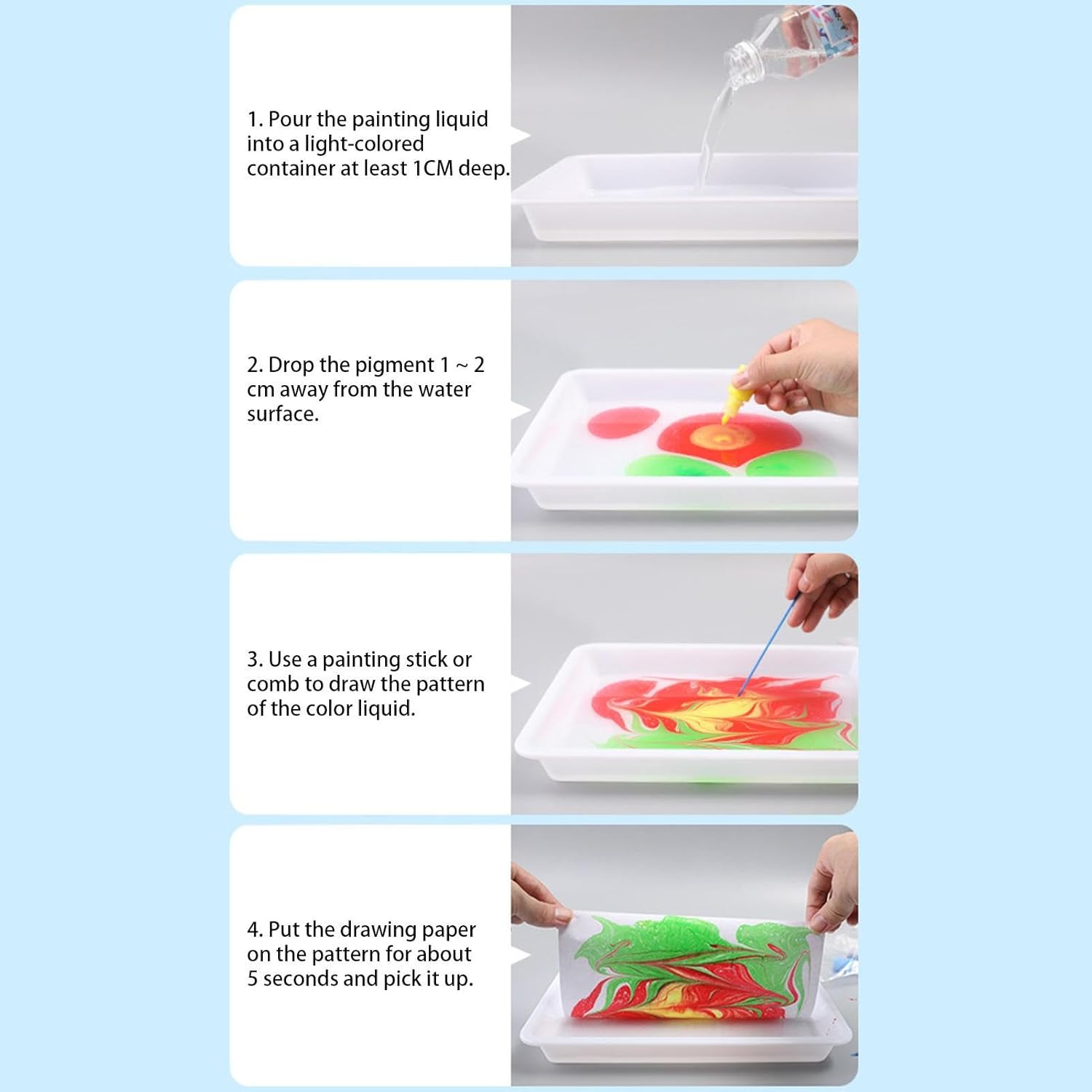 [Giocattolo attraente] Adottando un nuovo concetto di pittura in di creare motivi simili al marmo su qualsiasi cosa, il set di pittura per marmorizzazione 'acqua consente di creare moi, come fiori, , esplosioni, cuori, geometria, ecc., Basta immergere i tuoi oggetti preferiti nel tuo preferito colori e il gioco è fatto. [Diverse funzioni] Regali divertenti ed educativi per tutte le età, il kit di pittura marmorizzata per bambini è lo speciale processo di pittura che ti consente di creare splendide opere d'arte in un modo nuovo, liberando e stimolando la creatività. [Prodotti di alta qualità] Il kit artistico di pittura marmorizzata fatto a mano è realizzato con lozione acrilica di alta qualità e polvere di carbonio, in modo che possa galleggiare sull'acqua, creare più facilmente moi unici con pigmenti ed espandere ulteriormente la tua creatività, creando molti moi unici e versatili i motivi ruotando un attorno alla vernice. [Comodo da pulire] Utilizzando ingredienti sicuri e completamente non irritanti per la pelle, il kit di vernice marmorizzata per bambini può essere facilmente lavato via con acqua e sapone neutro dopo 15 minuti di attività o dopo la scuola, adatto a bambini di età superiore a 6 anni, supervisione di un adulto è raccomandato. [Ampia applicazione] Non solo stampare carta, ma puoi anche stampare tutto ciò che ti piace, come scarpe, tazze, vestiti, ecc. Marbling Painting Art Kit è un'd'arte unica fatta a mano, ispirata da te, dai gioco alla tua creatività, il dipinto speciale processo che ti consente di creare straordinarie opere d'arte in un modo nuovo.