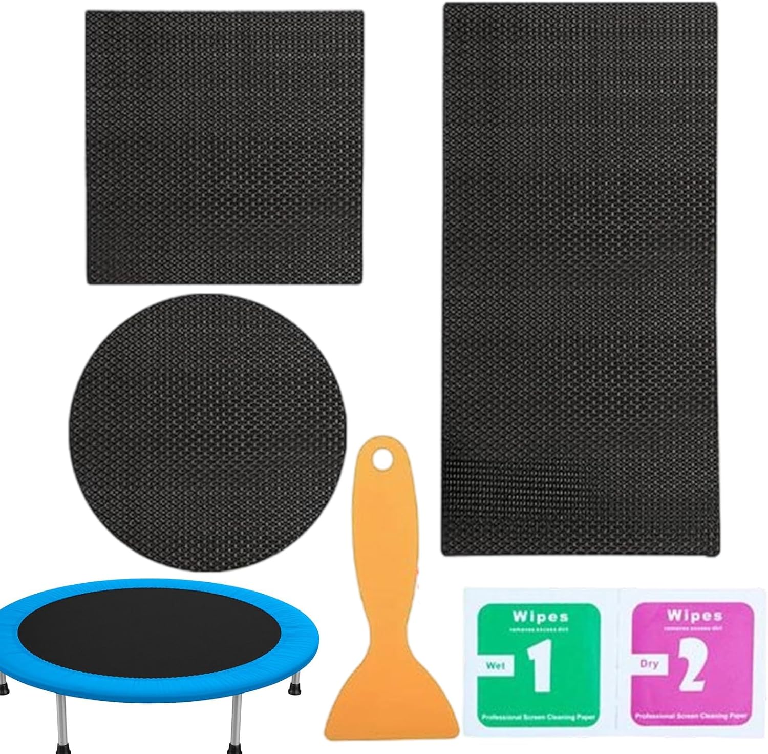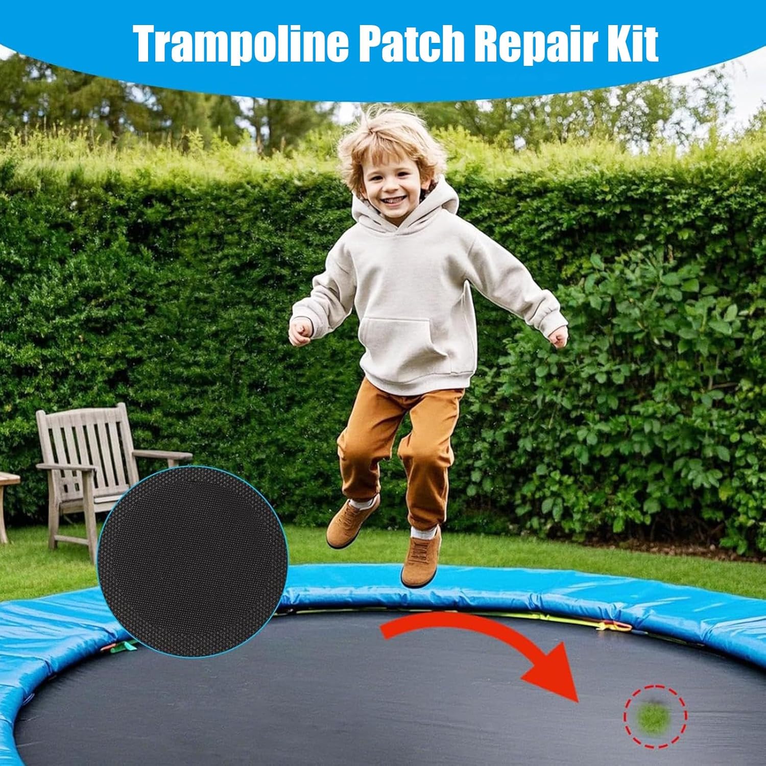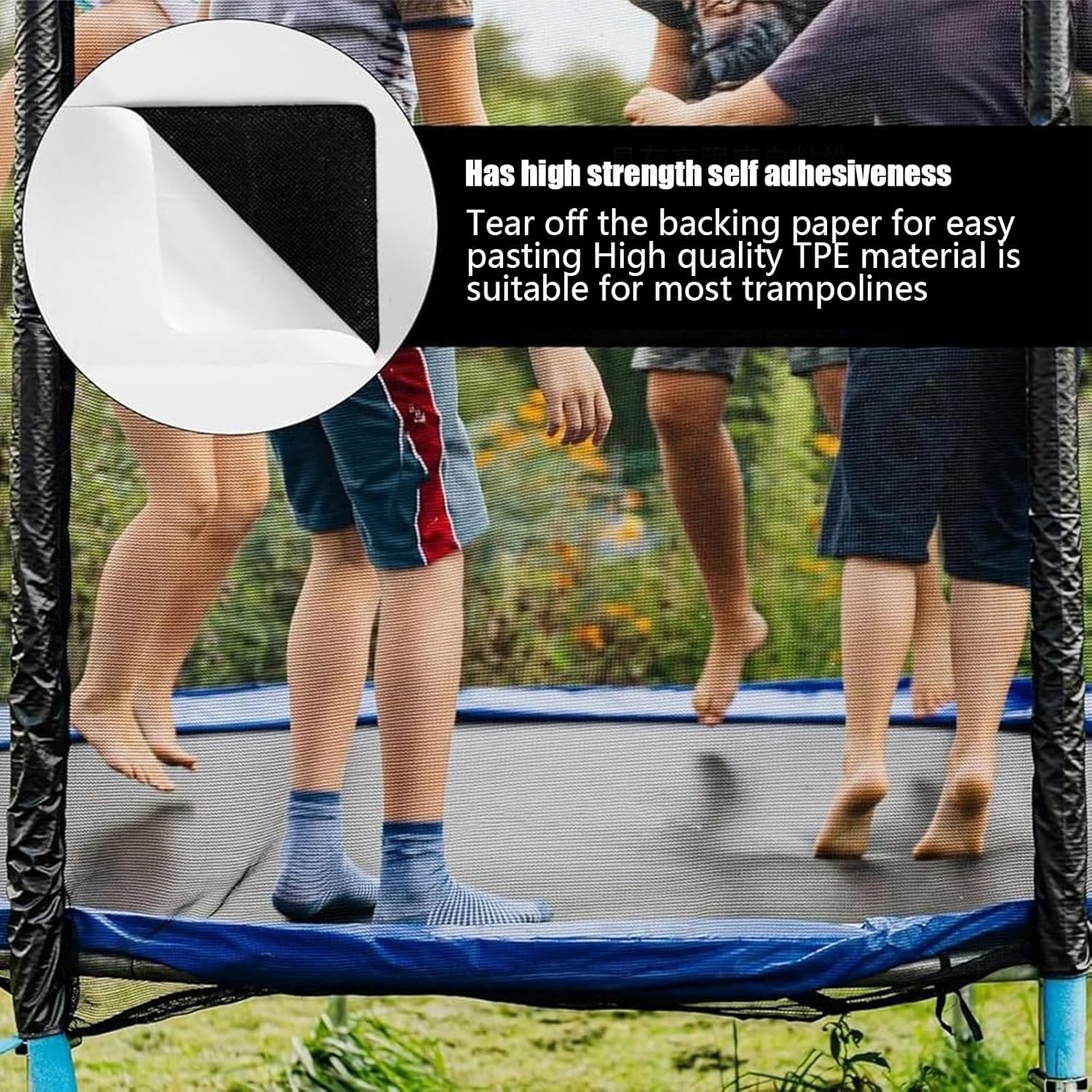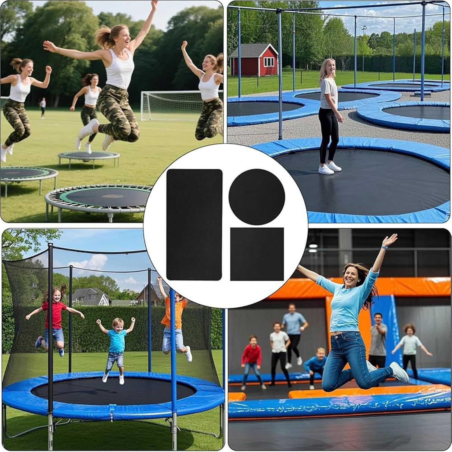 Manutenzione pratica: il kit completo include gli elementi necessari per pulire, preparare e applicare facilmente patch di riparazione sul trampolino grazie al suo adesivo ad attivazione immediata Modularità: combinazione di 3 patch complementari per soddisfare esigenze di riparazione diversificate, compatibilità ottimale con diversi tipi di danni grazie alla loro flessibilità dimensionale e strutturale Riparazione durevole: resistente incollaggio progettato per riparazioni di trampolini con adesivo ad alta resistenza che resiste ai raggi UV intensi, ai distacchi e al calore, garantendo una durata ottimale anche sotto l'esposizione solare prolungata. Solidità comprovata: struttura multistrato rinforzata che garantisce una tenuta perfetta contro strappi accidentali, anche su superfici di salto intensive Durabilità provata: materiali resistenti ai raggi UV e alle variazioni climatiche (da -15C a +45C), mantenendo la loro elasticità e potere adesivo per almeno 3 stagioni