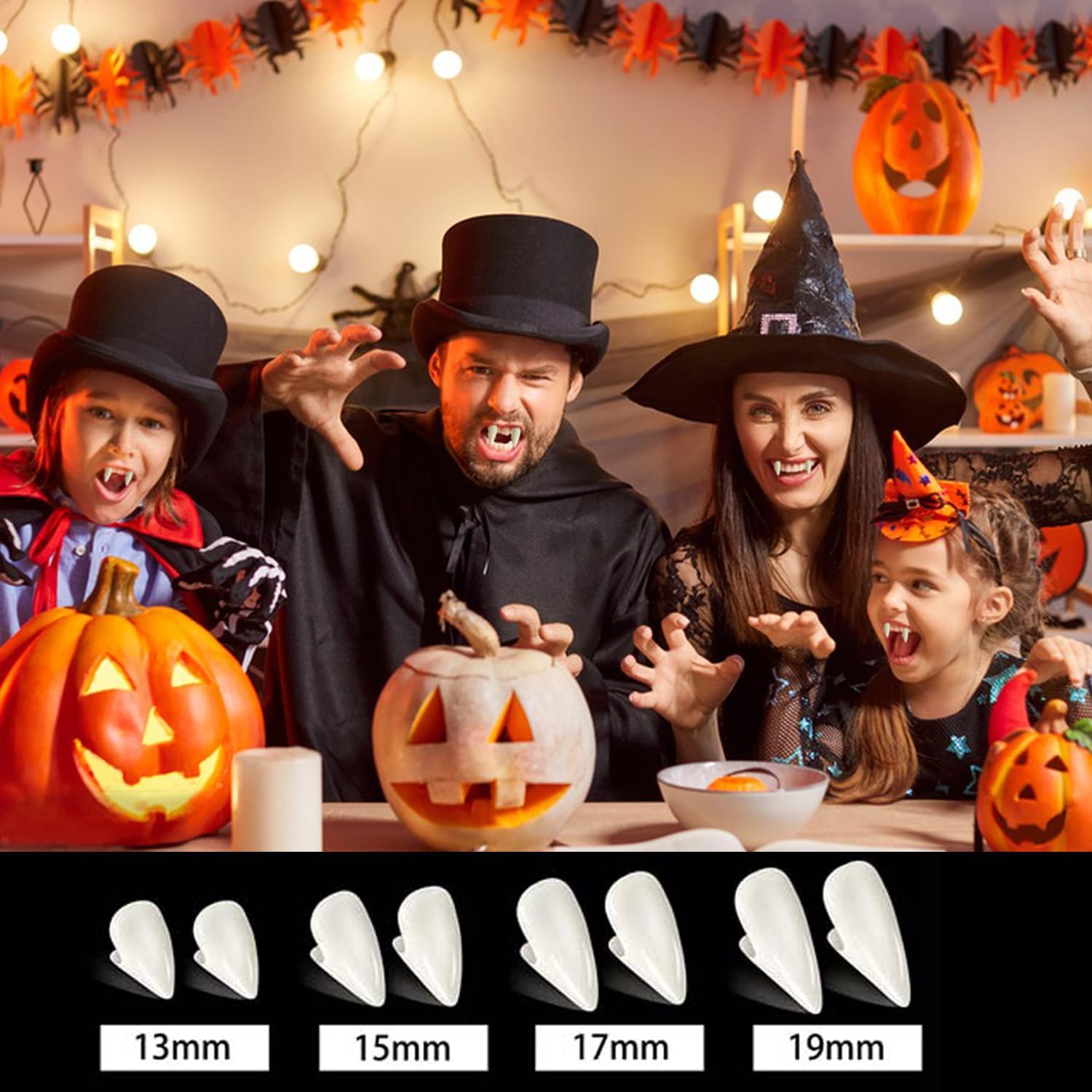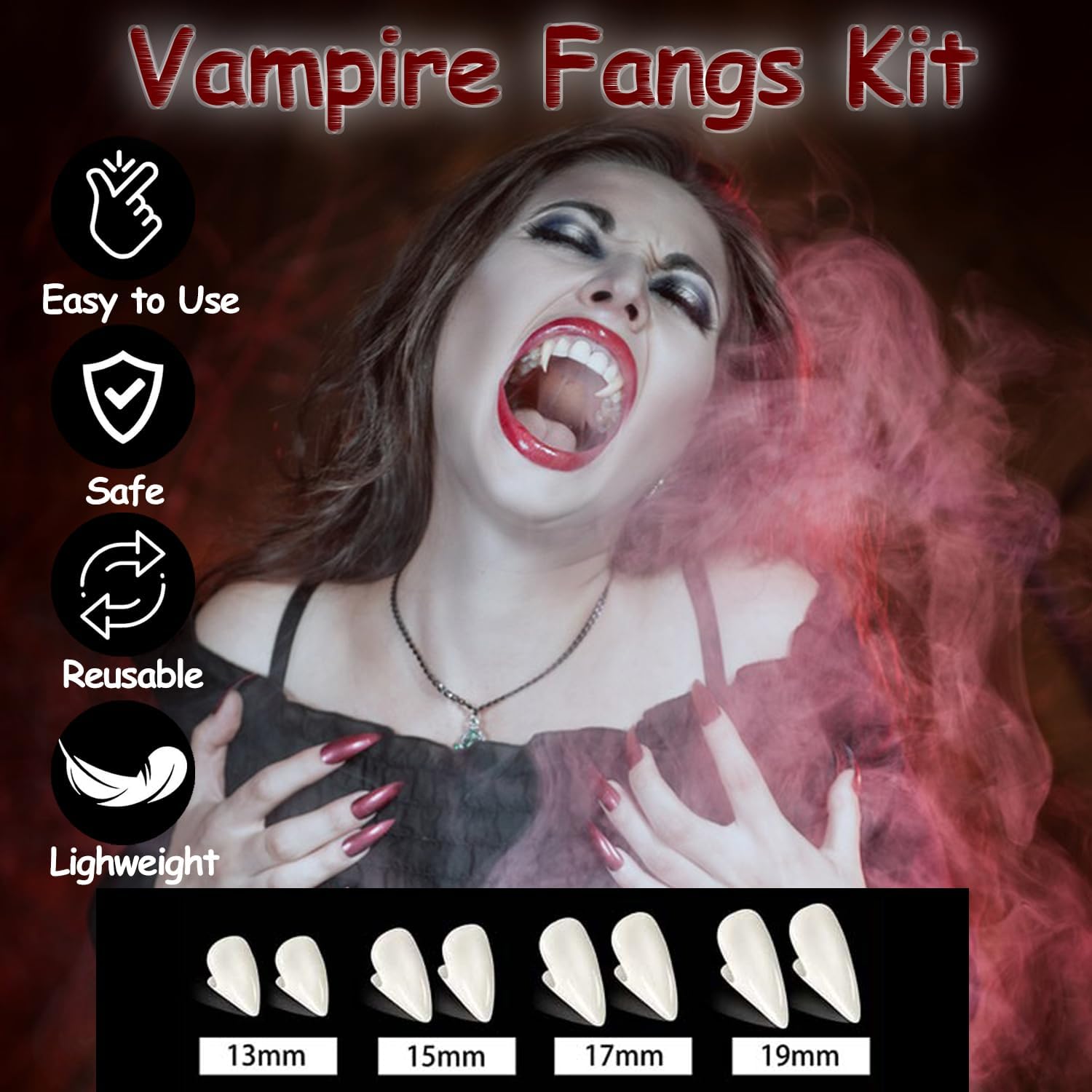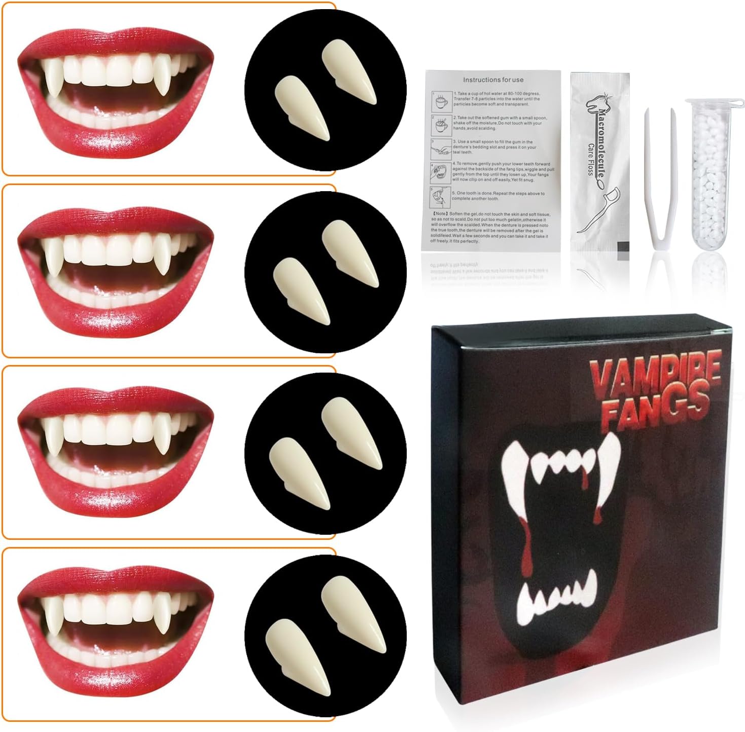 Materiale: questo kit di zanne da vampiro di Halloween è realizzato in resina sanitaria e di qualità con stampaggio a iniezione, sicuro sui denti e sembra realistico Zanne personalizzate di dimensioni opzionali: ci sono protesi da vampiro di 4 dimensioni in questo set di denti falsi horror, 13 mm, 15 mm, 17 mm, 19 mm, soddisfano le tue diverse esigenze cosplay Vivace e distintivo: queste protesi per denti da vampiro ti rendono il costume cosplay più realistico con i tuoi vestiti da vampiro, che possono portarti sentimenti diversi Comodo da usare con adesivo: riscaldare le perline adesive dei denti dal bianco al trasparente (l'acqua calda è ok), quindi raccoglierle e premere sui denti per fare uno stampo, quindi estrarre la zanna finta corretta e premerla sull'adesivo per un po '(le perline si raffreddano molto rapidamente, quindi è necessario maneggiarle rapidamente) Accessori perfetti per cosplay: le nostre zanne da vampiro sono ideali per qualsiasi cosplay, soprattutto feste in costume di Halloween, ti permettono di goderti il divertimento del cosplay. denti da vampiro per bambini perfetti per vampiri, lupi mannari, zombi e altri accessori per costumi cosplay Regali per costume di Halloween: ogni set è confezionato in una bella scatola, puoi regalarlo come regalo di Halloween ai tuoi bambini, familiari o amici