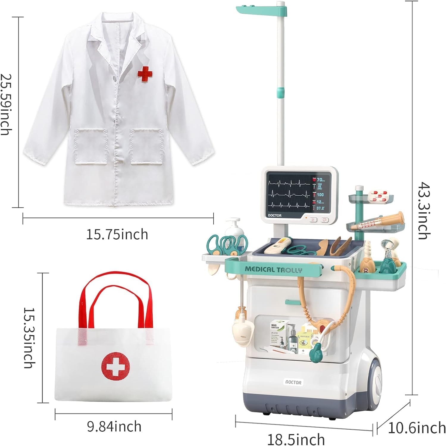 【Trasforma il tuo amato bambino in un piccolo dottore】Usa l'immaginazione e la creatività dei bambini per sperimentare il divertimento di diventare un medico. 【Carrello del dottore multifunzionale】I bambini possono eseguire "esami medici" per familiari o amici utilizzando un carrello medico con ruote. Il bancone e l'armadietto di grande capacità possono contenere tutti gli accessori. Insegna ai bambini a sviluppare buone abitudini di organizzazione mentre giocano e ad apprendere conoscenze di medicina e salute. 【Divertimento con strumenti medici completi】Il kit del carrello del dottore è dotato di siringa, stetoscopio, termometro, tabella per la vista, raggi X, ecc. Lo stetoscopio migliorato emette suoni di battito cardiaco realistici ed effetti luminosi. Viene fornito un'asta di misurazione telescopica gratuita per registrare l'altezza del bambino. Il camice da dottore e la borsa offrono un'esperienza più realistica per i bambini. 【Set di giocattoli sicuri e affidabili】Puoi usare con fiducia questo set da dottore sicuro e divertente. È realizzato in materiale ABS di alta qualità, senza BPA, senza odori e con una superficie liscia. 【Il regalo perfetto per i bambini】Questo set di giocattoli da dottore per bambini è raccomandato per i bambini di età compresa tra 3 e 8 anni. Possono imitare i dottori nel curare i pazienti. Perfetto per feste, giochi di finzione, giochi di ruolo, lezioni scolastiche, regali per le festività, regali di compleanno, ecc.