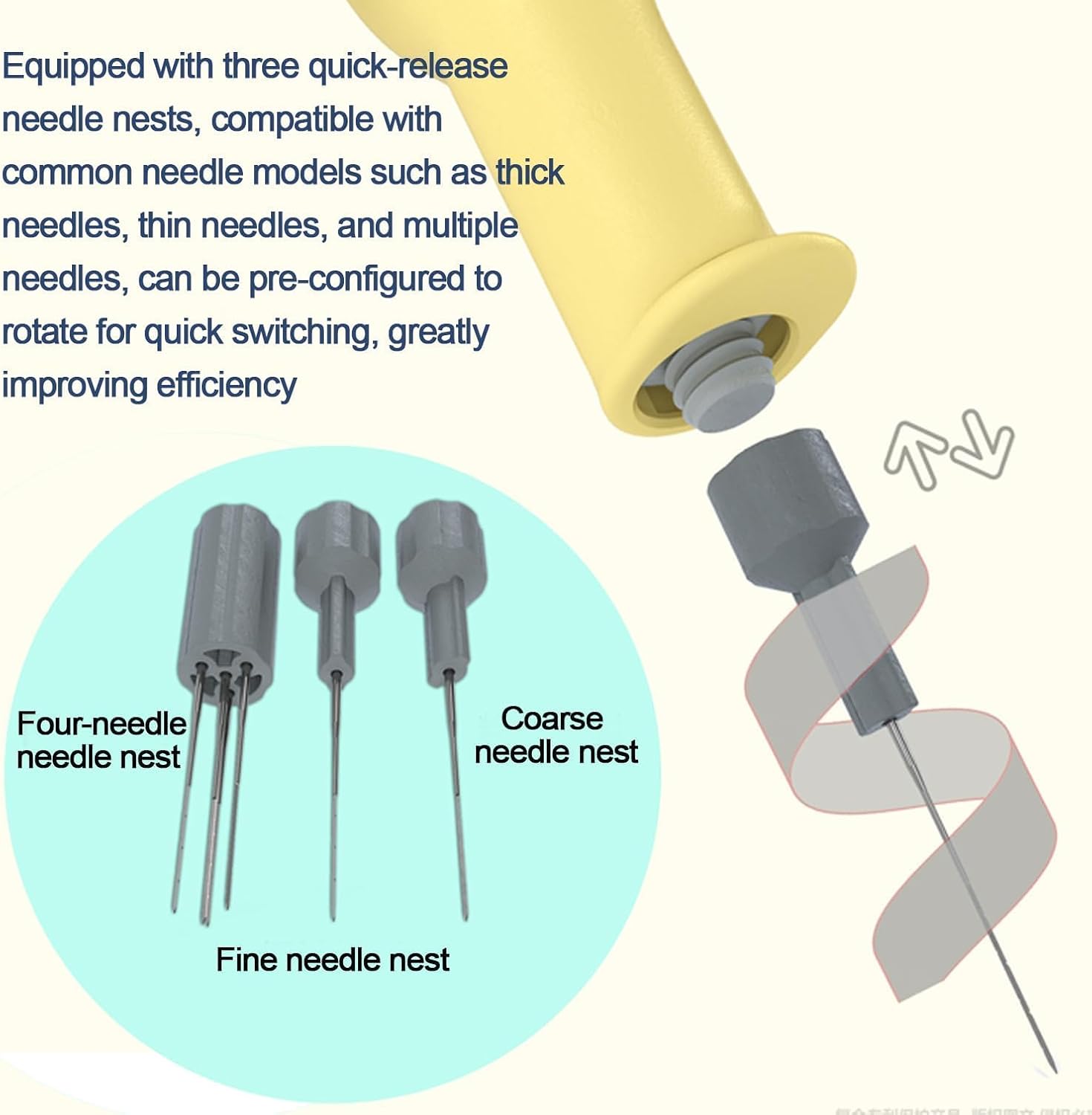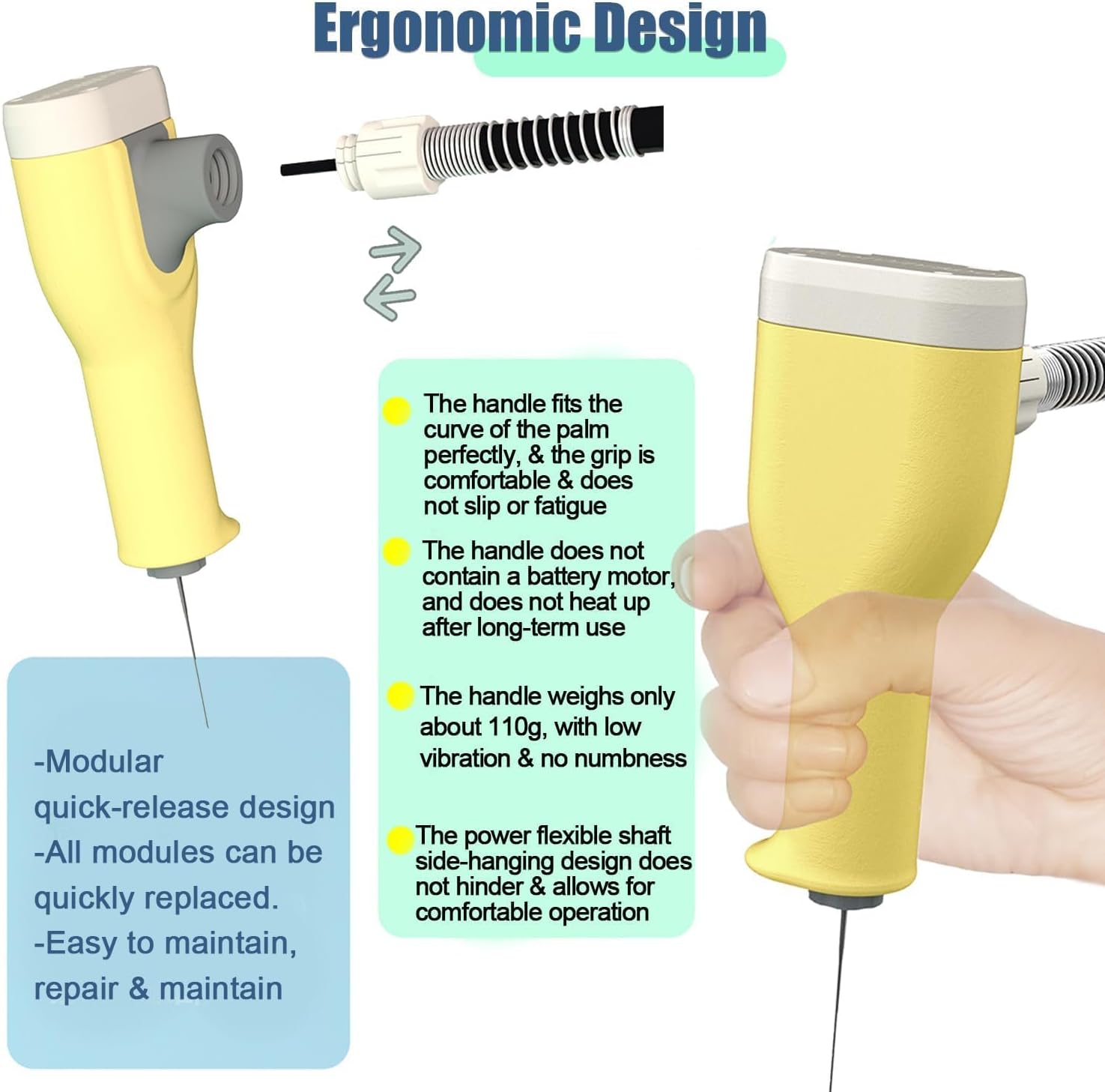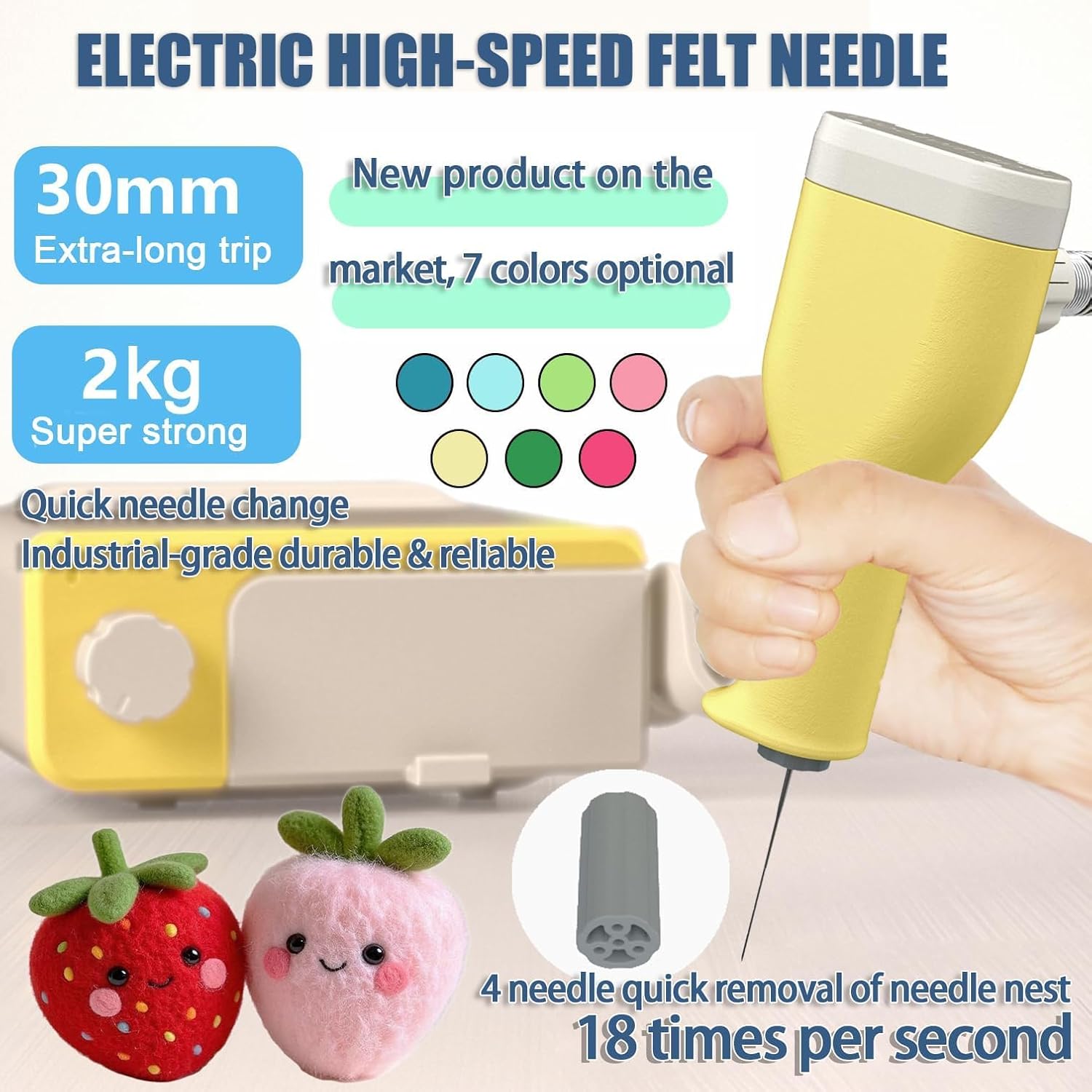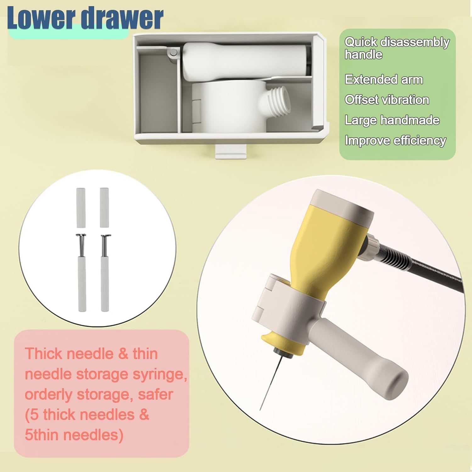 Durabilità di livello industriale: presenta un motore ad alta potenza, 10 cuscinetti ad alta precisione e molteplici protezioni elettriche per stabilità, affidabilità e uso a lungo termine sotto carichi elevati senza rompere gli aghi. Corsa ultra lunga da 30 mm: risolve il problema di non pugnalare in profondità con una corsa alternata di 30 mm e una forza di pugnalamento di 2 kg (20N Newton) per un lavoro efficiente. Funzionamento flessibile e preciso: la punta dell'ago è a soli 6 cm dal punto di presa per la precisione, con protezione anti-foratura e fori di ventilazione per sicurezza e comfort. Design ergonomico del manico: si adatta perfettamente alla curva del palmo, leggero a 110 g con vibrazioni minime, garantendo comfort e nessuna fatica durante l'uso a lungo termine. Contenitore organizzato con cassetto a doppio strato: lo strato superiore contiene protezioni ergonomiche e nidi per aghi; lo strato inferiore memorizza maniglie e aghi, migliorando l'efficienza e la sicurezza.