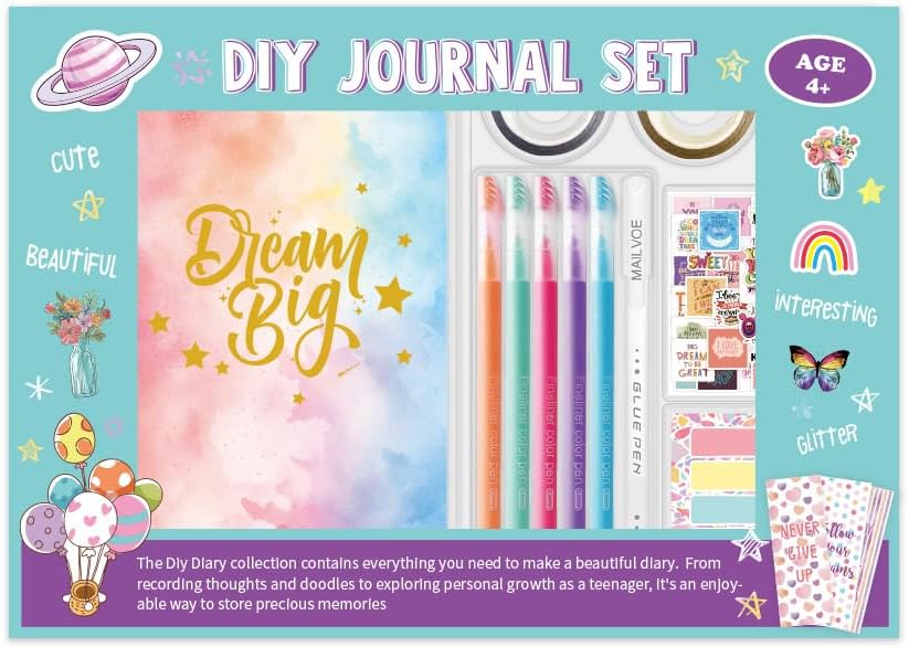 Confezione elegante e pratica: il set viene fornito in un'elegante scatola di cartone con una finestra trasparente, che rende facile visualizzare il contenuto senza aprirlo. Una bella confezione pronta da regalare, ideale per compleanni, Natale, vacanze e occasioni speciali. Materiali di alta qualità e sicuri: realizzati con carta di alta qualità, segnalibri in metallo e inchiostri atossici. La carta è spessa e resistente alle sbavature, garantendo un'esperienza di scrittura fluida con penne gel e pennarelli. Tutti i componenti sono sicuri per i bambini e costruiti per un uso regolare. Ideale per molteplici usi: ideale per diari quotidiani, scrapbooking, pianificazione dei compiti e artigianato decorativo. La varietà di adesivi, appunti, graffette e nastri washi consente infinite possibilità creative sia sulla carta che oltre. Educativo e divertente: incoraggia la creatività, le capacità motorie e le abitudini organizzative. Aiuta i bambini a documentare pensieri, sogni e attività quotidiane sviluppando la fiducia artistica. Combina divertimento e tempo creativo significativo. Set di diario creativo tutto in uno: questo kit completo di diario fai da te include 11 tipi di articoli di cancelleria decorativi e funzionali, 94 pezzi in totale. Perfetto per ragazze dai 4 anni in su per creare diari personalizzati, album di ritagli e album di memoria. Tutto ciò che serve per esprimere la propria creatività in un unico set.
