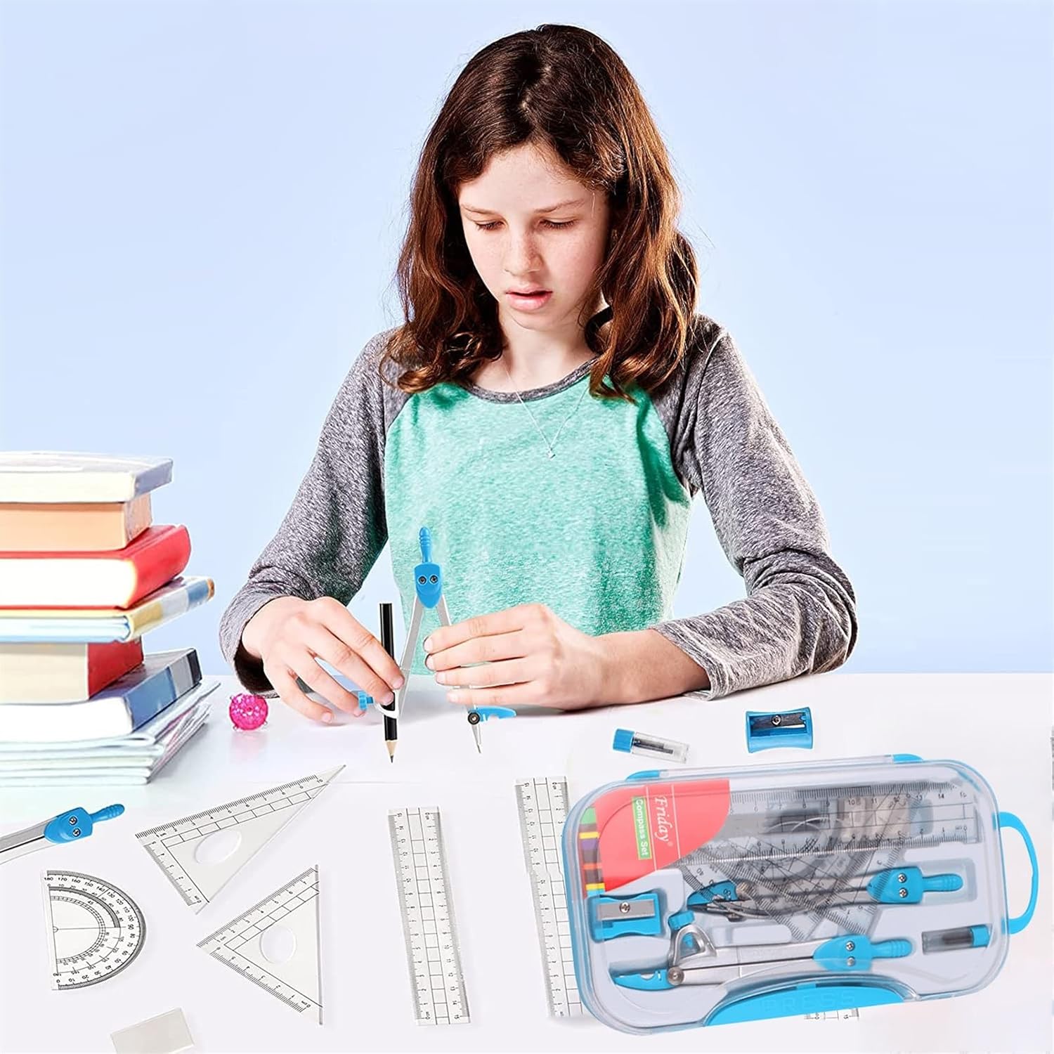 1. Versatile e universale: scala centimetrica precisa per la misurazione. Facile da usare per studenti di tutti i livelli, architetti, ingegneri, designer, artisti, insegnanti per disegnare, dipingere, disegnare progetti scolastici o d'ufficio. 2. Durevole e robusto: i compassi geometrici sono realizzati in metallo e gli strumenti geometrici sono realizzati in plastica di alta qualità, resistente e utilizzabile per anni. 3. Design ergonomico: migliora significativamente la sicurezza e il comfort dell'utilizzo delle bussole, che funzionano con matite e mine, garantendo che gli utenti completino compiti matematici o costruiscano piani con alta efficienza. 4. Portatile con scatola portaoggetti: confezionata in una custodia infrangibile, la cassetta degli attrezzi geometrica è facile da trasportare e da tenere al sicuro. Puoi facilmente mettere gli strumenti di misura in tasca e lo strumento ti tornerà utile ogni volta che ne avrai bisogno. 5. Contenuto della confezione: 10 strumenti: 2 bussole grafiche in metallo (1 bussola da studio e 1 bussola grafica Triangolo da 30-60-90 gradi, triangolo da 45-90-45 gradi, righello da 15 cm, goniometro da 180 gradi, matita da 8 cm, mina extra. Ricariche, gomma, temperamatite Adatto a insegnanti e studenti, il nostro set di bussole può disegnare qualsiasi forma geometrica.
