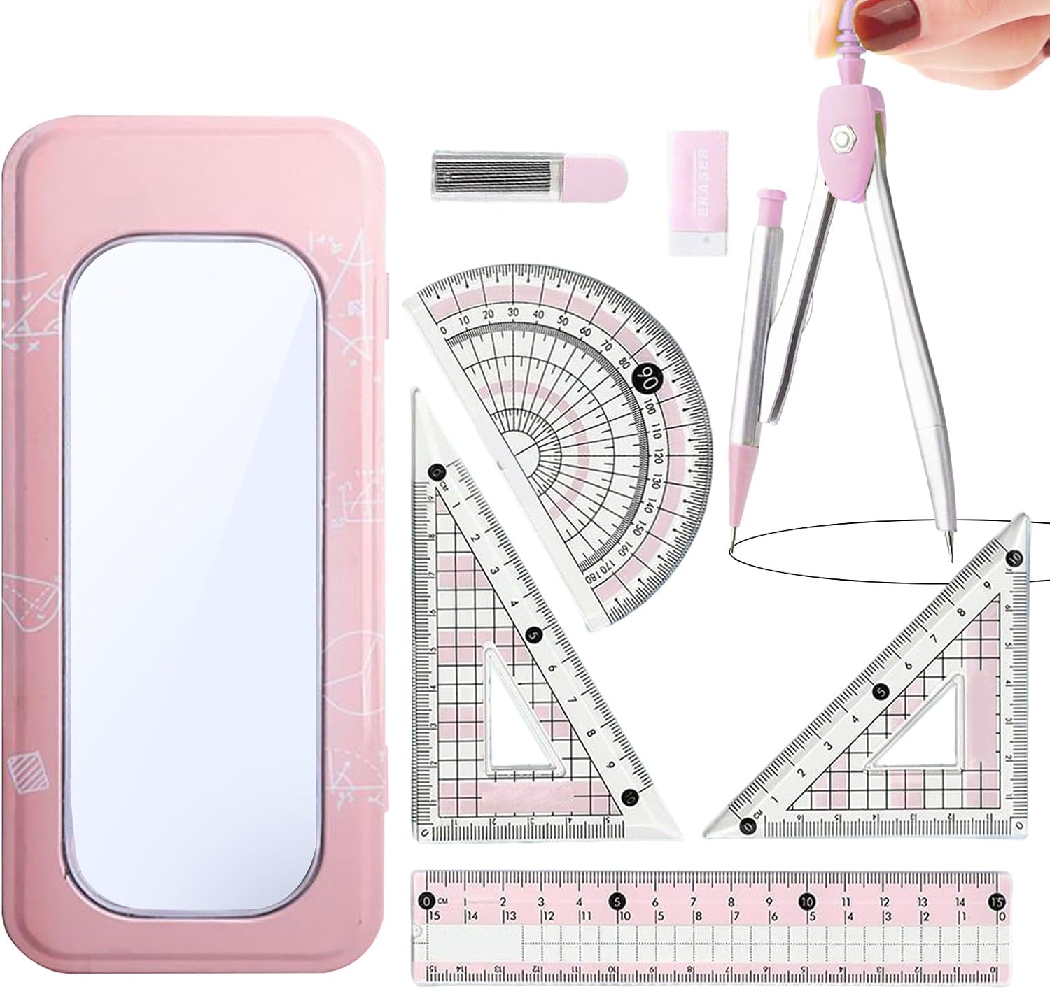 Compagno Affidabile in Matematica: Il set fornisce strumenti come uno e un goniometro progettati con marcature precise, soddisfacendo tutti i requisiti di base in geometria e consentendo agli studenti di utilizzarli durante gli esercizi di disegno in corso o in studio. Organizzazione efficiente degli strumenti: questo set di geometria ha un sistema di archiviazione ben progettato con scomparti designati per un set di 8 strumenti, mantenendo ogni articolo accuratamente organizzato e protetto contro la perdita, pur essendo compatto per una facile conservazione in borse o cassetti, offrendo così comodità per gli utenti impegnati in lavori di progettazione o attività in classe. Regalo ideale per studenti: questo set di geometrie offre una soluzione di cancelleria completa progettata per gli studenti dal 7 ° al terminale, con strumenti di precisione per i lavori di geometria. Il suo design accattivante lo rende uno strumento funzionale e un accessorio alla moda, perfetto per un regalo di rientro a scuola. Comfort visivo: questo necessario geometria con finitura antiriflesso e design ergonomico riduce l'affaticamento degli occhi, consentendo agli utenti di concentrarsi sui loro studi o progetti creativi senza interruzioni inutili grazie alla visibilità ottimale e al comfort di utilizzo prolungato Design creativo: l'astuccio geometrico combina motivi geometrici attraenti con un tema trasparente bicolore, realizzando un effetto alla moda e coinvolgente per gli adolescenti che desiderano personalizzare con eleganza le loro attrezzature scolastiche.