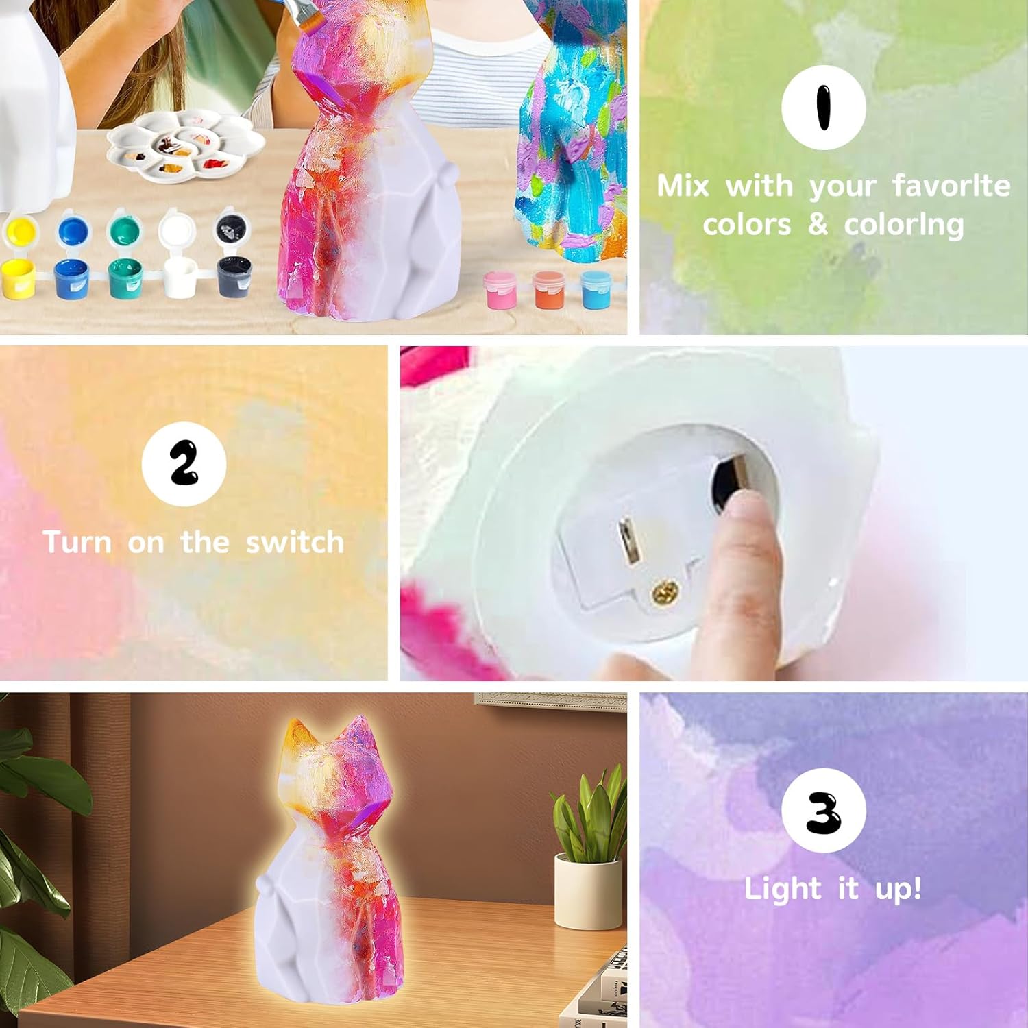 Scatena il divertimento creativo con il nostro kit "Dipingi la tua lampada a forma di gatto" Immergiti in un'esperienza creativa perfetta. Questo kit completo include 1 adorabile lampada a forma di gatto, 12 colori vivaci, una pratica tavolozza e 2 pennelli: tutto il necessario per ore di divertimento artistico. Ideale per bambini e adolescenti amanti dei lavoretti dai 4 ai 12 anni, è il progetto artistico e creativo per eccellenza. Le batterie sono incluse, quindi il divertimento inizia non appena il tuo capolavoro è completato. Impara giocando: kit artistico educativo e coinvolgente Unendo divertimento e sviluppo delle competenze, questo set creativo a forma di gatto migliora le capacità motorie fini, il riconoscimento dei colori e la concentrazione. Attraverso la pittura pratica, i bambini sviluppano pazienza e creatività, divertendosi con un'attività coinvolgente pensata per giovani artisti, particolarmente apprezzata dalle bambine dagli 8 ai 12 anni. Illumina il tuo spazio con decorazioni personalizzate Una volta dipinta, la lampada a forma di gatto diventa un'affascinante luce notturna o una decorazione per la stanza! Lascia che i bambini espongano con orgoglio le loro opere d'arte illuminando il loro spazio. Perfetto per ispirare la creatività e aggiungere un tocco personale a qualsiasi camera da letto o area gioco, ideale per gli appassionati di arti e mestieri dagli 8 ai 12 anni. Kit creativo sicuro, atossico e facile da pulire Realizzato pensando alla sicurezza dei bambini, questo kit di pittura è dotato di colori atossici e lavabili e di un design intuitivo. La lampada a forma di gatto dalla forma speciale rende la pittura divertente e accessibile, perfetta per i bambini amanti dei gatti che amano i lavoretti manuali. Goditi la tranquillità mentre creano. Il regalo perfetto per gli amanti dei gatti e gli appassionati di artigianato Che sia per Natale, compleanni, Pasqua o semplicemente per un regalo, questa lampada a gatto personalizzabile è un regalo memorabile e sentito. Adatto a tutte le età, è un modo meraviglioso per celebrare gli amanti dei gatti e gli appassionati di arti e mestieri. Un regalo unico e personalizzato che sicuramente delizierà.