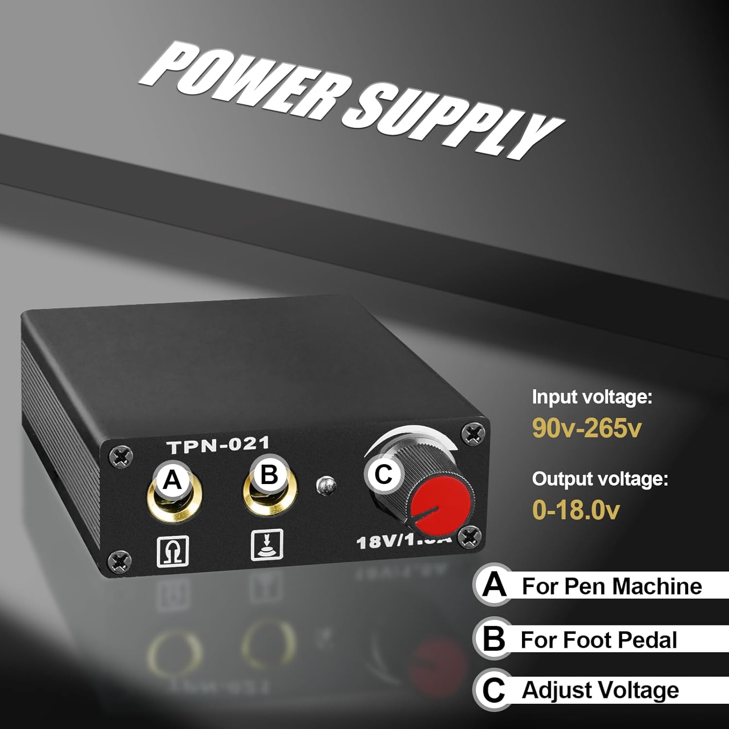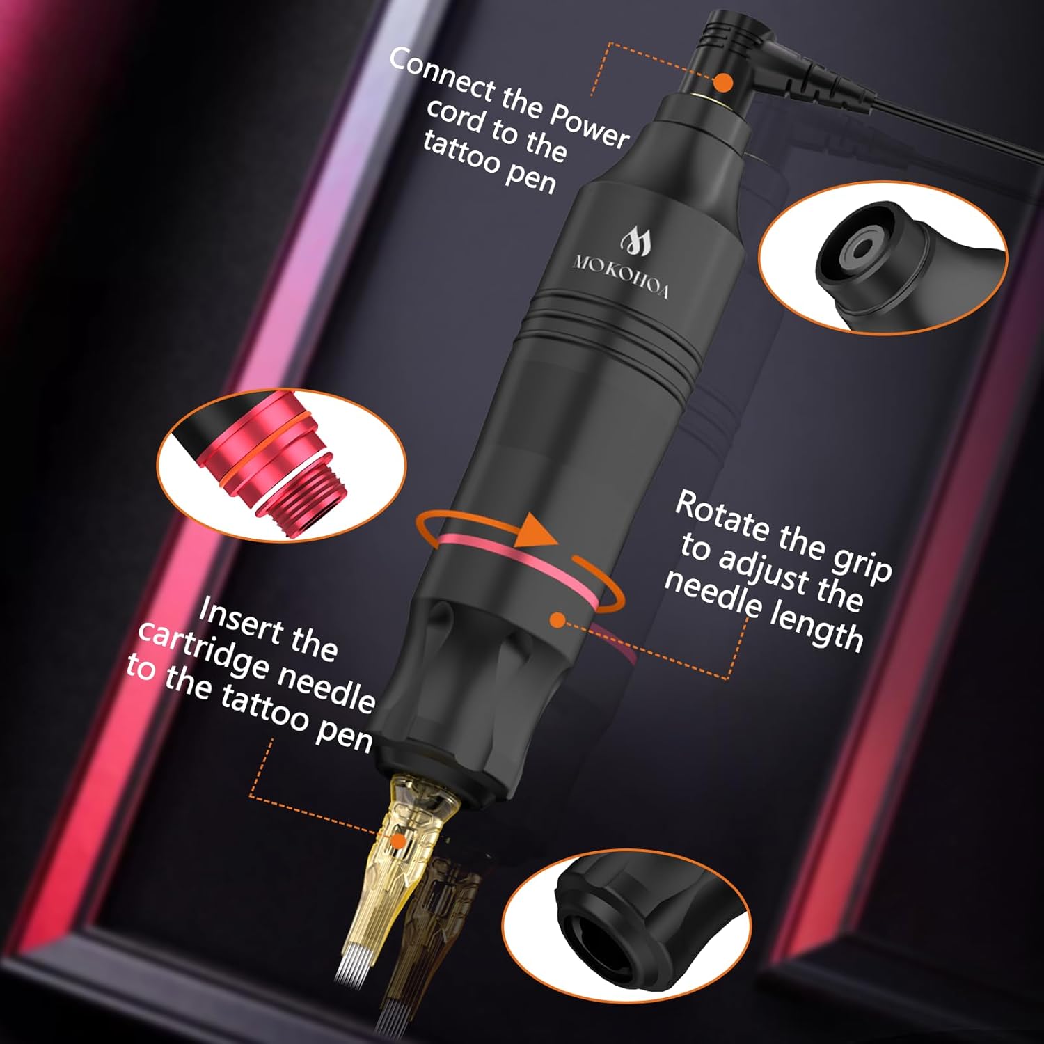Motore coreless ad alte prestazioni: la penna per tatuaggio rotativa cordless MOKOHOA è alimentata da un motore coreless su misura, che raggiunge fino a 9000 giri al minuto a 10 V. Offre prestazioni elevate con traumi cutanei minimi, rapido assorbimento dell'inchiostro e funzionamento coerente senza surriscaldamento, anche durante lunghe sessioni. Il suo sistema Direct Drive garantisce una potenza stabile, che lo rende adatto sia per la copertura che per l'ombreggiamento. Costruzione premium e design ergonomico: realizzata in lega di alluminio lavorata a CNC, questa penna per tatuaggi è leggera, resistente e bilanciata con precisione. Con una lunghezza di 148 mm e un peso di 210 g, offre maneggevolezza e controllo eccellenti. La struttura completamente smontabile rende la pulizia, la manutenzione e la sostituzione delle parti semplice ed efficiente. Kit completo da principiante a professionista: questo kit per tatuaggi all-in-one include tutto ciò di cui hai bisogno: 1 penna per tatuaggi, 1 cavo RCA, 1 interruttore a pedale wireless, 6 cartucce per aghi, 1 foglio di carta trasferibile, 1 paio di guanti, 1 pelle pratica, 1 copertura dell'impugnatura, 3 inchiostri per tatuaggi e 20 vasetti per inchiostro. Ideale per principianti e artisti esperti. Compatibilità e versatilità universali: con la profondità dell'ago regolabile (0-4 mm) e la corsa di 4 mm, questa penna si adatta a diversi stili e tecniche di tatuaggio. Compatibile con tutti i tipi di aghi a cartuccia, può essere utilizzato anche per applicazioni di trucco permanente come sopracciglia, eyeliner e labbra. Alimentatore intelligente a doppio controllo: l'alimentatore a doppio controllo incluso è costruito con tecnologia avanzata per una maggiore affidabilità. Dispone di uno spegnimento automatico di sicurezza per prevenire danni durante le fluttuazioni di tensione. Per prestazioni ottimali, funziona tra 4 e 8 V.