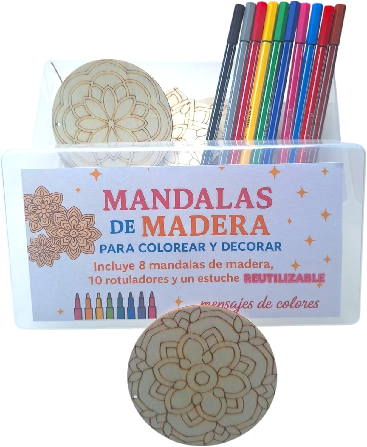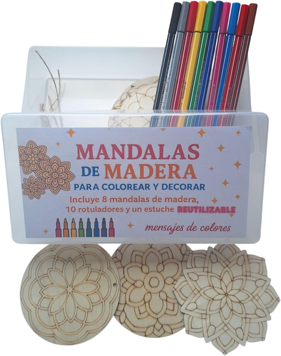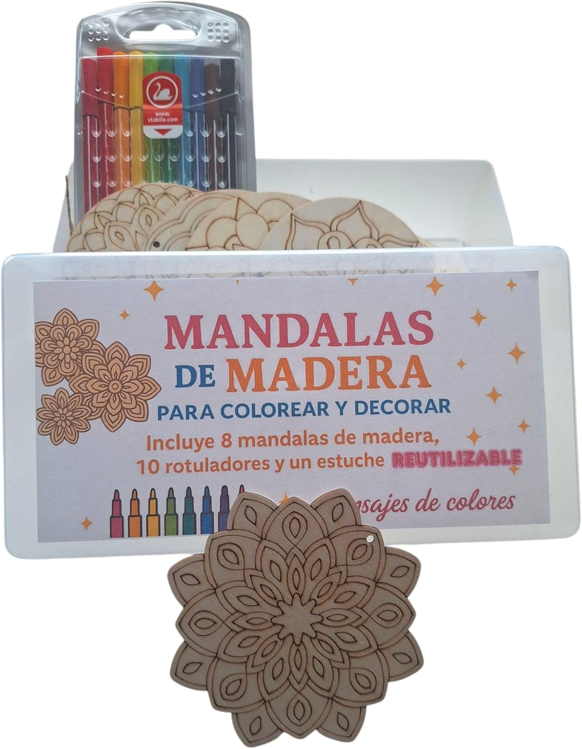 Contenuto del kit: include 8 mandala in legno da colorare, 10 pennarelli colorati e una custodia riutilizzabile per riporre oggetti MANDALE IN LEGNO DA COLORARE – 8 disegni di mandala in legno pronti per essere dipinti con pennarelli inclusi. VERSATILITÀ: REGALO ORIGINALE DIY - Un dettaglio ideale per compleanni, Natale o come attività educativa familiare. Organizzazione: scatola robusta e riutilizzabile – ideale per conservare i mandala finiti, i pennarelli o riutilizzare come confezione regalo. ATTIVITÀ CREATIVA: ideale per sviluppare abilità artistiche, ridurre lo stress e godersi momenti di relax