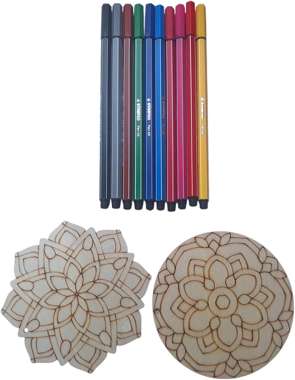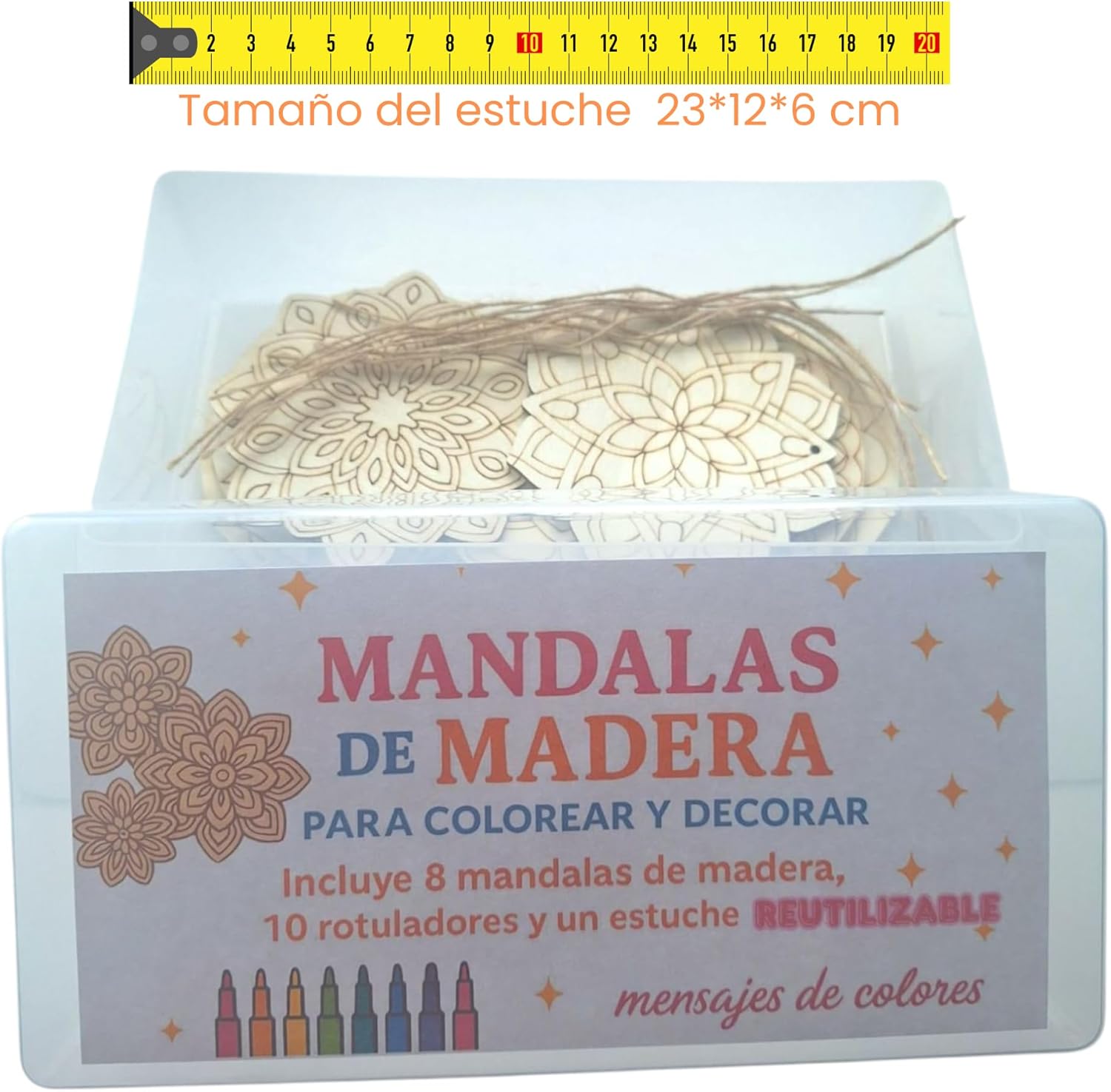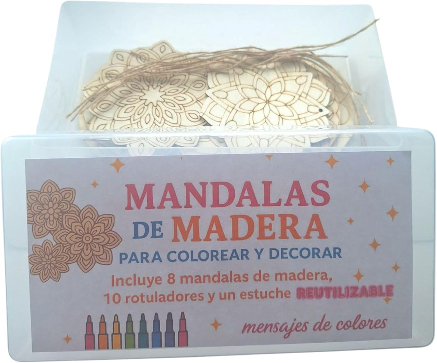 Contenuto del kit: include 8 mandala in legno da colorare, 10 pennarelli colorati e una custodia riutilizzabile per riporre oggetti MANDALE IN LEGNO DA COLORARE – 8 disegni di mandala in legno pronti per essere dipinti con pennarelli inclusi. VERSATILITÀ: REGALO ORIGINALE DIY - Un dettaglio ideale per compleanni, Natale o come attività educativa familiare. Organizzazione: scatola robusta e riutilizzabile – ideale per conservare i mandala finiti, i pennarelli o riutilizzare come confezione regalo. ATTIVITÀ CREATIVA: ideale per sviluppare abilità artistiche, ridurre lo stress e godersi momenti di relax