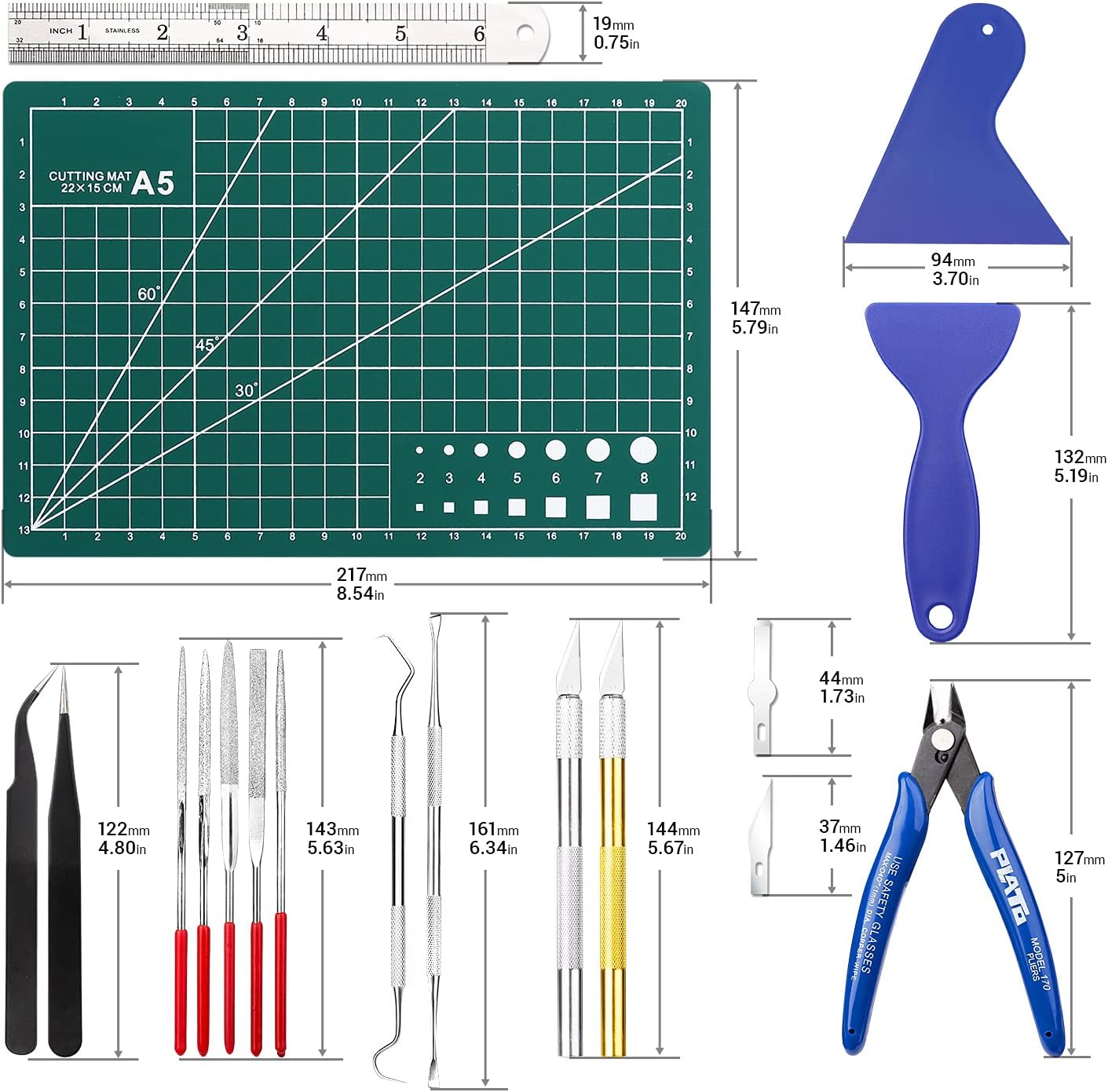 【Strumenti per modellismo】Il set di strumenti di base per il modellismo è adatto sia ai principianti che agli appassionati di modellismo professionisti. È possibile utilizzarlo per realizzare giocattoli, automobili, robot, edifici, personaggi dei cartoni animati e altri oggetti artigianali. 【Qualità eccellente】Il set di strumenti è realizzato in acciaio inossidabile di alta qualità, resistente alla ruggine e alla corrosione, robusto e durevole. Grazie alle diverse pinze e ganci, è possibile rimuovere facilmente gli adesivi ed effettuare piccole riparazioni senza danneggiare il modello. 【Leggero e portatile】 Gli strumenti per modellismo sono leggeri e portatili. Sono facili da usare e da trasportare, consentendo di scolpire le proprie opere ovunque e in qualsiasi momento. Non vediamo l'ora di ammirare i vostri capolavori. 【Il set completo include】 1×tappetino da taglio A5, 1×righello da 15 cm, 2×lame di precisione (argento e oro) + 5×lame n. 11 + 5×lame n. 17 + 1×pinza laterale, 1 pinza ESD-10, 1 pinza ESD-15, 2 raschietti blu, 5 lime di diversi tipi e 2 modelli di forme diverse. 【Regalo perfetto】 Se avete amici appassionati di anime, cartoni animati e modellismo, o principianti del modellismo, potete regalare questo set di strumenti per modellismo ai vostri amici o utilizzarlo per creare un regalo personalizzato per i vostri cari.