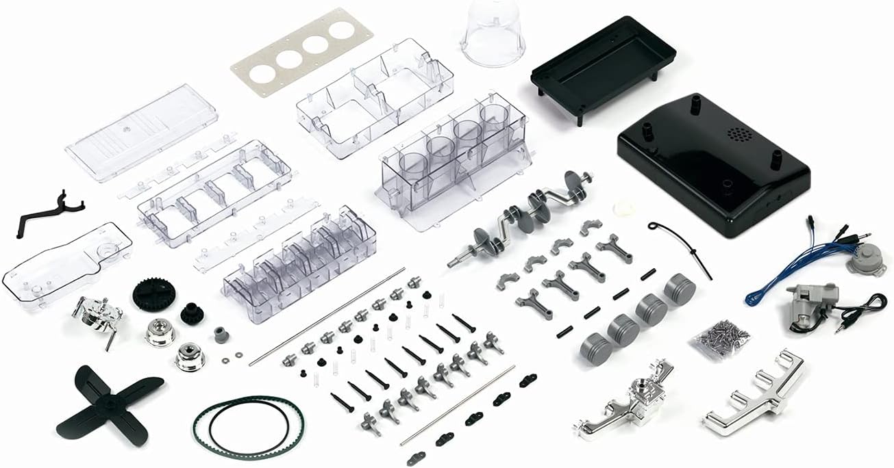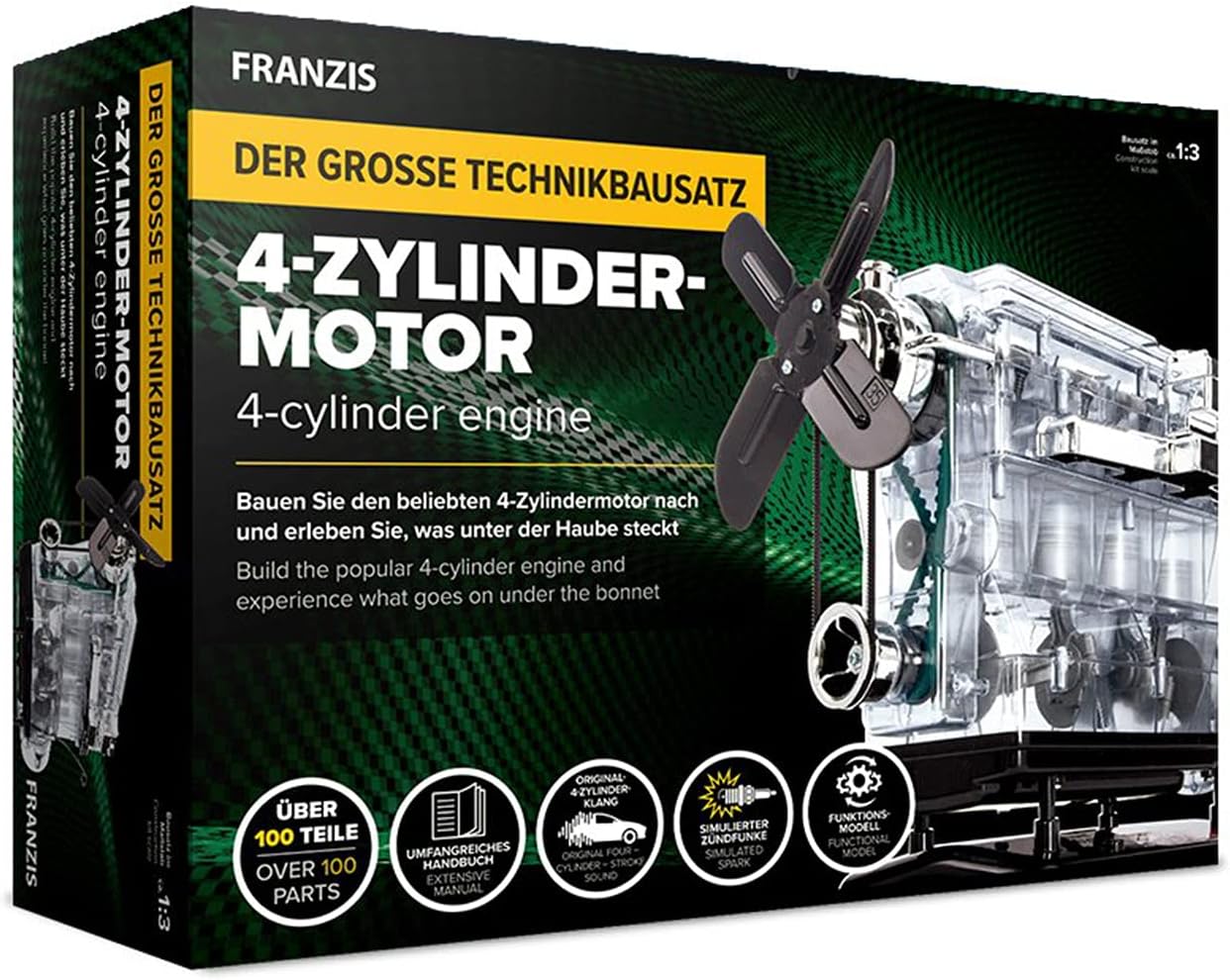 DETTAGLI - Kit da 100 pezzi, modello funzionale trasparente, scala: 1:3, suono originale del motore, incluso manuale di 86 pagine con istruzioni dettagliate per la costruzione passo dopo passo e fatti interessanti sulla storia dello sviluppo del motore a combustione. Sono inoltre necessarie: 2 batterie da 1,5 V (AA) - non incluse. I componenti possono essere facilmente collegati e avvitati insieme, senza colla. Consigliato dai 14 anni in su. DIMENSIONI - Dimensioni del motore: 27,5 x 13,5 x 22,5 cm, dimensioni dell'imballaggio: 44,5 x 32,5 x 12,5 cm. Esplora cosa c'è sotto il cofano della tua auto! Con questo pacchetto, costruisci un modello trasparente e perfettamente funzionante di un motore a 4 cilindri (scala 1:3) da 100 parti in circa 3 ore. Divertimento tecnologico per te e la tua famiglia. Un manuale riccamente illustrato non lascia domande senza risposta sui motori a combustione e sui loro possibili utilizzi. Tutte le parti si muovono come il modello più grande: pistoni, albero motore, albero a camme, valvole, distributore di accensione. Anche la scintilla di accensione è simulata. Con modulo sonoro.