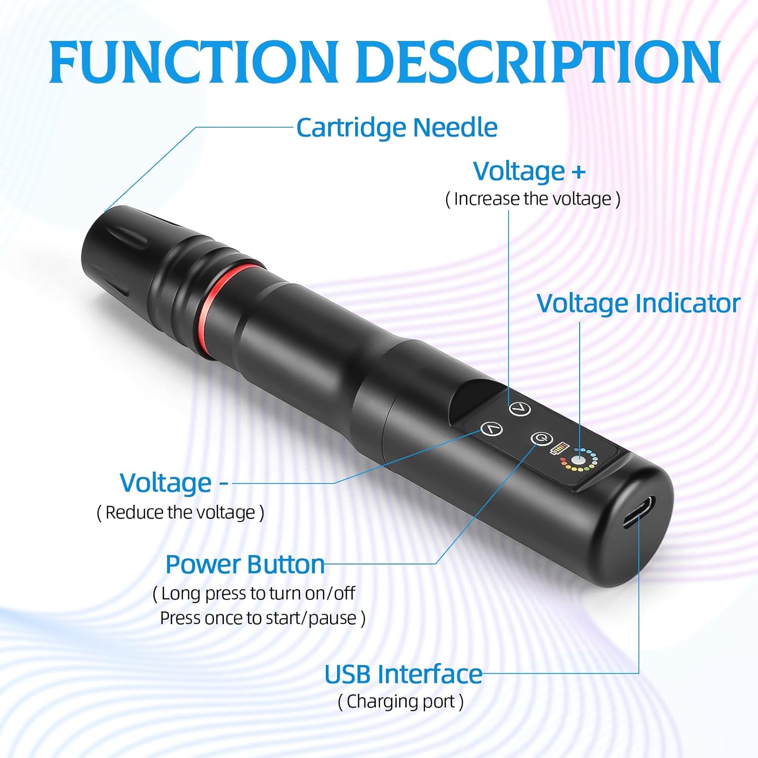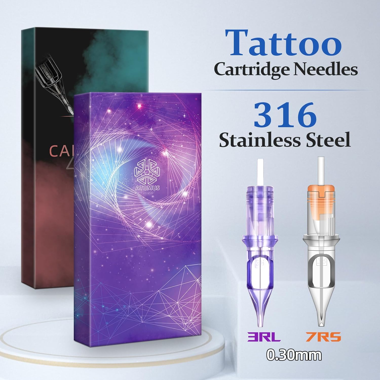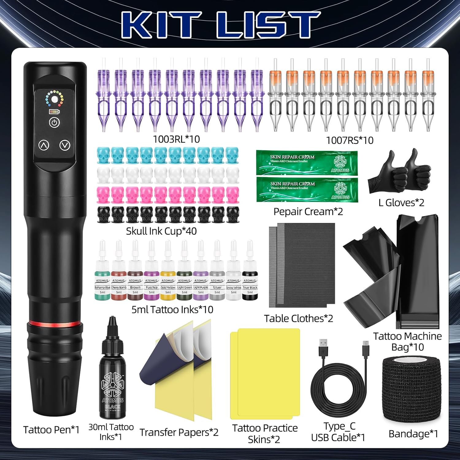 Il kit penna per tatuaggio ATOMUS include 1 penna rotativa per tatuaggio, 10 aghi per tatuaggio 3RL, 10 aghi per tatuaggio 7RS, 1 benda, 1 pigmento da 30 ml, 2 pelli per pratica del tatuaggio da 2 mm, 2 pezzi di carta per trasferimento del tatuaggio, 2 pezzi di crema post-trattamento per tatuaggi, 10 pezzi di pigmento per tatuaggi da 5 ml, 1 set di guanti, 40 tazze di inchiostro per tatuaggi, 2 tovaglie, 10 borse per macchinette per tatuaggi autosigillanti. 【Penna per tatuaggi】 La penna per tatuaggi è realizzata in lega di alluminio, silenziosa, unibody, facile e portatile da usare, uso prolungato senza calore. Velocità: 8-9 V 9000-11000 giri/min, potente, può essere utilizzata per ombreggiature e rivestimenti. Collegato tramite linea Type-C, 2000 mAh, che può funzionare circa 4 ore quando si lavora a 4,5 V, richiede solo 1,5-2 ore per la ricarica. corsa: 3 mm, profondità dell'ago regolabile da 0-4 mm. Manicotto per penna per tatuaggio autosigillante Progettato per macchinette per tatuaggi a penna, innovativo design sigillante autoadesivo. Può essere facilmente sigillato con un unico bastoncino, prevenendo efficacemente gli schizzi di inchiostro e l'accumulo di polvere durante il funzionamento, mantenendo l'attrezzatura sempre pulita e nuova. Dimensioni 6,4 cm × 22 cm, adatto alla maggior parte dei dispositivi. Aghi per cartucce per tatuaggio Due tipi: aghi 10 pezzi 3RL e 10 pezzi 7RS. Filo dell'ago da 0,3 mm, adatto per tatuaggi e tatuaggi per sopracciglia. Realizzato in acciaio inossidabile di grado 316, resistente con cui lavorare. L'ago cattura più inchiostro e i tubi traslucidi ti consentono di godere di una migliore visibilità dell'ago. 【Tazza per inchiostro per tatuaggi】 Stile unico, fondo stabile, non facilmente inclinabile durante il tatuaggio. 4 colori disponibili in totale: 40 pezzi, ti aiutano facilmente a mantenere gli inchiostri durante il lavoro del tatuaggio.
