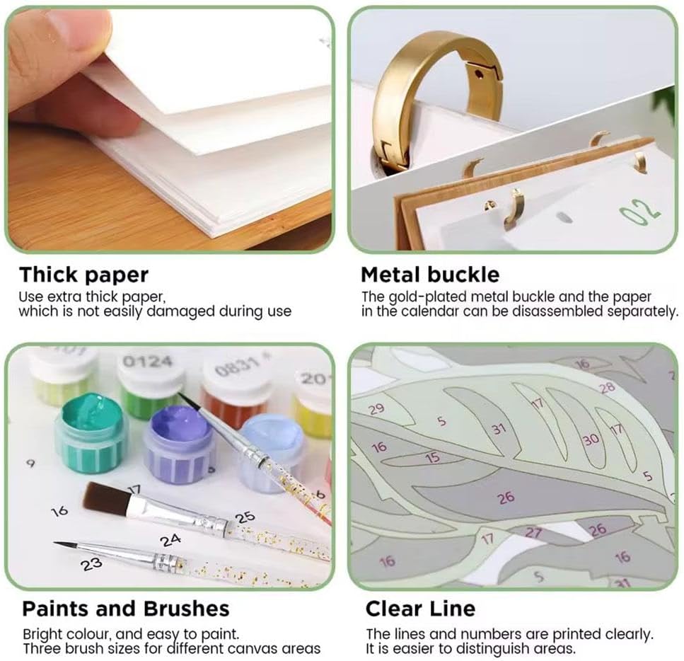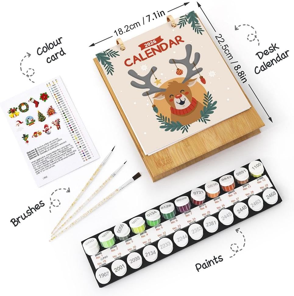 Calendario da tavolo creativo 2026 con divertimento artistico: combina praticità e creatività! Questo calendario da scrivania 2026 presenta un design unico con numeri sul retro di ogni mese, perfetto per gli amanti della pittura digitale e del fai da te. Set di pittura all-inclusive: ottieni tutto ciò di cui hai bisogno in una scatola: modelli prestampati, colori vivaci, tre pennelli e una guida ai colori numerata. La carta spessa da 600 g (18 x 22,4 cm) impedisce lo spargimento per risultati. Regalo premuroso per gli appassionati di arte: ideale per compleanni, Natale o Capodanno! Ispira la creatività con un regalo che continua a dare: ogni mese offre una nuova sfida artistica da godere tutto l'anno. Perfetto per principianti ed esperti: che tu sia un artista esperto o solo agli inizi, la guida numerica facile da seguire aiuta chiunque a creare opere d'arte straordinarie rimanendo organizzato con un calendario funzionale. Elevare qualsiasi spazio: progettato per uso domestico, ufficio o studio, questo calendario funge anche da decorazione. Mostra la tua arte tenendo traccia delle date: una miscela perfetta di funzionalità ed espressione di sé.
