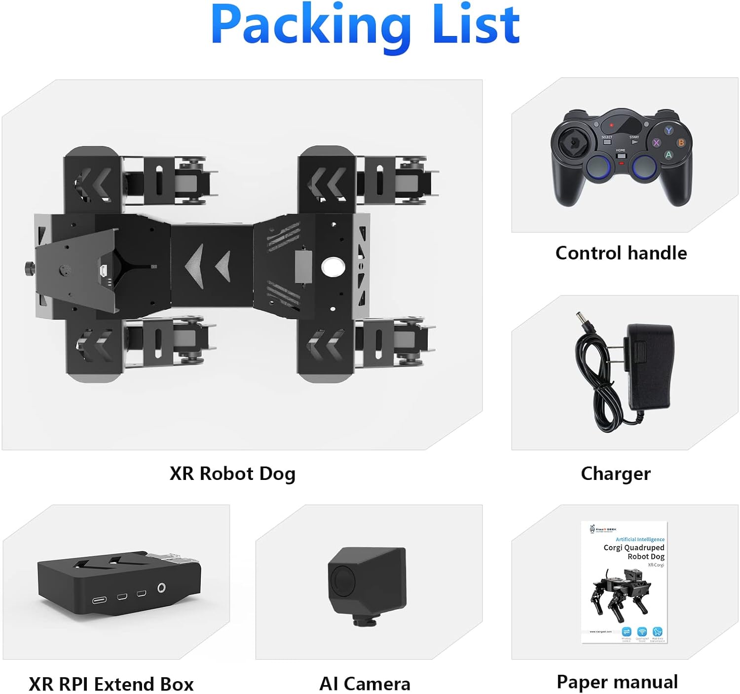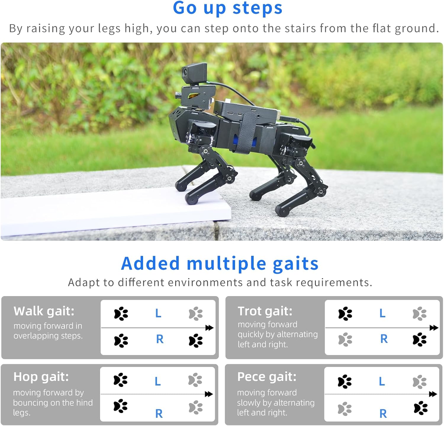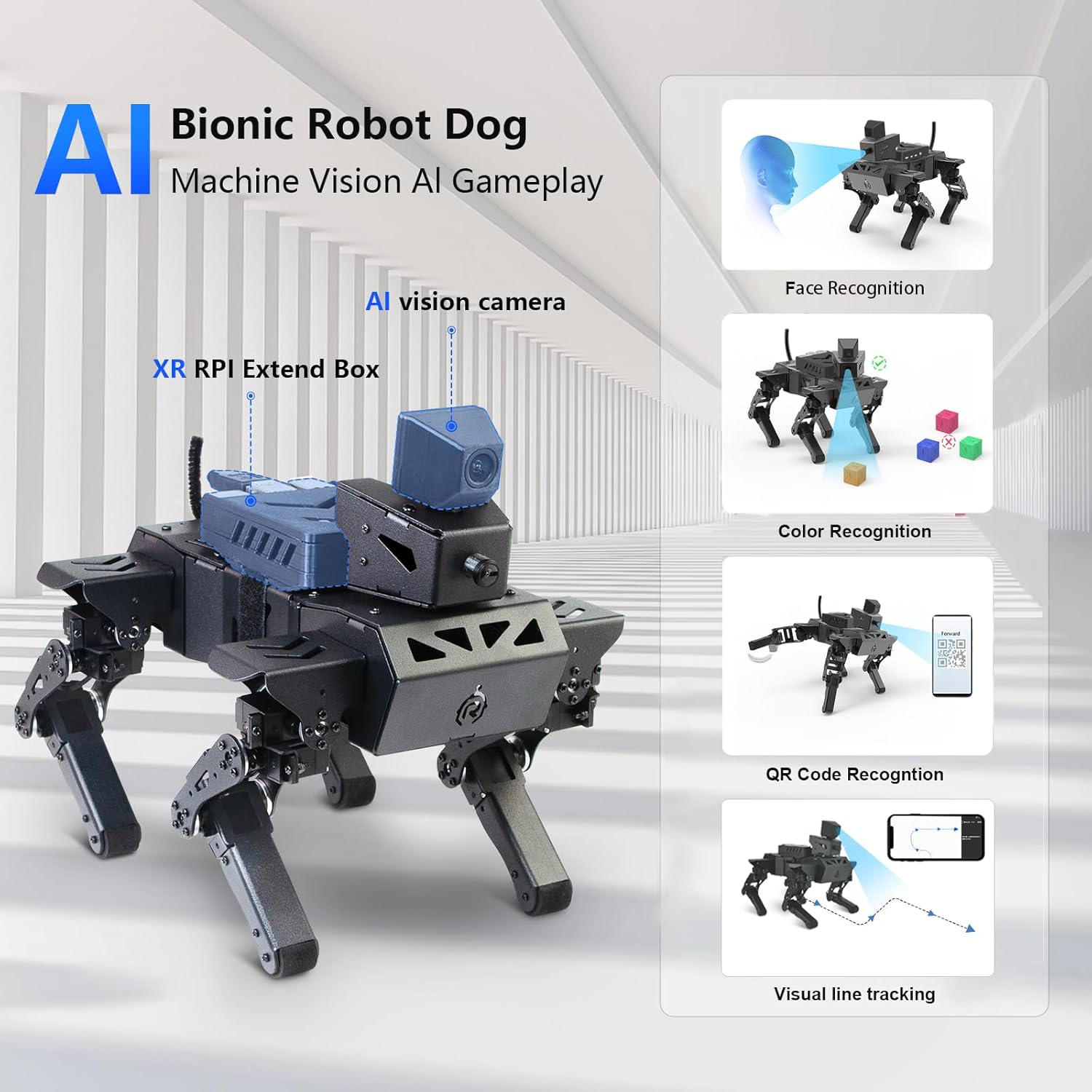 Nota: 1 Raspberry Pi inclusa; 1 scheda TF, 1 fotocamera AI, 1 batteria necessaria. Le nuove funzioni includono il controllo dell'altezza, la scalata e l'andatura multipla Pace per adattarsi meglio ai diversi ambienti e requisiti di attività. Cane da compagnia meccanico AI: il cane robot AI Advanced XR utilizza Raspberry Pi come controllo principale e ESP32 come coprocessore. Oltre a oltre 18 tipi di posture e azioni bioniche, può anche realizzare funzioni visive AI come il riconoscimento del viso, del codice QR e del colore, con movimenti flessibili e fluidi e forte potenza. Puoi anche programmare per creare il tuo cane meccanico per animali domestici. Kit elettronico preinstallato: dopo che il cane robot è fuori dalla scatola, basta installare il Raspberry Pi e la fotocamera, è possibile controllare facilmente il robot da remoto tramite l'esclusiva APP Android/IOS, visualizzare ciò che il robot vede attraverso il feedback dell'immagine FPV e interagire con XR DOG in tempo reale. Gli utenti possono anche utilizzare la maniglia del telecomando inclusa nel kit per il controllo. Visione intelligente: XR DOG è dotato di un sistema di IA visiva open source con OpenCV integrato, che può realizzare funzioni di visione AI come il riconoscimento visivo di volti, colori e codici QR. Supporta i computer per scrivere cani robot in Python e gli utenti con conoscenze di base del linguaggio Python possono facilmente iniziare con lo sviluppo secondario delle funzioni IA del robot. 12DOF ad alto livello Bionic: ogni gamba del cane robot è controllata da 3 servi bus, che possono essere confrontati con 3 articolazioni del gomito, della spalla e dell'anca per ripristinare accuratamente i dettagli dell'azione. Basato sulla cinematica inversa, può camminare in avanti, indietro, sinistra e destra e in tutte le direzioni e completare in modo flessibile una varietà di azioni di postura bionica.
