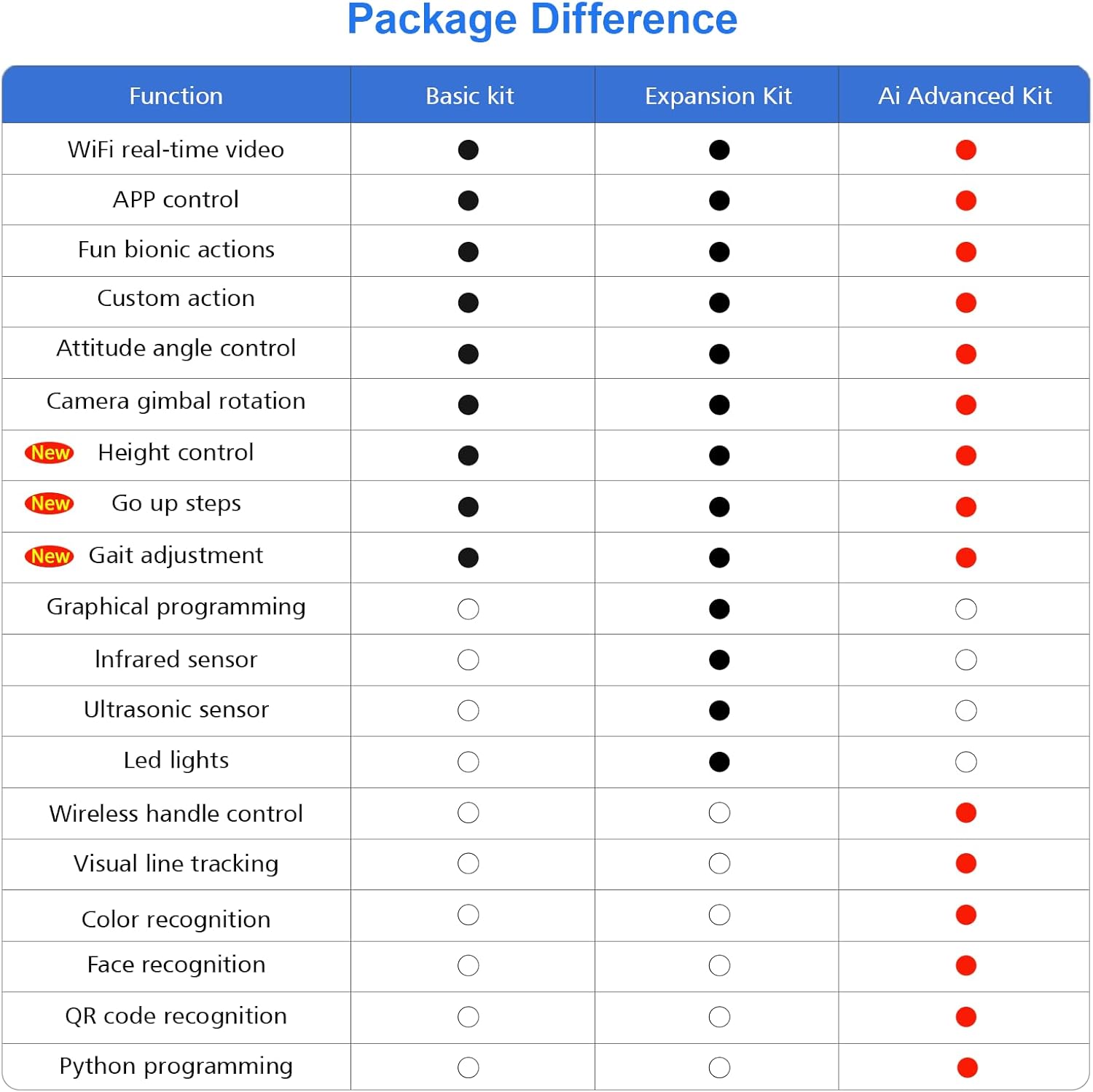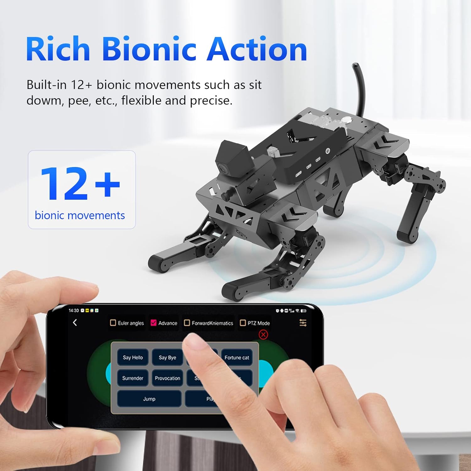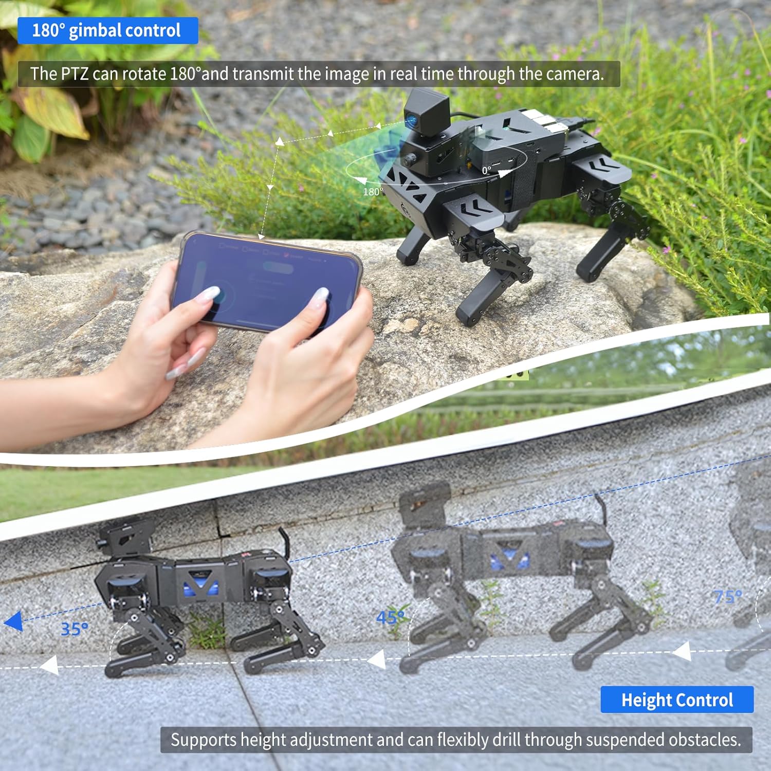 Nota: 1 Raspberry Pi inclusa; 1 scheda TF, 1 fotocamera AI, 1 batteria necessaria. Le nuove funzioni includono il controllo dell'altezza, la scalata e l'andatura multipla Pace per adattarsi meglio ai diversi ambienti e requisiti di attività. Cane da compagnia meccanico AI: il cane robot AI Advanced XR utilizza Raspberry Pi come controllo principale e ESP32 come coprocessore. Oltre a oltre 18 tipi di posture e azioni bioniche, può anche realizzare funzioni visive AI come il riconoscimento del viso, del codice QR e del colore, con movimenti flessibili e fluidi e forte potenza. Puoi anche programmare per creare il tuo cane meccanico per animali domestici. Kit elettronico preinstallato: dopo che il cane robot è fuori dalla scatola, basta installare il Raspberry Pi e la fotocamera, è possibile controllare facilmente il robot da remoto tramite l'esclusiva APP Android/IOS, visualizzare ciò che il robot vede attraverso il feedback dell'immagine FPV e interagire con XR DOG in tempo reale. Gli utenti possono anche utilizzare la maniglia del telecomando inclusa nel kit per il controllo. Visione intelligente: XR DOG è dotato di un sistema di IA visiva open source con OpenCV integrato, che può realizzare funzioni di visione AI come il riconoscimento visivo di volti, colori e codici QR. Supporta i computer per scrivere cani robot in Python e gli utenti con conoscenze di base del linguaggio Python possono facilmente iniziare con lo sviluppo secondario delle funzioni IA del robot. 12DOF ad alto livello Bionic: ogni gamba del cane robot è controllata da 3 servi bus, che possono essere confrontati con 3 articolazioni del gomito, della spalla e dell'anca per ripristinare accuratamente i dettagli dell'azione. Basato sulla cinematica inversa, può camminare in avanti, indietro, sinistra e destra e in tutte le direzioni e completare in modo flessibile una varietà di azioni di postura bionica.