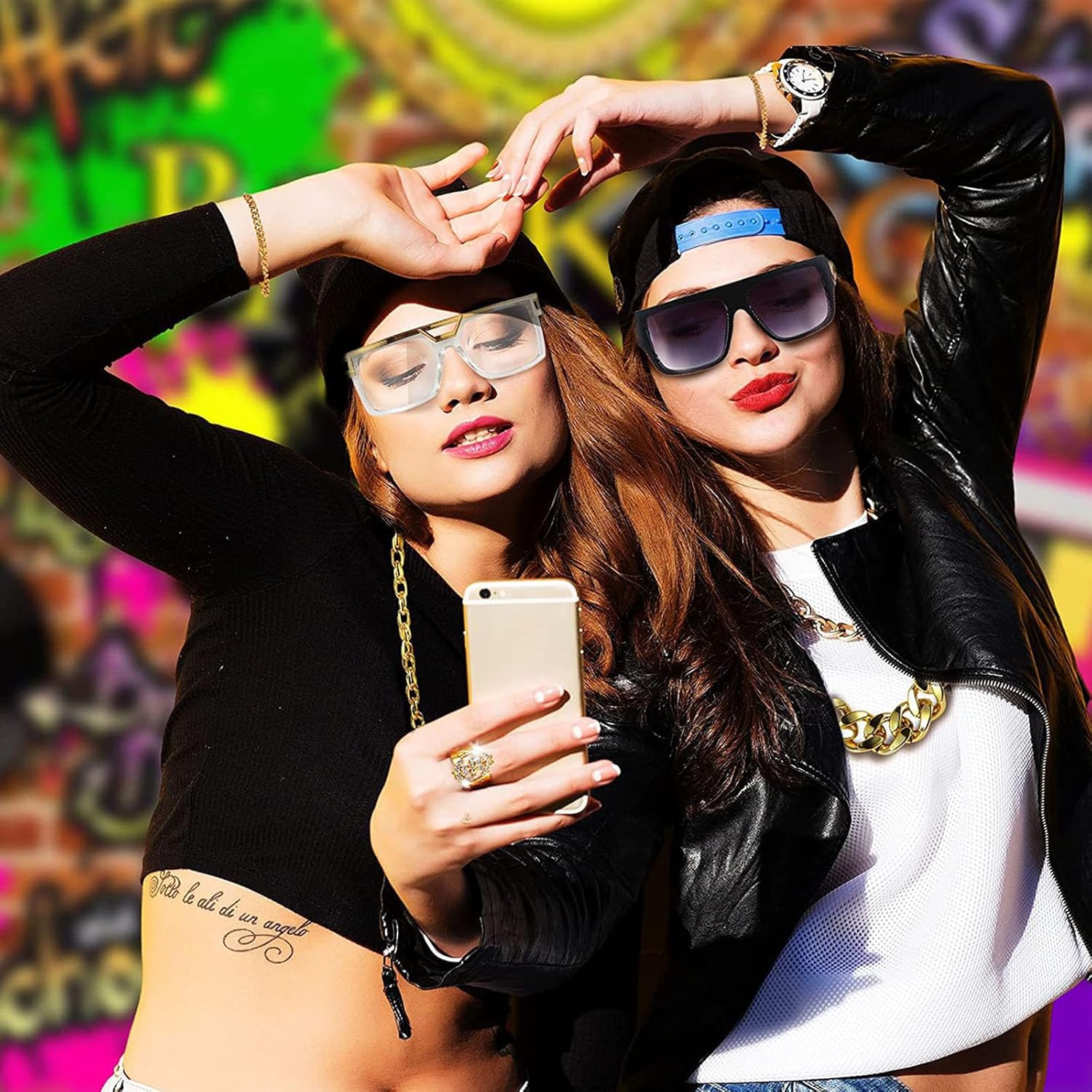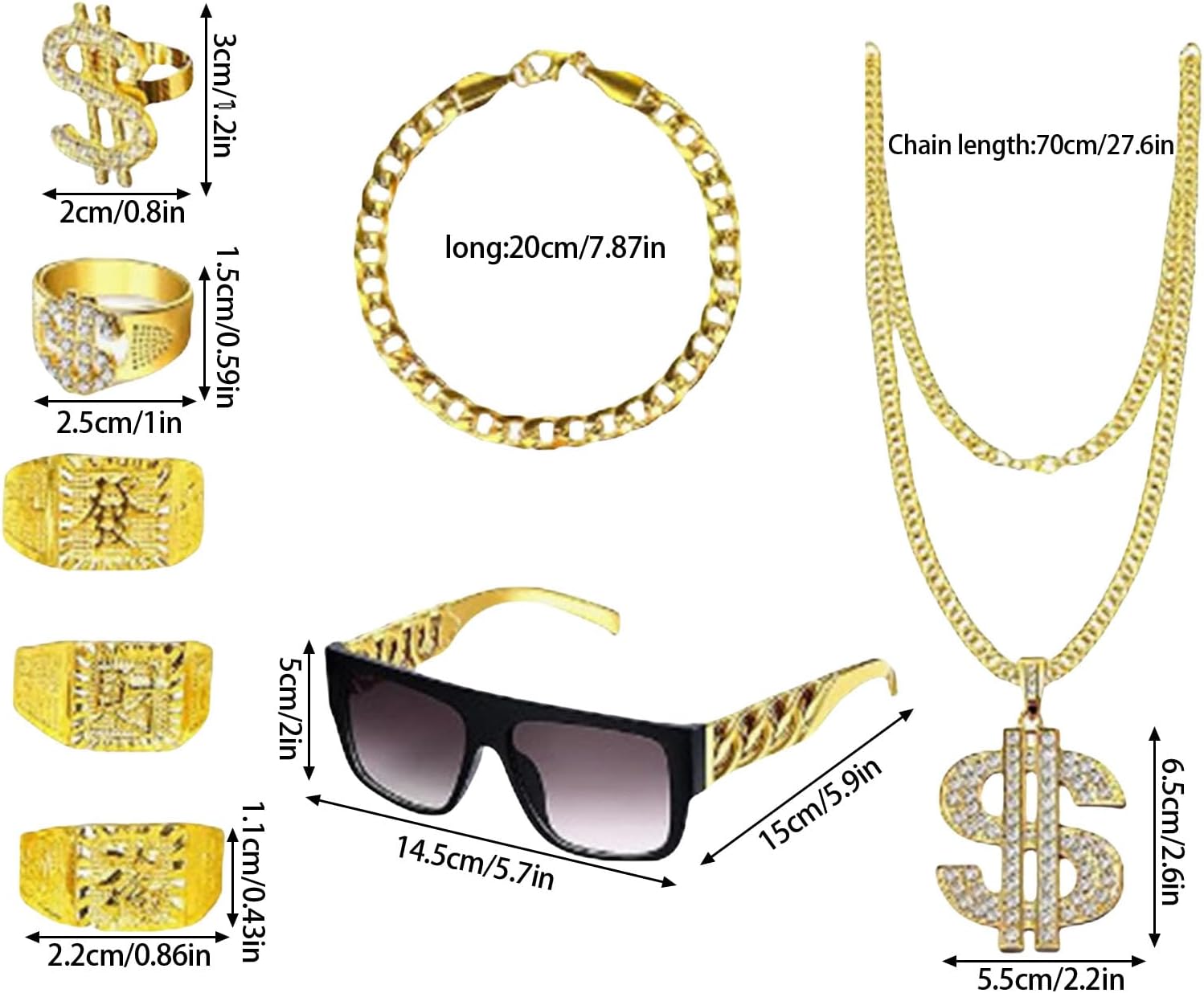 Hip Hop Costume Kits 80/90er Outfit Cool Rapper Accessori Occhiali da Sole Collana Placcata Oro Catena Bracciali Caratteristiche: Forniture per feste degli anni '80/90, i nostri kit di costumi hip hop includono 1 paio di bicchieri da rapper, 1 pezzo Faux Gold Chain, 3 anelli di benedizione, 1 braccialetto, 2 pezzi di dollari, divertente set di costumi per i vostri anni '80, '90, sarete gli occhi in tema anni '80 o '90. Lo scudo del dollaro suona, i cartelli del dollaro sono realizzati con anelli in lega distribuiti in colore dorato; gli anelli e la collana sono decorati con strass artificiali. Materiali di qualità, kit costume hip hop di materiali di qualità, piena durata, comodo da indossare. Regalo meraviglioso, dolce regalo caldo per amici, familiari o per te stesso. La confezione include 8 pezzi. Specifiche: Materiali: lega. La confezione include: 1 set di costume hip hop. Nota: Si prega di considerare un margine di errore di 1-2 cm a causa della misurazione manuale. A causa delle differenze tra i diversi monitor, l'immagine potrebbe non riflettere il colore reale dell'articolo.