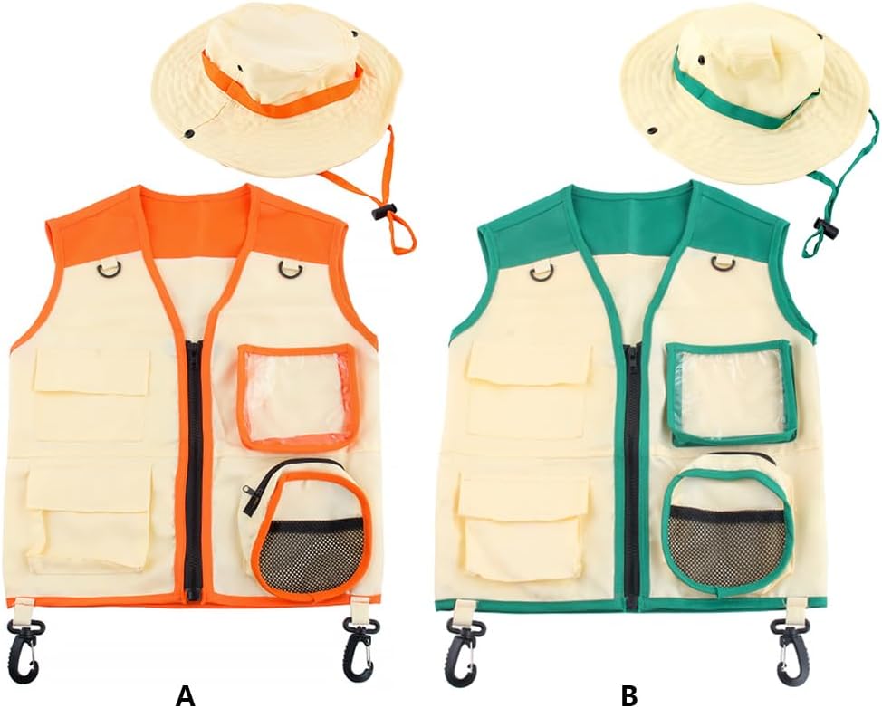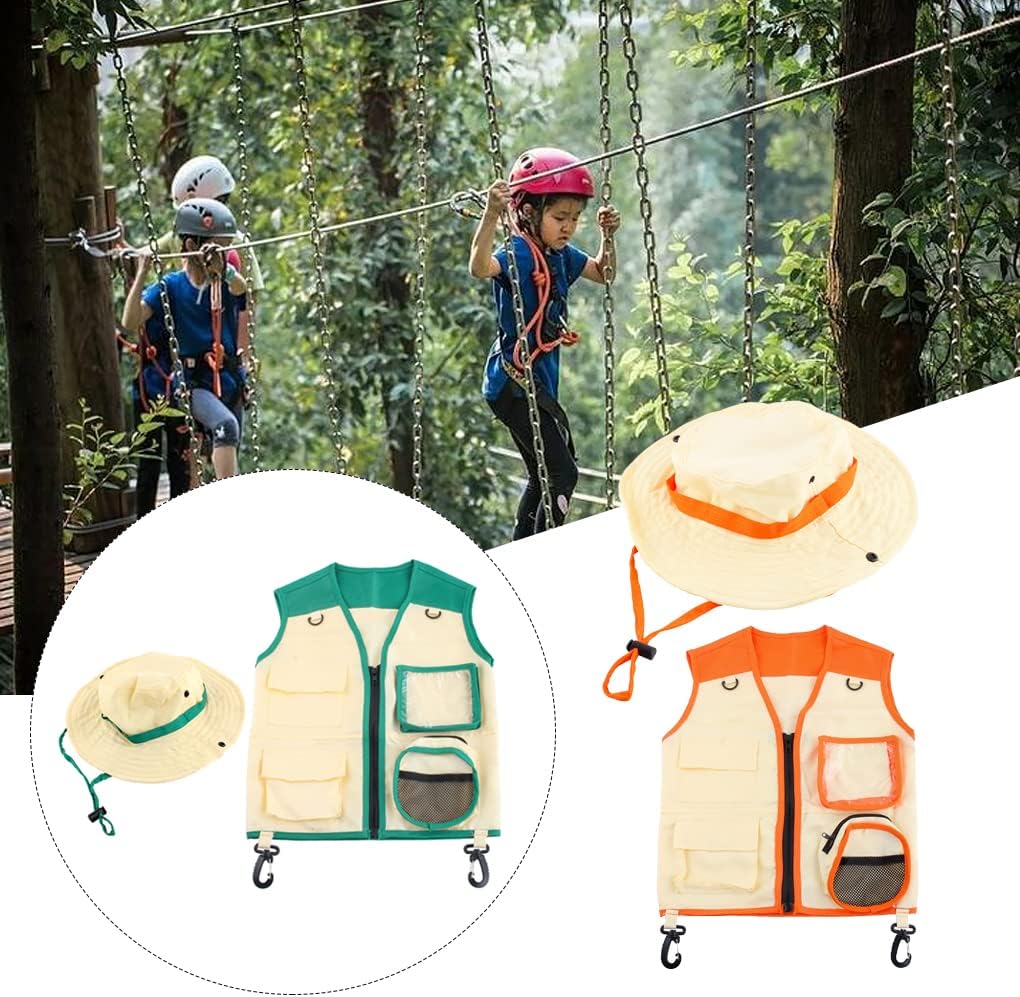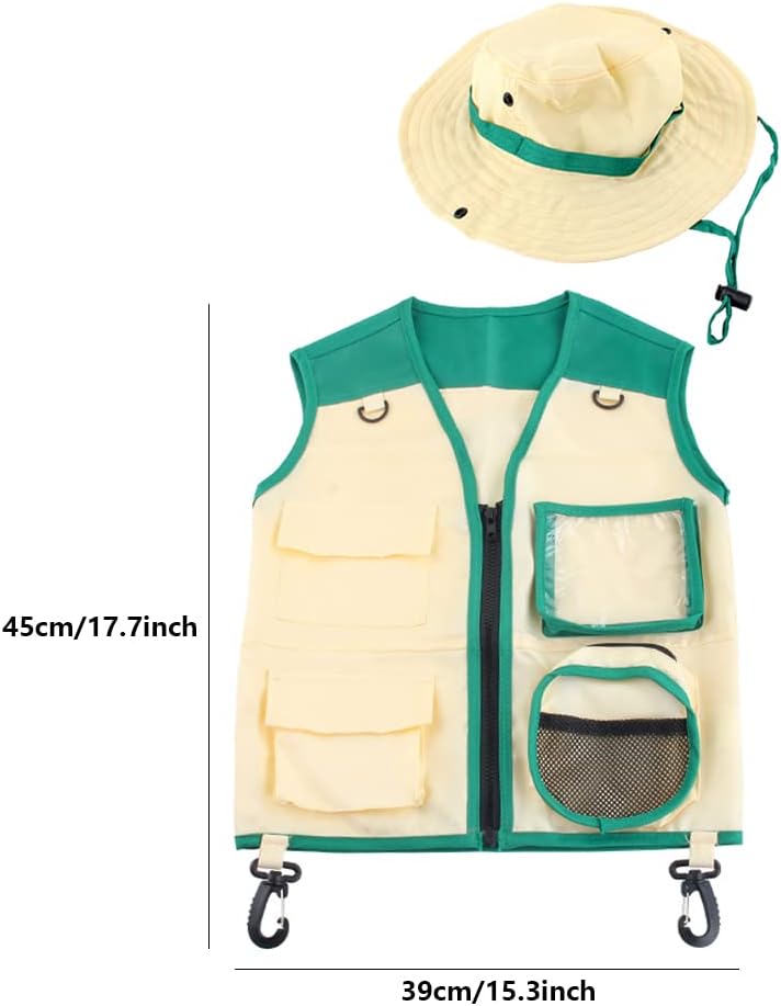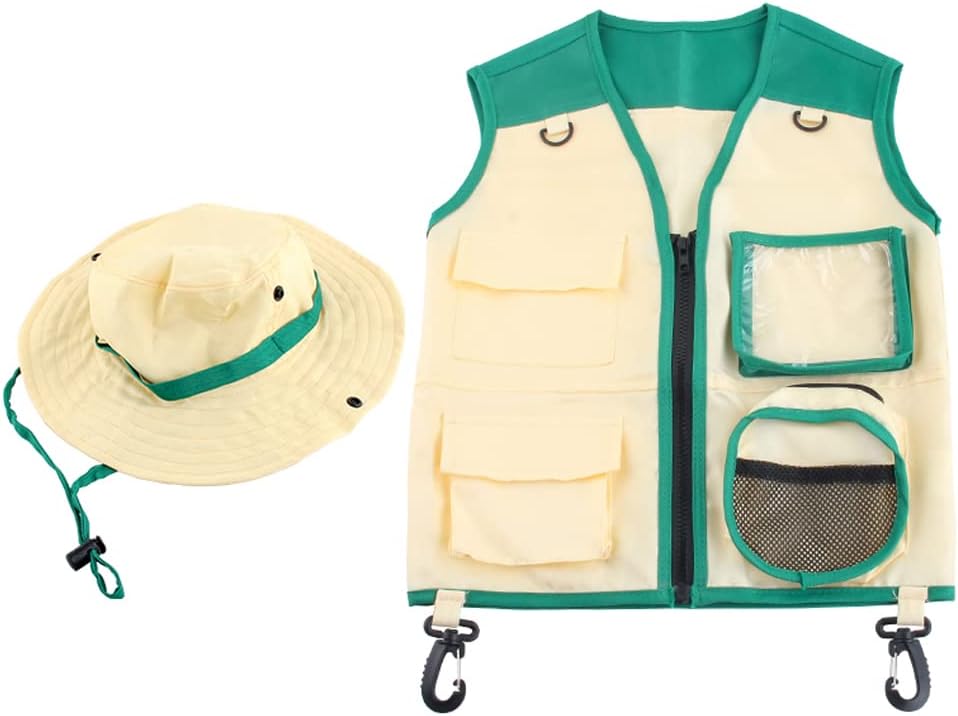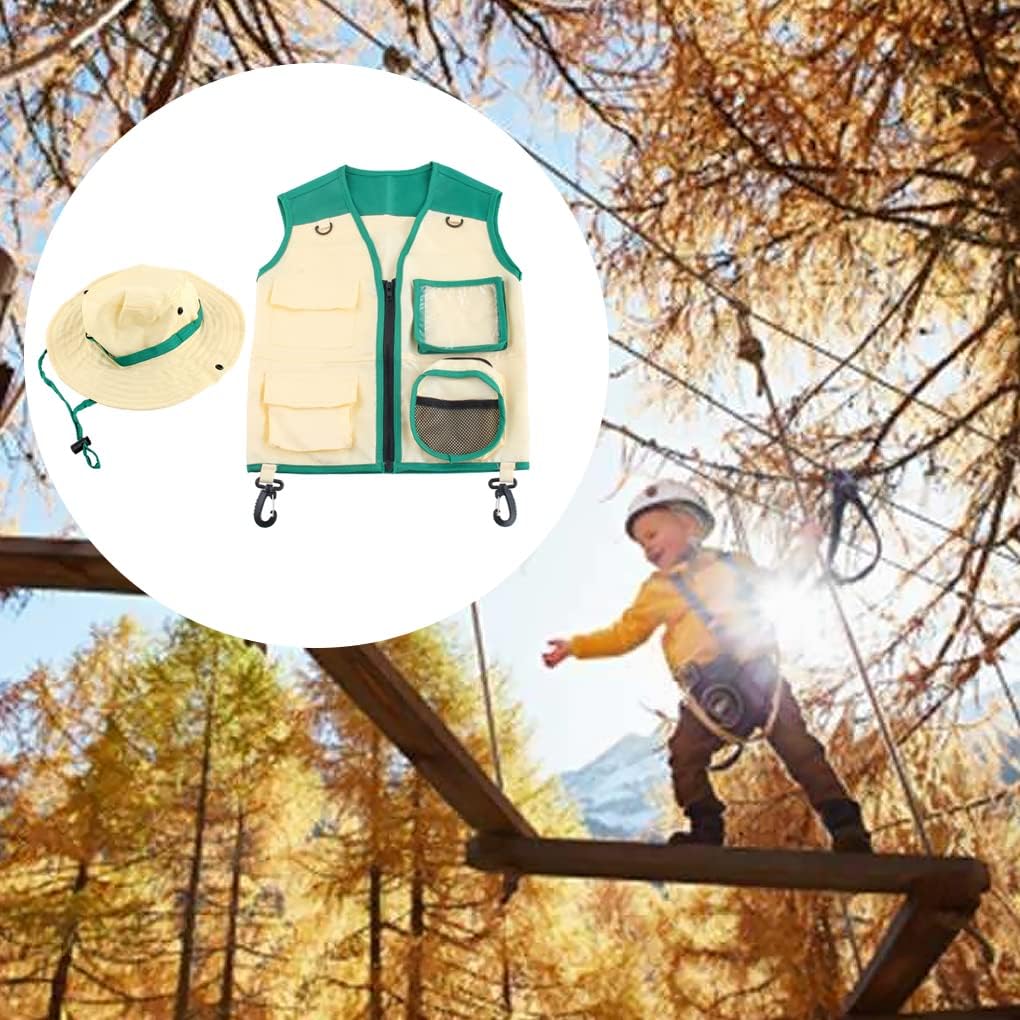Design unico: il kit esploratore all'aperto rende i tuoi bambini un vero esploratore, adorabile e accattivante, che aiuta a stimolare il loro interesse per la natura. Adatto a varie occasioni: gli abiti da avventura sono perfetti per feste in costume, fotografia, campeggio, pesca e altro ancora. tesa larga: il cappello explorer è progettato con una tesa larga per proteggere i bambini dalla luce solare quando giocano all'aperto. Regalo speciale: il set di cappelli da avventura è un regalo perfetto per ragazzi e ragazze, adatto per compleanni, lauree, eventi festivi, ecc. Materiale morbido: il gilet e il cappello Explorer sono realizzati in poliestere traspirante, delicato sulla pelle, indossabile e non danneggia la pelle.