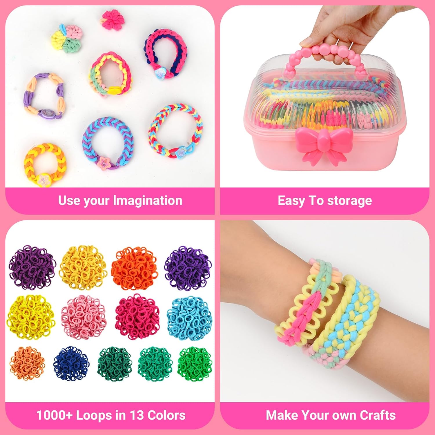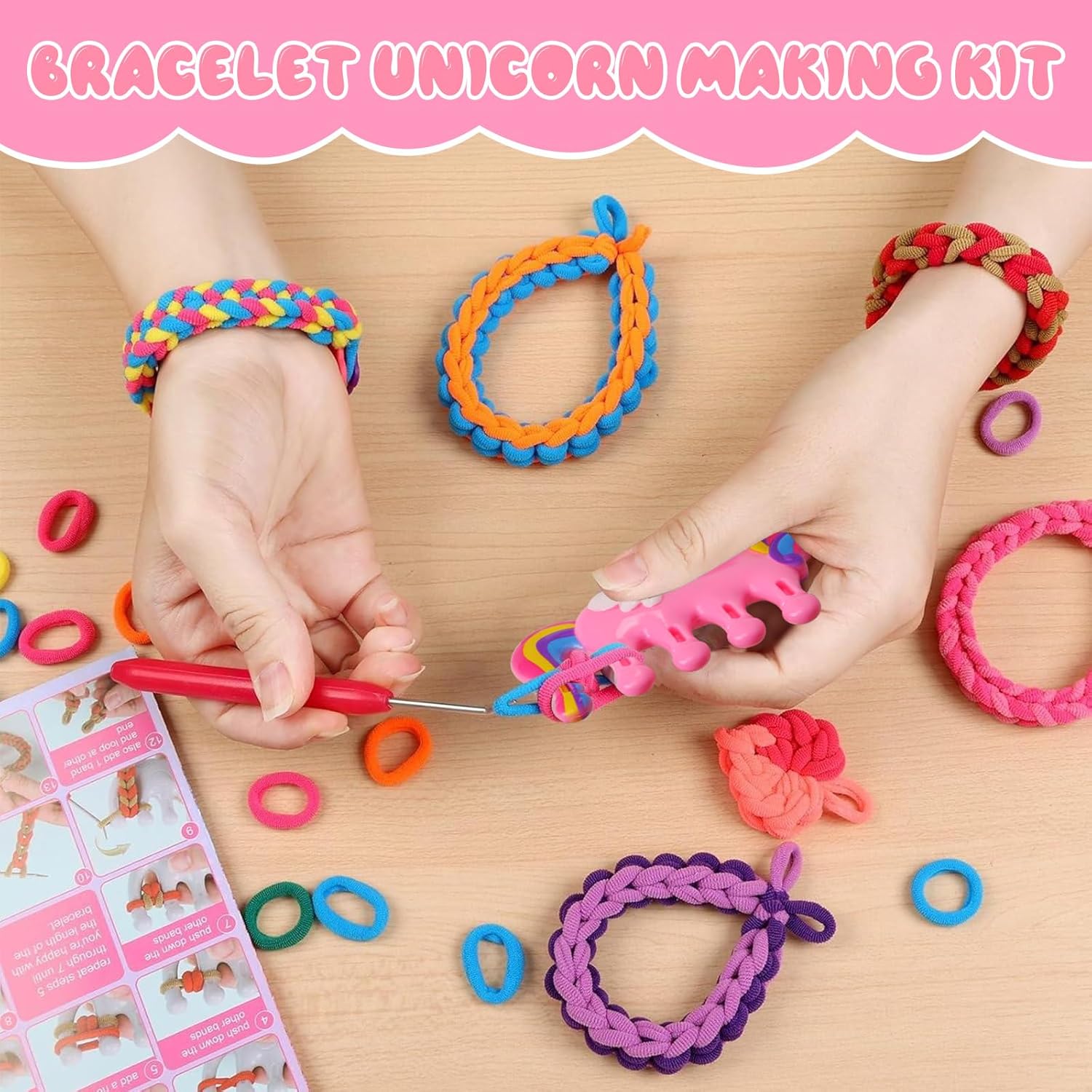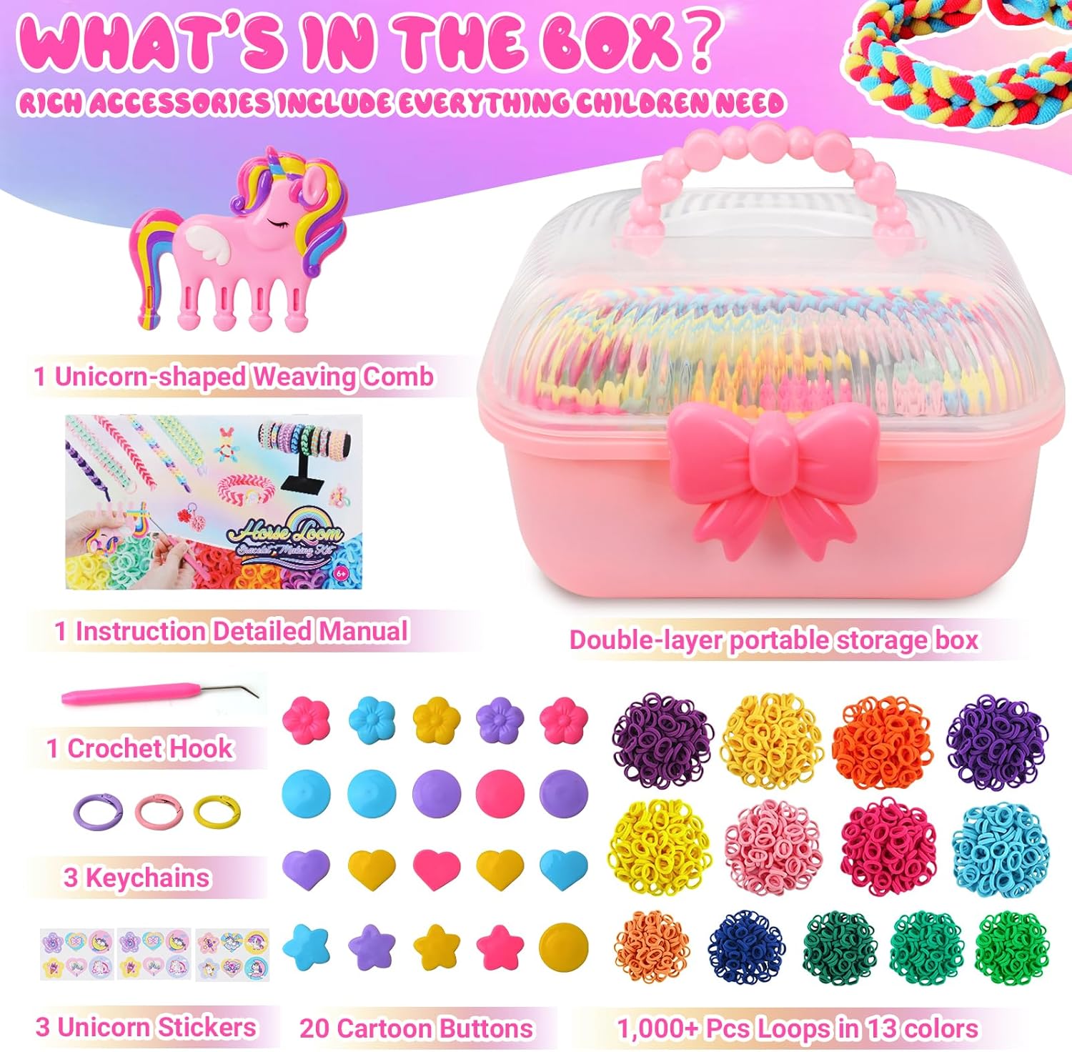 Set di Braccialetti Unicorno Divertenti: Questo Kit per Braccialetti Ragazza include 1 pettine per trecce a forma di unicorno, 1 uncinetto, 3 portachiavi, 3 adesivi a forma di unicorno, 20 fibbie a forma di cartone animato, 13 elastici per capelli in oltre 1.000 colori, 1 scatola portaoggetti rosa e 1 manuale di istruzioni. Questa macchina per maglieria a forma di unicorno rosa presenta un corpo aerodinamico e bordi lisci. Set Valigia 0ortatile Intrecciata: Questo kit di Braccialetti Amicizia Bambini è L'esclusivo design a valigia con comode maniglie permette alle bambine di portare facilmente con sé i loro materiali per lavorare a maglia preferiti e di vivere avventure creative sempre e ovunque. Che si tratti di un weekend, di una gita in famiglia o di un campeggio, questo set di braccialetti fai da te è un compagno divertente per le bambine, che permette loro di divertirsi a creare sempre e ovunque! Istruzioni Dettagliate: Le istruzioni illustrate facilitano l'avvio del lavoro. Ogni passaggio è accompagnato da illustrazioni dettagliate e istruzioni testuali. Con 14 stili di tessitura inclusi, i bambini possono facilmente seguire le istruzioni e creare i propri braccialetti. Con il nostro versatile kit braccialetti fai da te bambina, puoi creare molto più di semplici bracciali! Crea facilmente eleganti collane, fasce per capelli, anelli, collari per animali domestici e molto altro. Crea Braccialetti Bambina: Le bambine di tutte le età possono divertirsi con un hobby divertente e creativo. Il sset per fare braccialetti è un elastici per braccialetti unico e divertente che stimola l'immaginazione dei bambini, incoraggia la creatività, migliora la coordinazione occhio-mano e promuove le capacità motorie fini e il pensiero logico. I nostri elastici colorati sono realizzati in cotone elastico e morbido, confortevole sulla pelle e resistente, rendendoli divertenti da realizzare. Un Regalo Perfetto per i Bambini: questo set di elastici è un regalo perfetto per bambine di 6, 7, 8, 9 o 10 anni, per il ritorno a scuola, i compleanni, Natale o altre festività. Scalderà il cuore di chi lo riceve. È un progetto di bracciali senza tempo e nostalgico per tutte le età. Createvi a vicenda un regalo unico e fatto a mano, come simbolo del vostro affetto e della vostra amicizia.