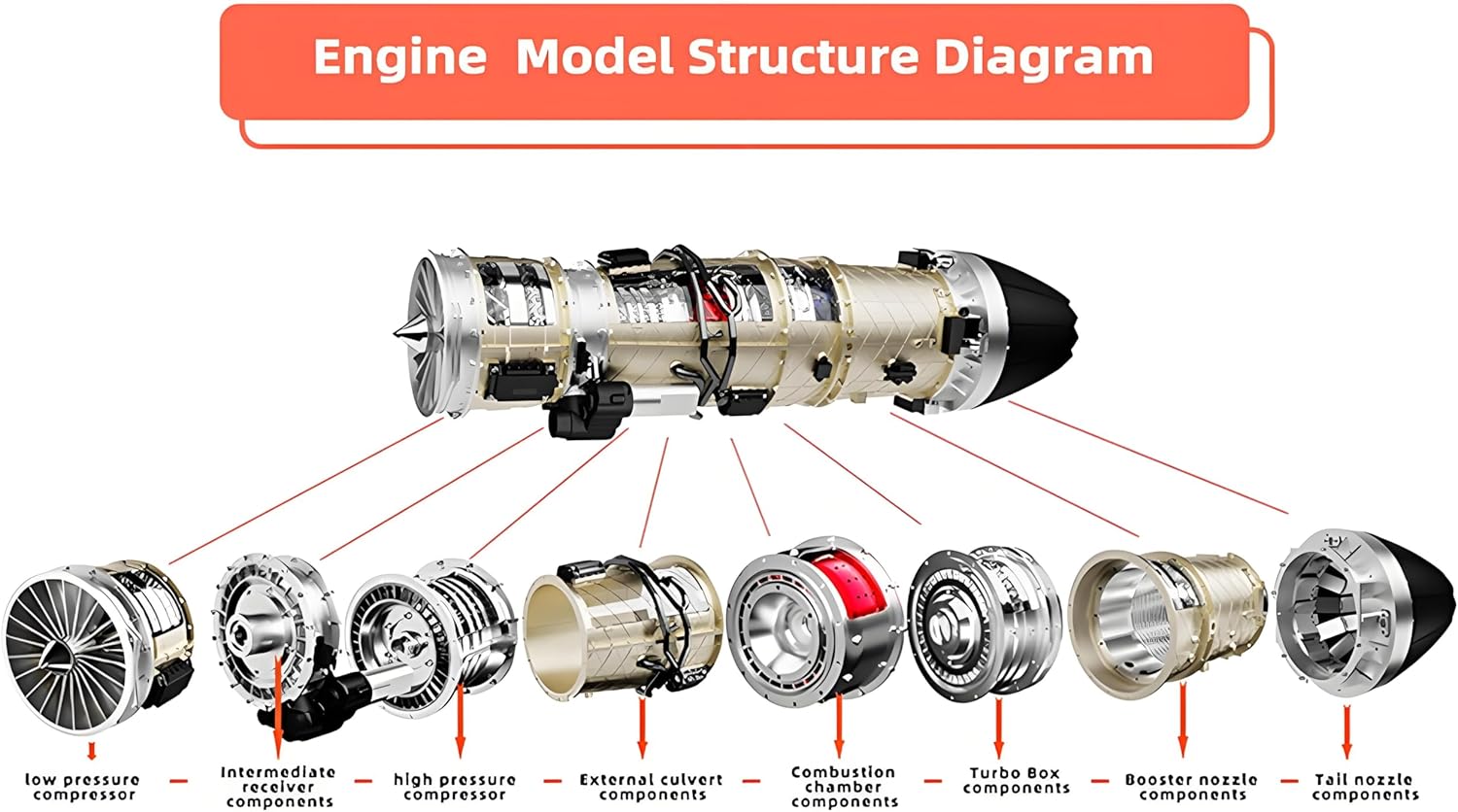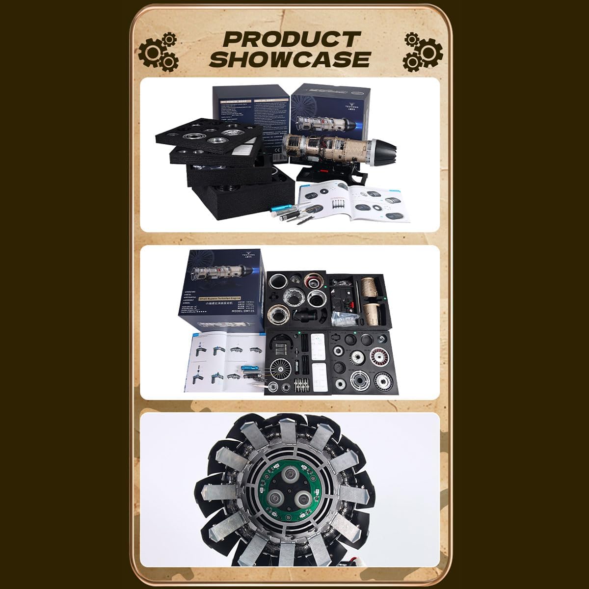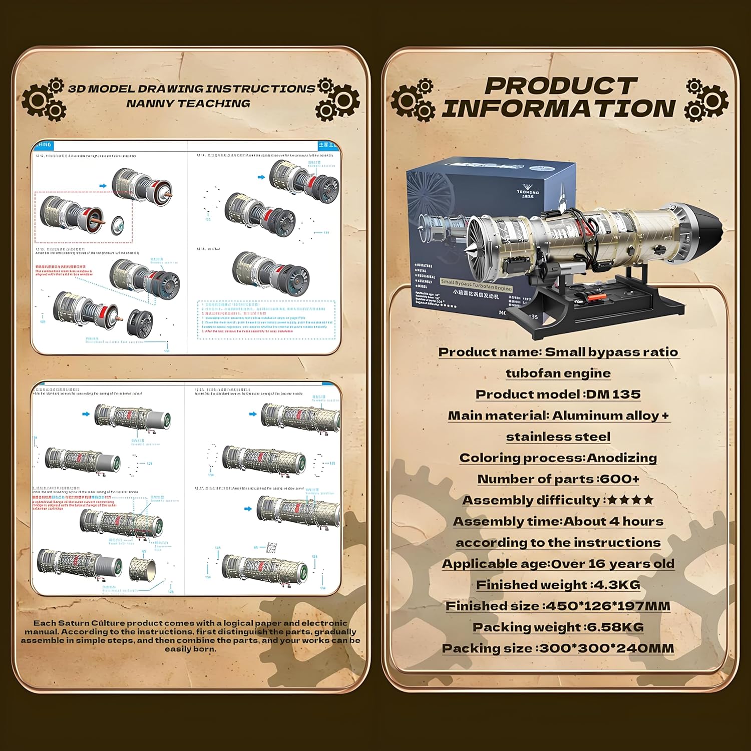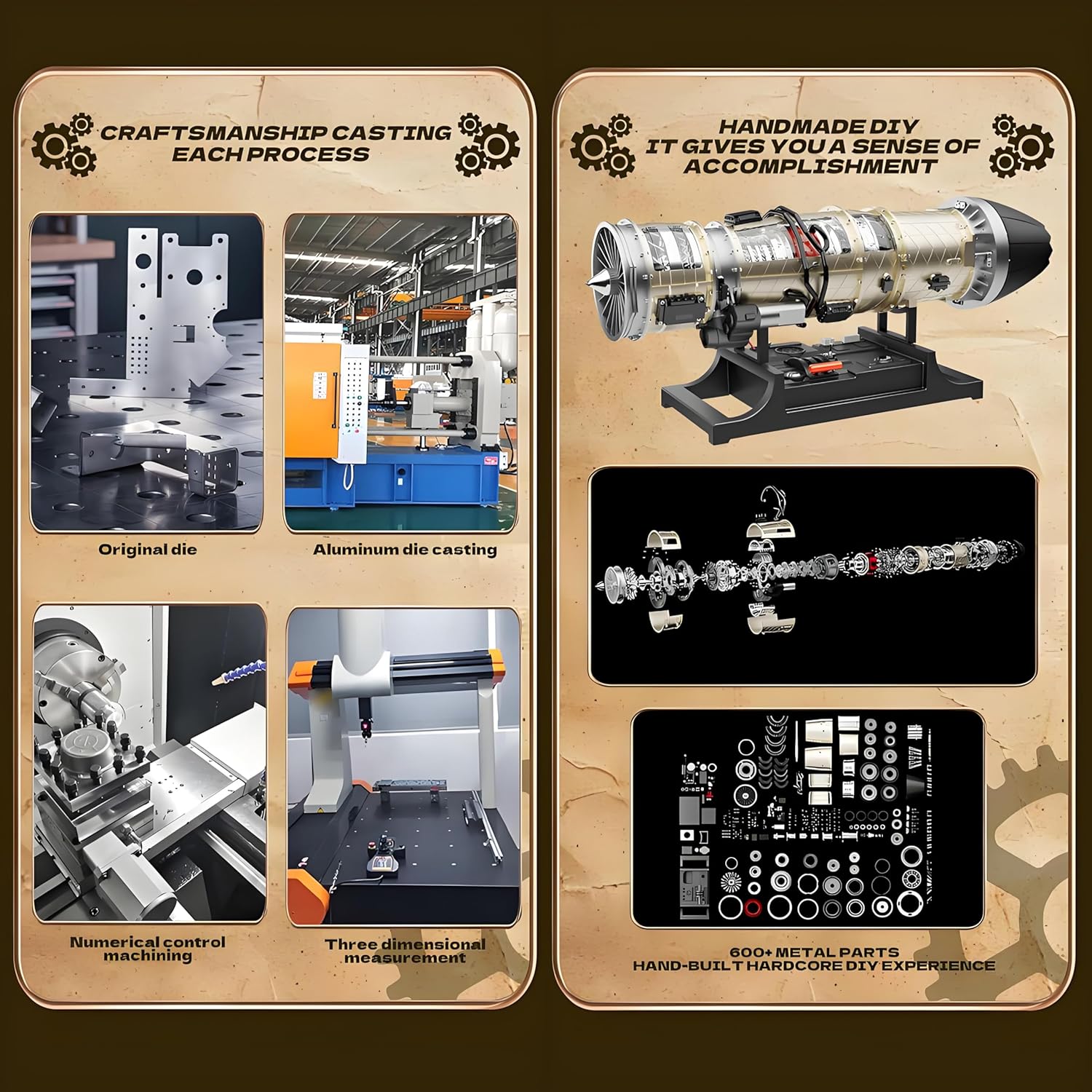 Propulsore turbofan realistico: questo modello dettagliato mostra tutti i componenti principali di un vero motore a reazione: fan, motore nucleare, turbina a bassa pressione, postcombustore, ugello di scarico e cambio accessorio. Ideale per gli amanti della tecnologia e dell'aviazione che cercano una comprensione tangibile di macchine complesse. Lavorazione di alta qualità: tutti i componenti sono realizzati in metallo pieno di alta qualità, realizzati con fresatura CNC e fusione di precisione. Le superfici sono sabbiate e anodizzate per una durata eccezionale, al tatto e una finitura visivamente accattivante. Mobile e visibile: grazie al motore integrato, il funzionamento di un vero motore può essere simulato realisticamente. La struttura aperta dello chassis offre una visione mozzafiato degli interni. Con base stabile e pannello di controllo multifunzione per una vera sensazione tecnica. Immergiti nel meraviglioso mondo delle macchine industriali in miniatura. Divertente e sofisticato montaggio fai da te: il kit contiene oltre 600 componenti, inclusi strumenti di montaggio e istruzioni in inglese illustrate (lingua italiana non garantita). Perfetto per ingegneri hobby, modellisti e appassionati di tecnologia che amano un progetto di costruzione impegnativo, da soli o insieme a bambini dai 16 anni in su. Oggetto da collezione & Idea regalo: trasmette in modo vivido il funzionamento dei motori moderni e promuove l"interesse per l"ingegneria aerospaziale. Perfetto come kit pedagogico STEAM o come oggetto decorativo di alta qualità in ufficio, soggiorno o scaffale tecnico, una vera attrazione e un inizio di conversazione.