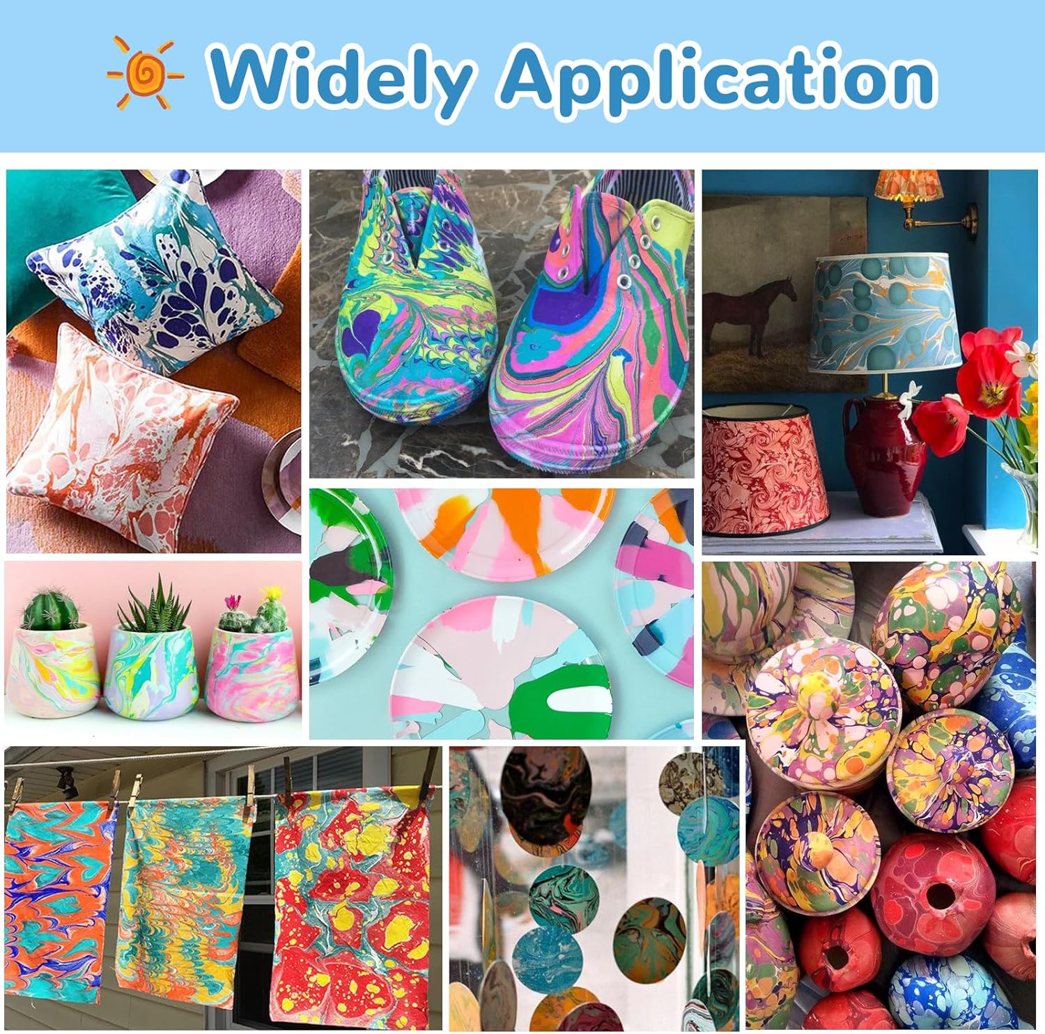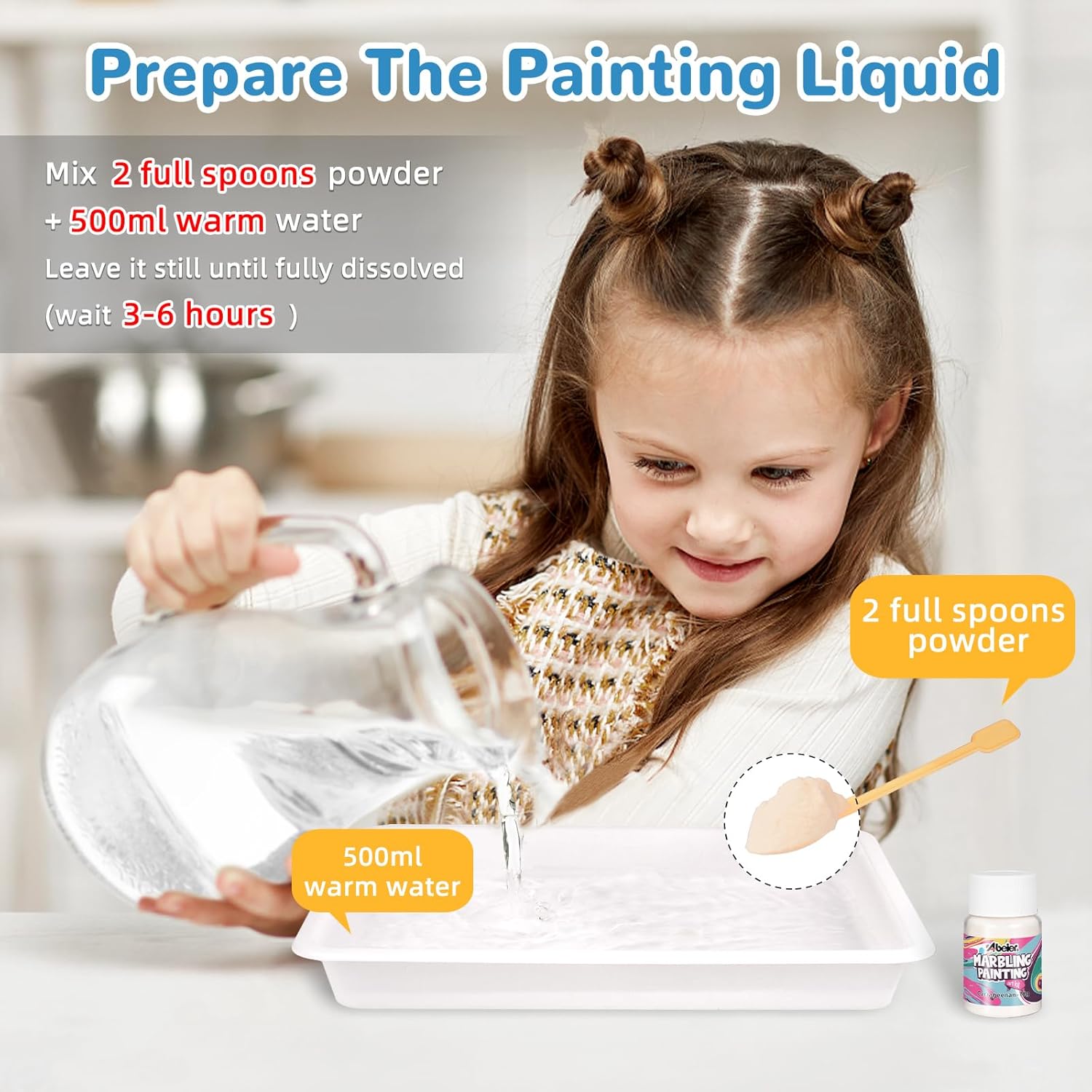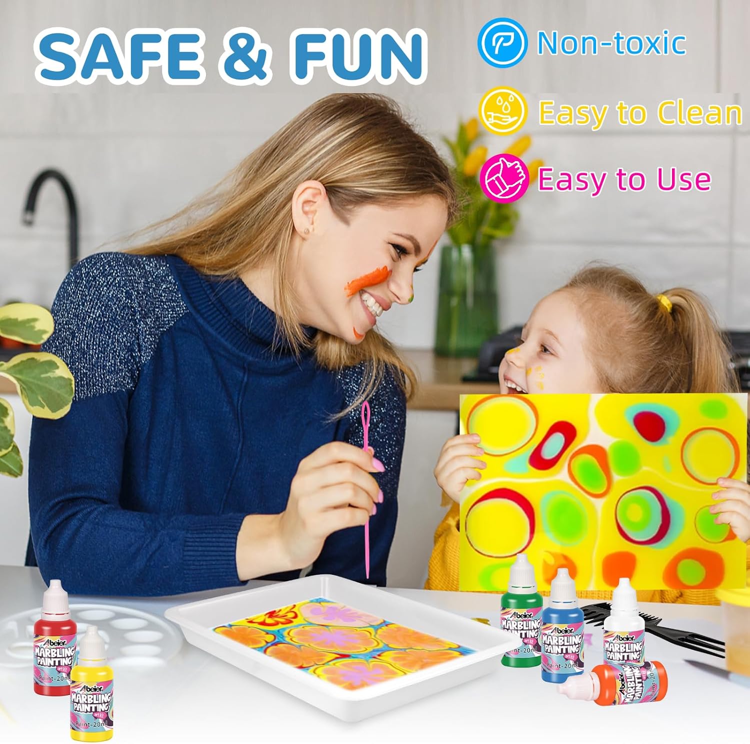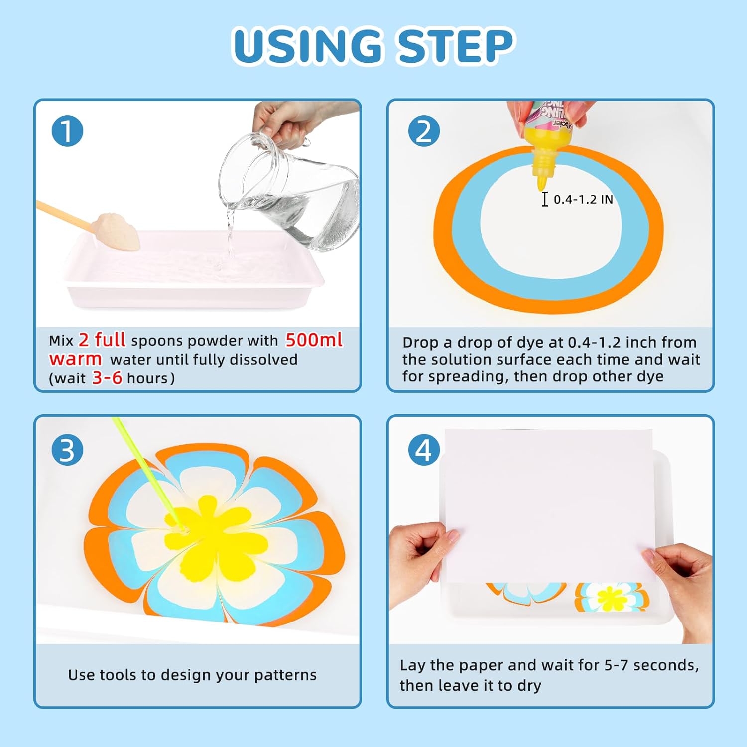 Pittura magica sull'acqua: non è necessaria carta o tela: crea disegni straordinari e unici ruotando vernici vivaci sull'acqua e trasferendole su carta, ecc. Perfetto per bambini (6+) e adulti! Facile e divertente per tutte le età: basta lasciare, girare e trasferirlo. Segui la guida passo passo per creare affascinanti motivi in marmo, non è richiesta alcuna esperienza di pittura. Materiali sicuri e non tossici: pigmenti ecologici e liquidi da disegno adatti ai bambini. Il pigmento sulla pelle può essere lavato facilmente con acqua e sapone. Adatto a bambini di età superiore ai 6 anni. Si raccomanda la supervisione di un adulto. Kit tutto incluso: include 8 colori di vernice (20 ml ciascuno), 10 fogli di carta, 2 aghi, pipetta, spalmatore, vassoio e cucchiaio. Tutto il necessario per iniziare a marmorizzare! Regalo perfetto per ogni occasione: ideale per Pasqua, compleanni, festa della mamma/papà, progetti STEM o lezioni di arti e artigianato. Ispira la creatività con un'attività pratica e unica