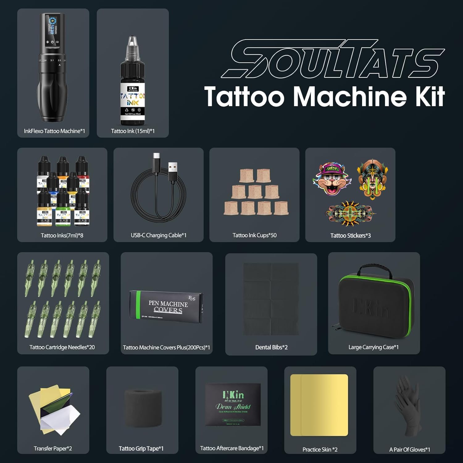 【Design della macchinetta per tatuaggi con impugnatura ergonomica】 Questa macchinetta per tatuaggi cordless è realizzata in lega di alluminio aeronautico, leggera e resistente, ideale per un uso professionale di lunga durata. L'impugnatura ergonomica con scanalature sottili offre presa e comfort ottimali. Le sue dimensioni si adattano perfettamente alla forma della mano, garantendo un lavoro confortevole anche durante lunghe sessioni. 【7 Lunghezze della linea regolabili】 La nostra macchinetta per tatuaggi offre 7 lunghezze della linea regolabili con precisione: da 2,0 mm a 4,0 mm. Da 2,0 mm a 2,4 mm: ideale per linee sottili e lavori precisi. Da 2,8 mm a 3,1 mm: ideale per ombreggiature e neri e grigi tenui. Da 3,4 mm a 4,0 mm: ideale per riempimenti colorati e contorni forti. Questa macchinetta per tatuaggi è adatta per tatuaggi, trucco permanente (PMU) e trucco permanente (SMP). È adatto sia ai principianti che ai professionisti esperti. 【Macchina per tatuaggi professionale】 Questa macchinetta per tatuaggi cordless è dotata di un potente rotore a tazza cava da 9500 giri/min, che offre prestazioni costanti con vibrazioni e rumore minimi. Il suo funzionamento preciso garantisce un flusso di inchiostro uniforme e senza interruzioni, ideale per lavori di precisione e progetti impegnativi. Questa macchinetta per tatuaggi professionale offre prestazioni eccezionali ad un ottimo rapporto qualità prezzo. 【Batteria a Lunga Durata con Display OLED】La macchinetta per tatuaggi è dotata di una batteria da 1600 mAh, che fornisce 5-7 ore di uso continuo una volta completamente carica. Il tempo di ricarica è di sole 2 ore circa. Lo schermo OLED integrato mostra chiaramente la tensione e il livello della batteria, mantenendoti sotto controllo mentre lavori. Rispetto alle macchinette per tatuaggi simili presenti sul mercato, questo modello combina alta qualità e prezzo accessibile. 【Kit completo per macchinetta per tatuaggi】Questo kit per tatuaggi contiene tutto il necessario per l'uso immediato: 1 macchinetta per tatuaggi Soultats, 20 aghi per tatuaggio REVO (5 1203RL, 5 1201RL, 5 1215M1C, 5 1213M1C), 9 inchiostri per tatuaggi, 1 pelle sintetica per tatuaggi, 30 tazze per inchiostro per tatuaggi, 2 bavaglini, 2 stencil per trasferimento tatuaggi, 1 USB Type-C cavo, 2 guanti, 1 copertura per macchinetta per tatuaggi, 1 benda per tatuaggio (5 pezzi), 1 impugnatura per tatuaggio, 1 manuale multilingue, 1 custodia grande per il trasporto.