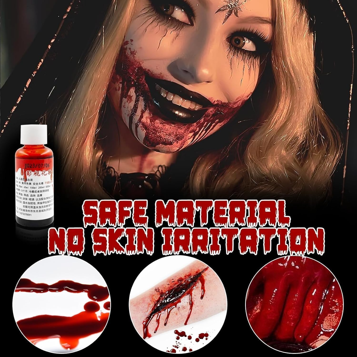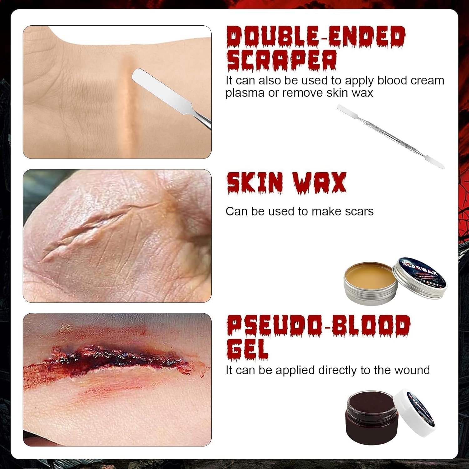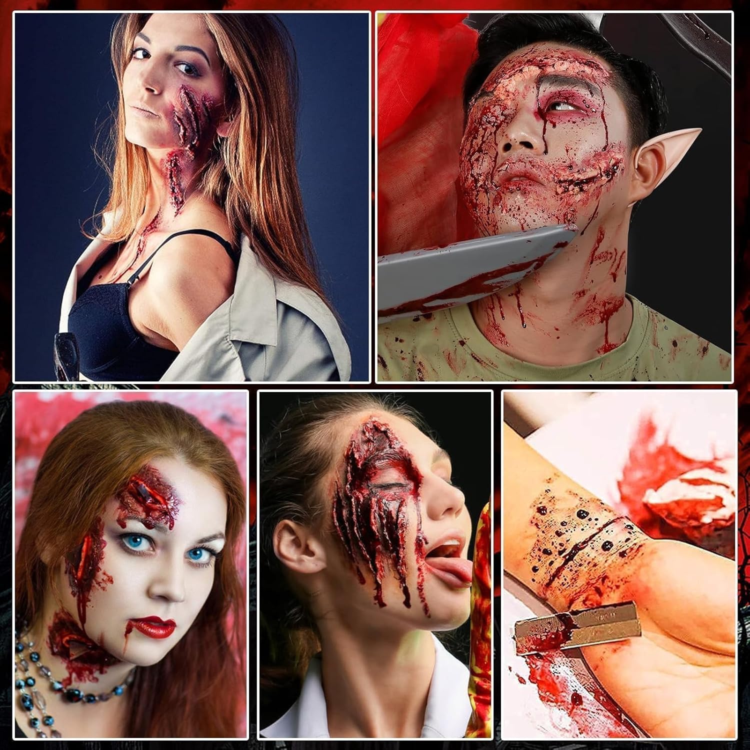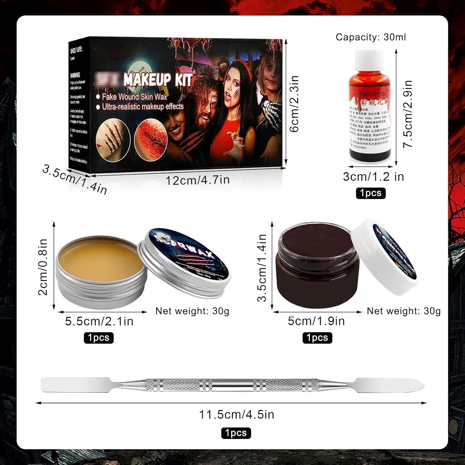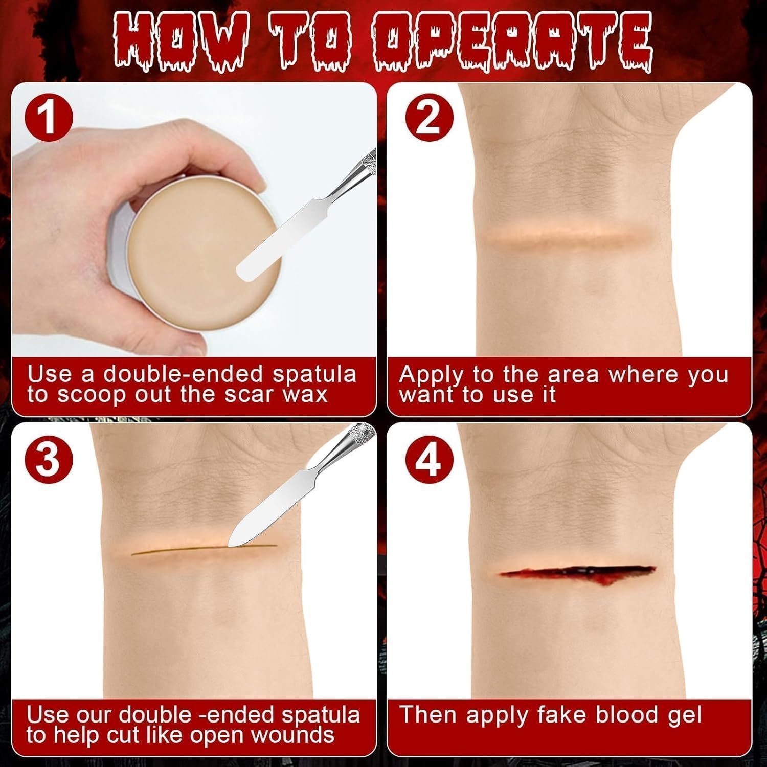 Kit per Trucchi Halloween Make Up: confezionato in una scatola colorata, inclusa cera per cicatrici + lattice liquido + sangue finto + spatola a doppia estremità. Quando si rimuove il trucco, si consiglia di utilizzare prima l'olio struccante. Quelli con la pelle sensibile devono prima provarlo localmente Effetto trucco realistico: la perfetta combinazione di sangue finto e lattice può non solo creare scene spaventose e sanguinanti, ma anche imitare tutti i tipi di ferite crudeli come tagli, fessure, lacerazioni e ustioni. Lascia correre la tua immaginazione e creatività Materiali sicuri e non tossici: Kit di Cera per Cicatrici utilizza materiali non irritanti di alta qualità con una consistenza morbida e liscia che non danneggia la pelle ed è sicura sia per gli adulti che per i bambini Facile da usare: A: Applicare uniformemente il lattice liquido sulla pelle prima di applicare il plasma. Si consiglia di idratare e preparare preventivamente la pelle con un fondotinta liquido, che non solo renderà il trucco più realistico, ma anche facile da rimuovere Facile da usare:B: la cera per cicatrici deve essere ritagliata con un coltello per cera. Premi la cera per pelle con la mano e modellala con il coltello quando avrà la giusta durezza. Non utilizzare la cera per la pelle direttamente sulle mani poiché verrà ammorbidita dalla temperatura delle mani e difficile da modellare, si attaccherà alle mani