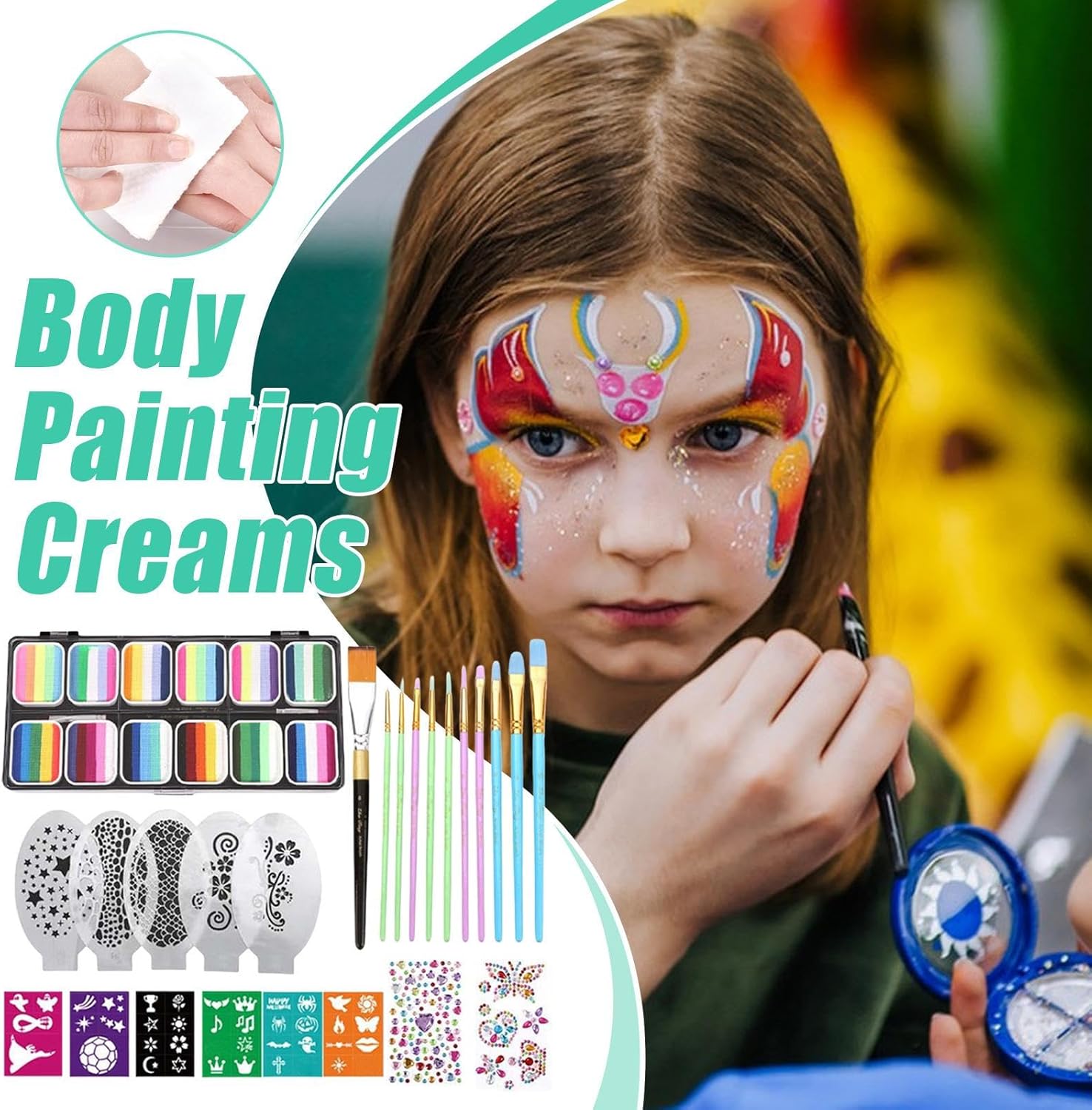 Cosmetici Sicuri: Composizione delicata e non irritante per un divertimento senza preoccupazioni, rimovibile completamente con acqua in modo rapido e semplice Flessibilità Migliorata: Beneficia dei vantaggi della pittura dalla texture liscia che si spalma facilmente e si adatta alle espressioni dinamiche del viso, fornendo una finitura affidabile anti-screpolature per creazioni di face art vivaci Coprenza : Pigmenti vibranti e colori vivaci garantiscono una copertura potente per massima esprressività artistica in ogni design di trucco Adattabilità Versatile:Garantisce performance affidabili per celebrazioni a tema, migliorando l'espressività artistica e pronto per l'uso su palco, feste Halloween o qualsiasi incontro creativo con semplice applicazione multievento Soluzione Creativa: Set completo per pittura viso con strumenti essenziali e accessori decorativi. La versatilità d'impiego e il formato pronto all'uso agevolano attività artistiche, trasformando ogni evento in esperienze creative accessibili.