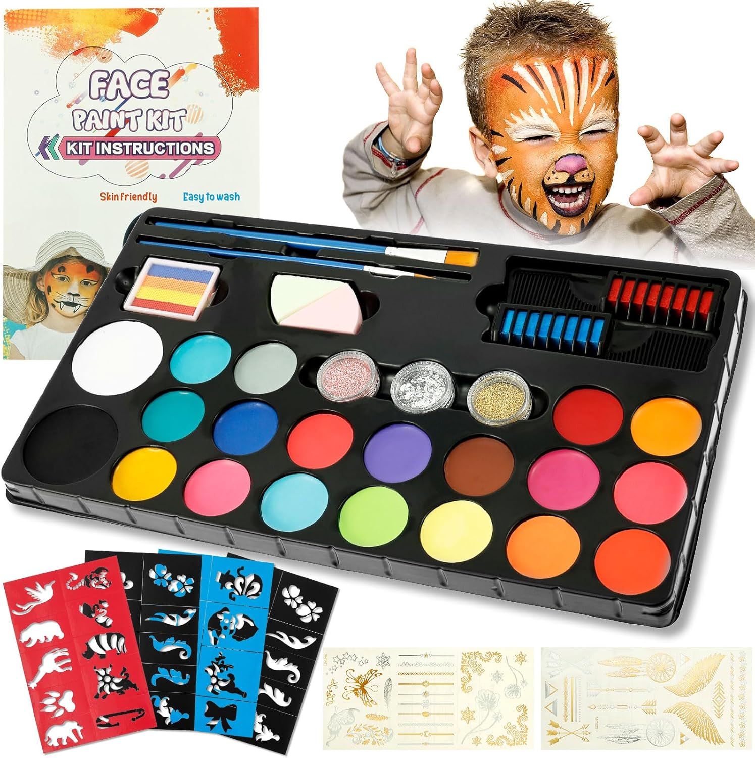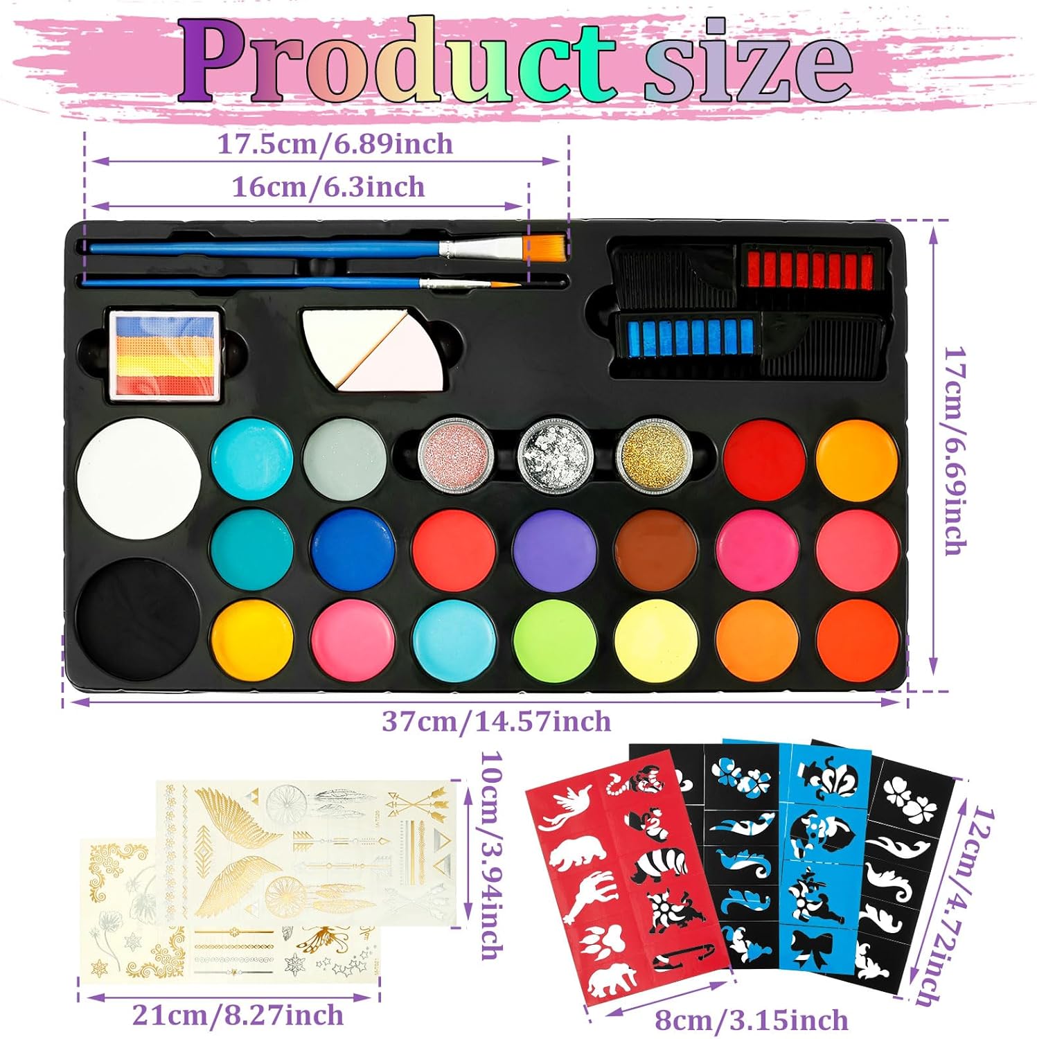 Pettini per colore dei capelli: quando applichi un trucco squisito, puoi abbinarli allo stesso colore di capelli per rendere il tuo look ancora più accattivante. Stencil creativi: gli stencil autoadesivi riutilizzabili rendono la tua creazione più semplice e conveniente. Tavolozza di 20 colori: la vernice per il viso ha colori brillanti, un forte potere coprente e una colorazione più uniforme. Vernice per il viso solubile in acqua: la vernice per il viso solubile in acqua di grado cosmetico è sicura da usare, facile da rimuovere con struccante e salviettine umidificate, basta strofinare delicatamente, pulire senza lasciare residui. Pennello da pittura: buona elasticità, setole morbide e resistenti, tocco morbido, facile da dipingere senza supporto, setole non facili da perdere.
