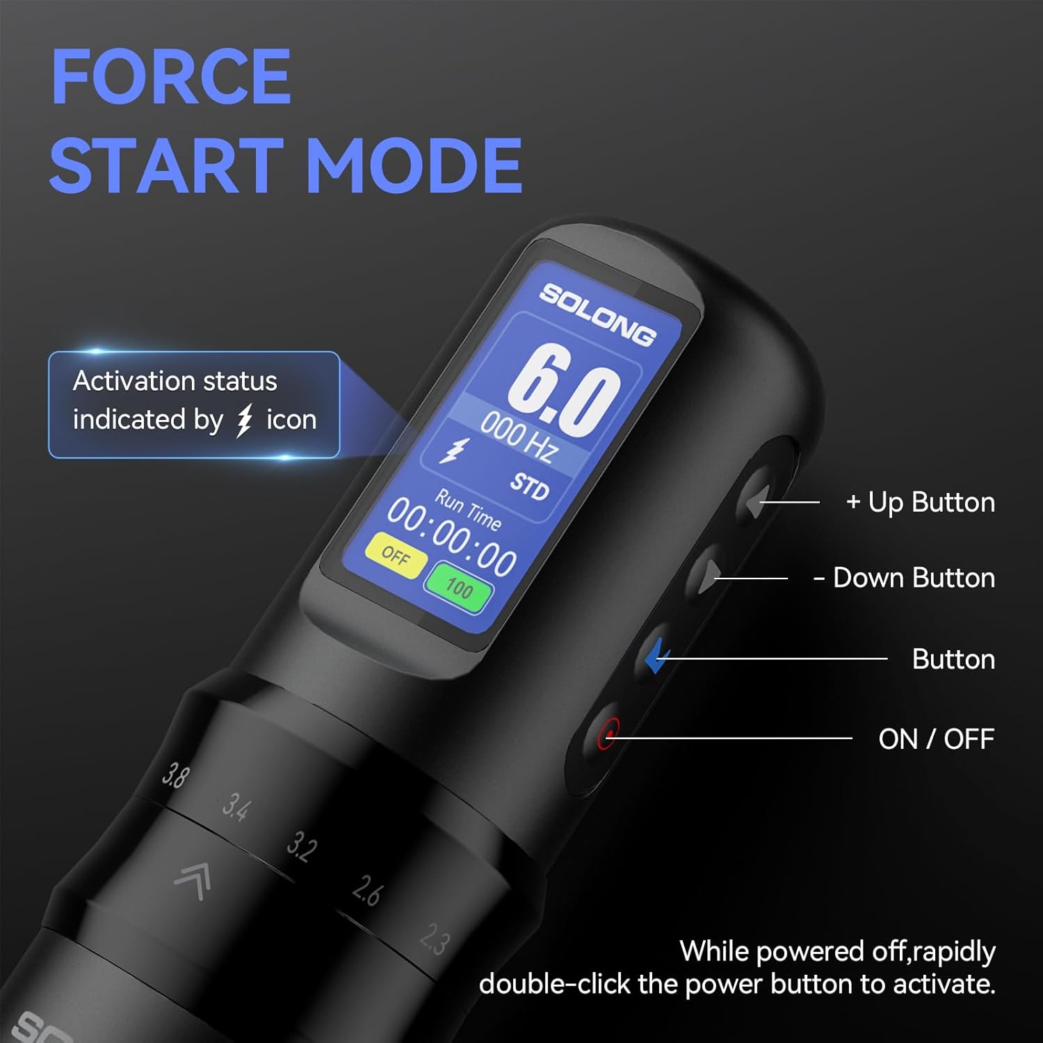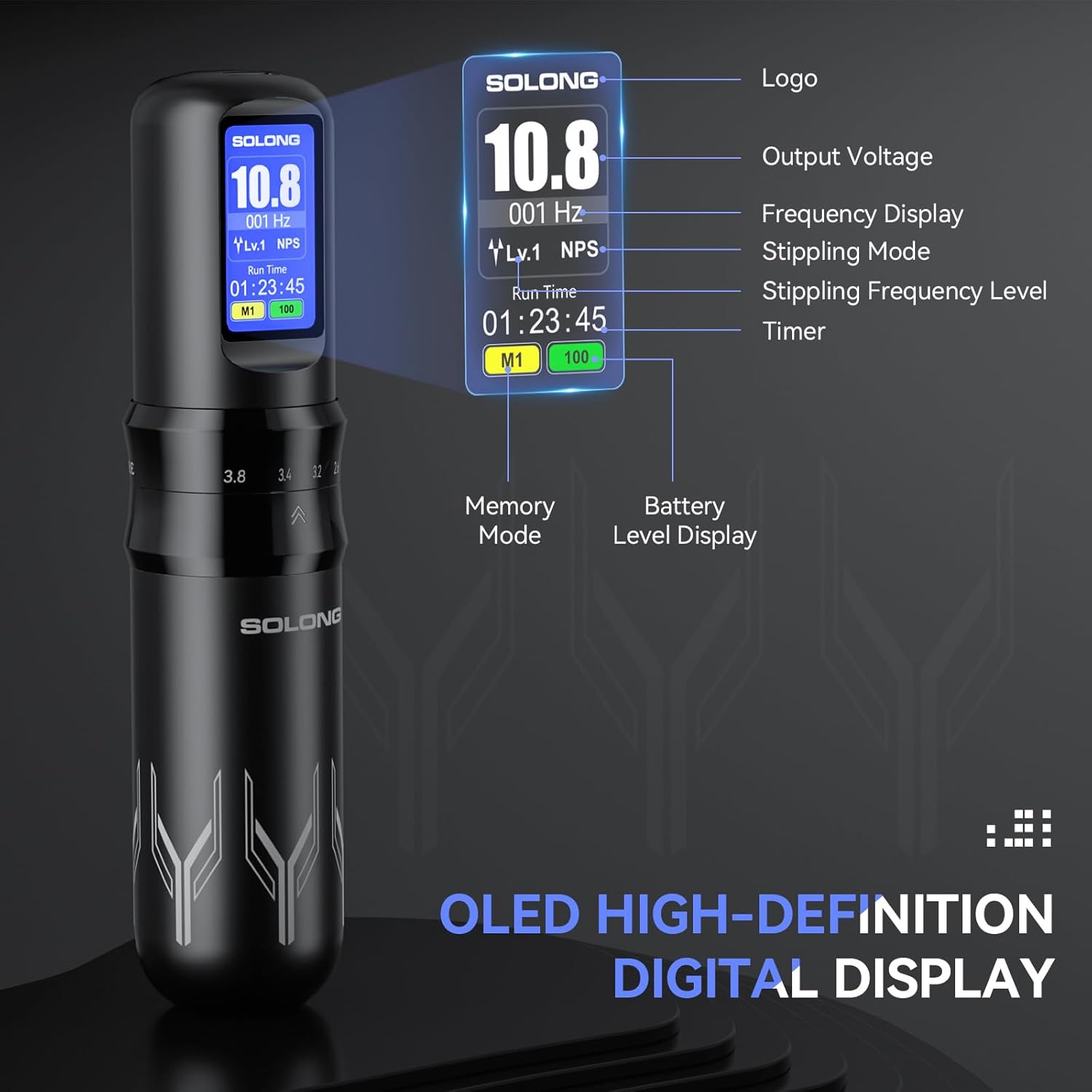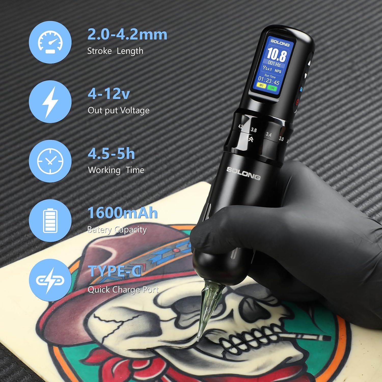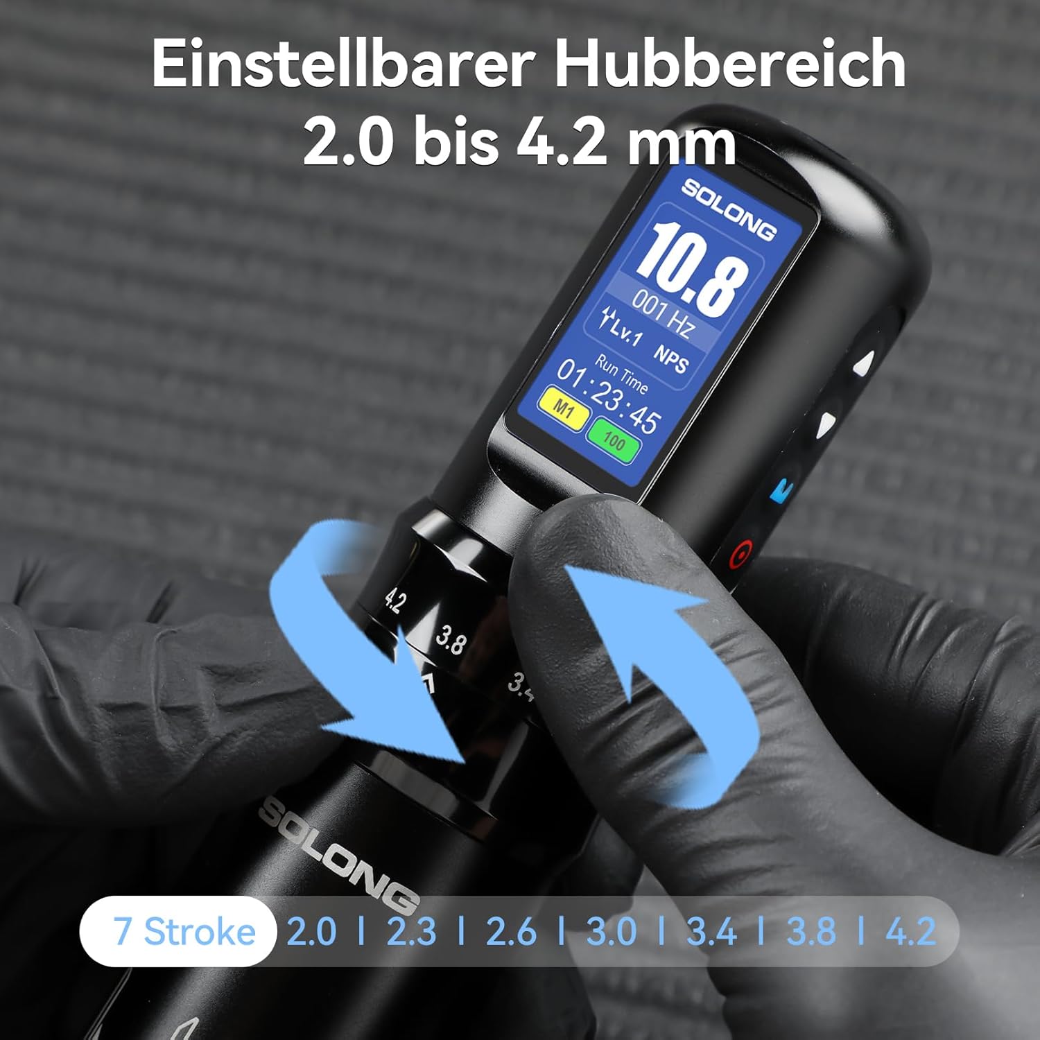 Gamma di corsa regolabile: 2,0-4,2 mm - Padroneggia ogni tecnica con 7 lunghezze di corsa regolabili (2,0-4,2 mm) e sperimenta versatilità e libertà creativa senza precedenti. Regola con precisione la tua macchinetta per tatuaggi, dai sottili liner da 2,0 mm agli ampi shader da 4,2 mm, per qualsiasi stile o tecnica. Passa facilmente da contorni netti a ombreggiature tenui, da colori vivaci a dettagli intricati, senza cambiare macchina. L'unica macchinetta per tatuaggi di cui hai bisogno per ottenere disegni perfetti, da linee delicate a riempimenti intensi e saturi. Macchina per tatuaggi digitale LCD: dotata di un display di facile lettura, che fornisce informazioni in tempo reale e consente una regolazione precisa del tempo di lavoro, della tensione, della velocità e della corsa dell'ago. Utilizzo semplificato grazie al cambio modalità one-touch. Ecologico: dotato di un motore brushless a coppia elevata personalizzato. Offre alta velocità, funzionamento silenzioso, prestazioni stabili, basso consumo energetico e potenza elevata senza surriscaldamento durante l'uso prolungato. Durata prolungata della batteria: alimentato da batterie al litio ad alte prestazioni da 1600 mAh con tecnologia di ricarica rapida (ricarica completa in 2 ore). Il tempo di esecuzione può raggiungere 5-6 ore, fornendo potenza stabile per lunghe sessioni. Durata prolungata della batteria: alimentato da batterie al litio ad alte prestazioni da 1600 mAh con tecnologia di ricarica rapida (ricarica completa in 2 ore). Il tempo di esecuzione può raggiungere 5-6 ore, fornendo potenza stabile per lunghe sessioni. Accessori completi: include 20 cartucce per tatuaggi usa e getta di diversi tipi; un flacone da 30 ml di inchiostro nero professionale e 7 flaconi da 5 ml di inchiostri colorati. Il kit comprende anche carta trasferibile, pratica skin, istruzioni, coperchio della maniglia e calamai.