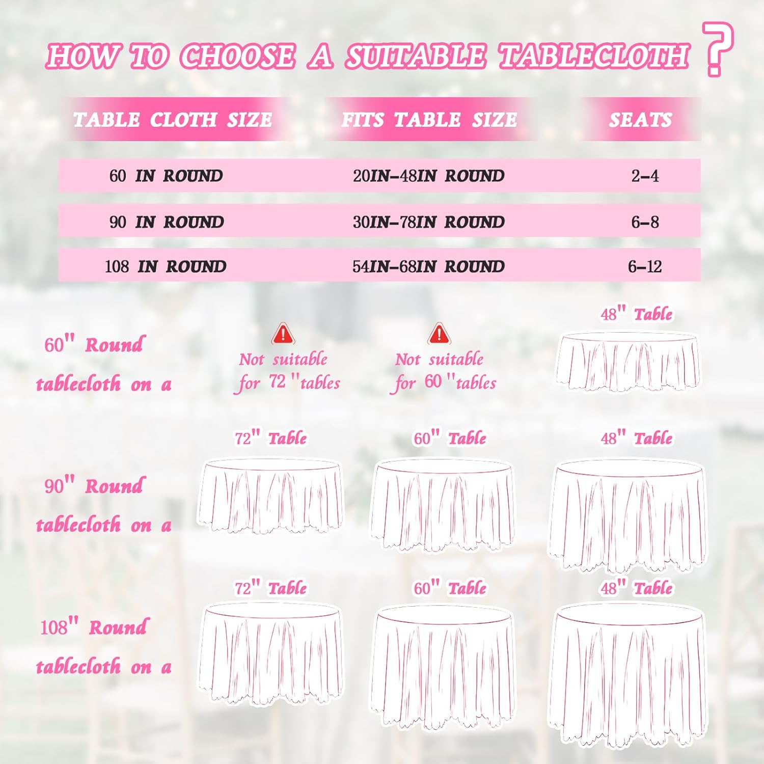 Tessuto satinato: la tovaglia è realizzata al 100% in poliestere (tessuto satinato), con superficie liscia e delicata, morbida e confortevole, non facile da sbiadire, restringere, deformare e resistente. 【Design Unico】Le tovaglie rotonde adottano un design sigillante con bordi ondulati, che fornisce un'eccellente luminosità e una sensazione di cedimento. È uno stile classico con un tocco di lusso e può essere abbinato a cuscini da tavola e tovaglioli per proteggere la tua preziosa tavola da graffi e macchie e aggiungere un tocco di luminosità alla tua casa. Facile da pulire: la tovaglia rotonda può essere lavata in lavatrice e a mano, facilitando la pulizia e l'asciugatura. Dopo la pulizia, asciugare a bassa temperatura, preferibilmente stirare per mantenere la pulizia, facile da pulire e abbastanza soffice, con un bell'aspetto. 【Scenari ampiamente utilizzati】 La tovaglia rotonda è adatta per feste di matrimonio, balli, banchetti, feste di compleanno, tavoli di ristoranti, feste di laurea e tavoli da pranzo giornalieri. Può essere utilizzato anche come decorazione per Halloween, Natale e San Valentino. 【Dimensioni multiple】 Tre dimensioni tra cui scegliere (152,4 cm, 228,6 cm, 274,3 cm) per soddisfare le diverse esigenze. Prima dell'acquisto, puoi controllare la tabella delle taglie per confermare la taglia e l'effetto desiderato.