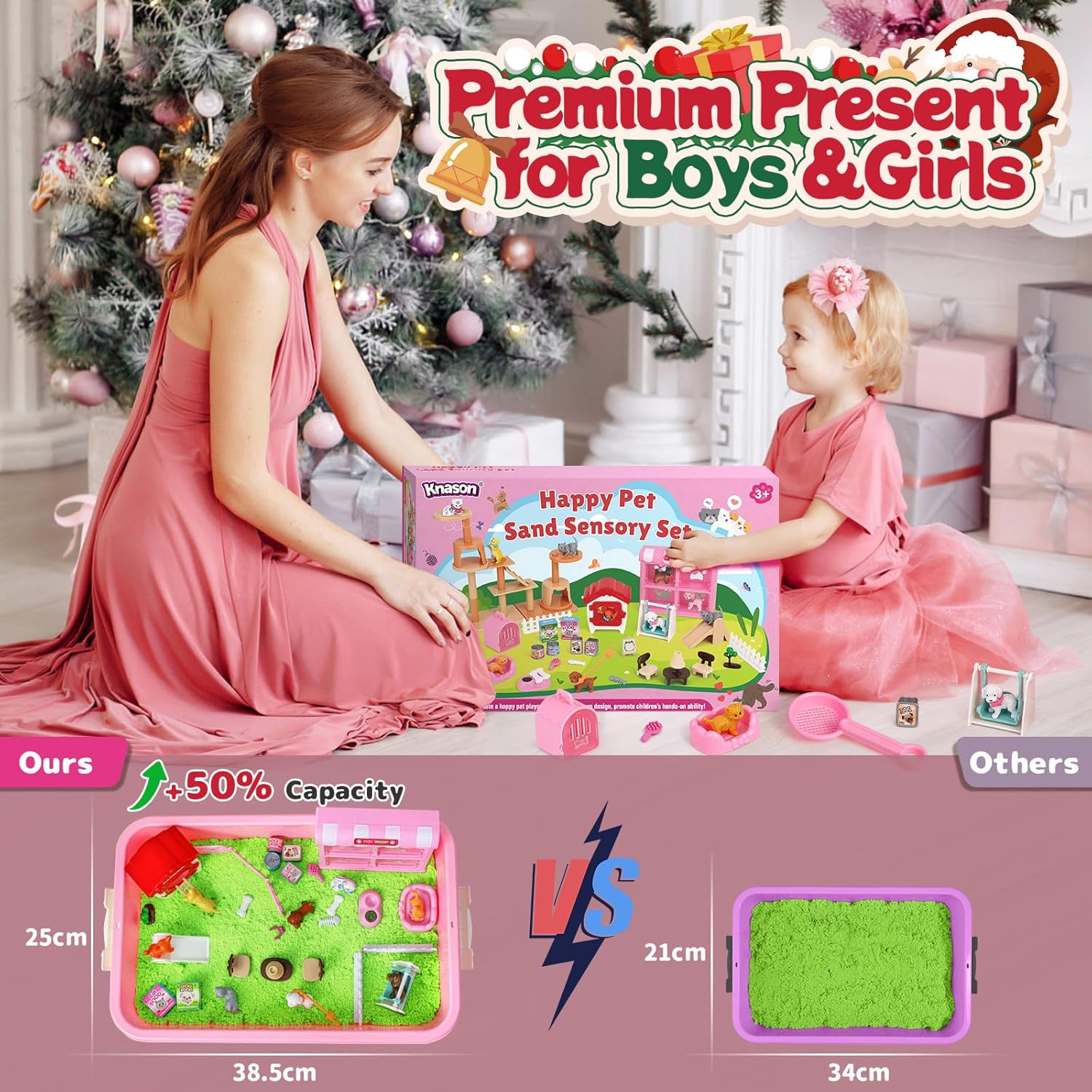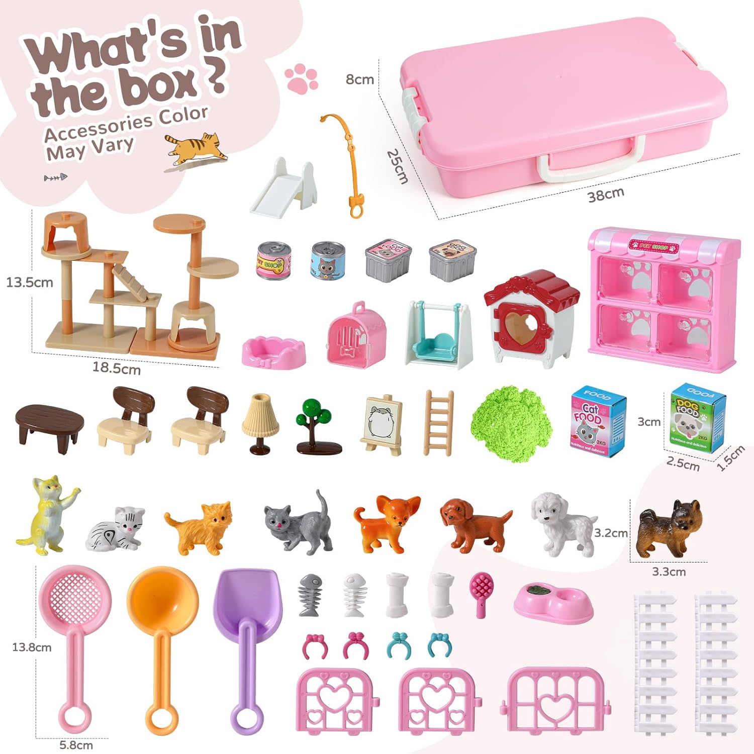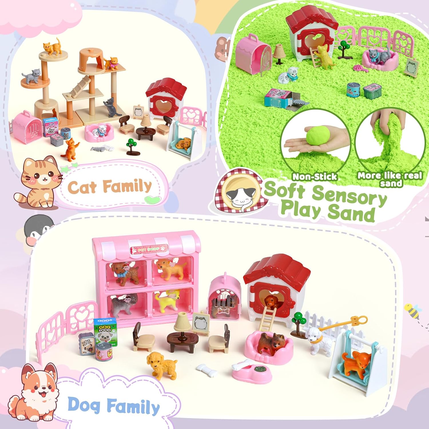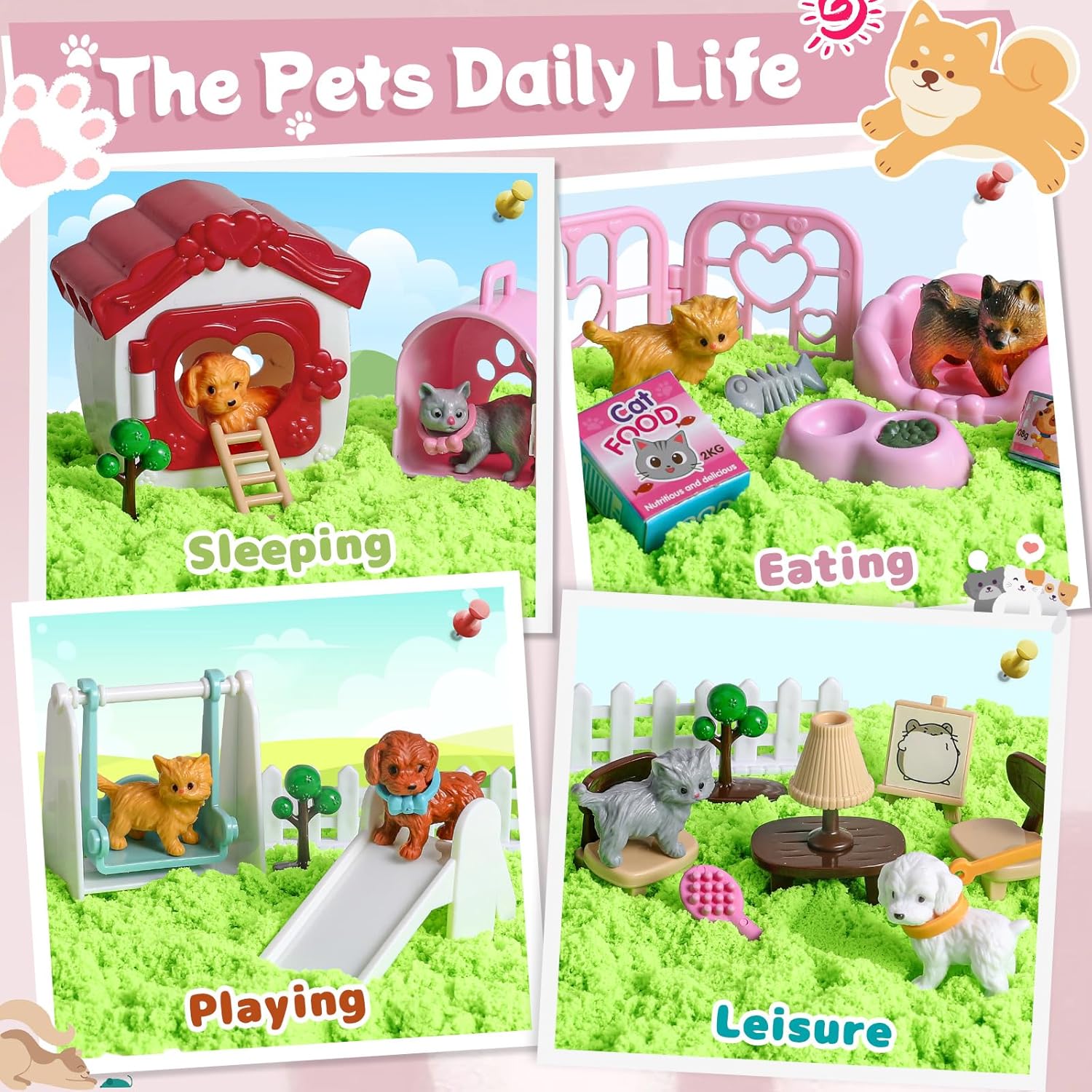 Sabbia Cinetica per Cani e Gatti: Questo sabbia magica per bambini comprende 4 statuette di gatto, 4 statuette di cane, 900 g di sabbia sensoriale colorata, 1 arrampicatore per gatti, 1 casa per cani, 2 case per animali, 3 strumenti di sabbia, 1 scivolo, 1 altalena e così via. Questi accessori da 50 pezzi consentono ai bambini di trascorrere più tempo a giocare in modo divertente. Sabbia Cinetica Modellabile: Questa sabbia colorata ha la consistenza e la fluidità della sabbia normale e si incastra magicamente per essere pulita facilmente. Non è appiccicosa, non si asciuga ed è adatta a bambini e bambine per il gioco di finzione, l'arte della sabbia e l'artigianato per bambini. Imparare più Abilità: Questo sabbia cinetica per bambini per realizzare il sogno di prendersi cura di un animale domestico. Possono esplorare e imparare attraverso i loro sensi e costruire le loro abilità linguistiche, la motricità fine, le abilità sociali, la coordinazione occhio-mano e promuovere il lavoro di squadra dei bambini. Facile da Pulire e Conservare: I giocattoli della sabbiera sono adatti per il gioco sensoriale senza disordine! Questo sabbia cinetica bambini 3 anni aiutano i bambini a giocare in casa o all'aperto in qualsiasi momento. Inoltre, questa sabbiera con coperchio è un contenitore per riporre e trasportare facilmente i giocattoli. Regalo Perfetto per i Vostri Bambini: Questo sabbia cinetica bambini 5 anni è disponibile per tenere i bambini felici e occupati per ore. È dotato di una confezione raffinata ed è un regalo ideale per bambini e bambine di 3 4 5 6 7 8 9 anni in occasione di compleanni, Halloween, Natale e qualsiasi altra occasione.