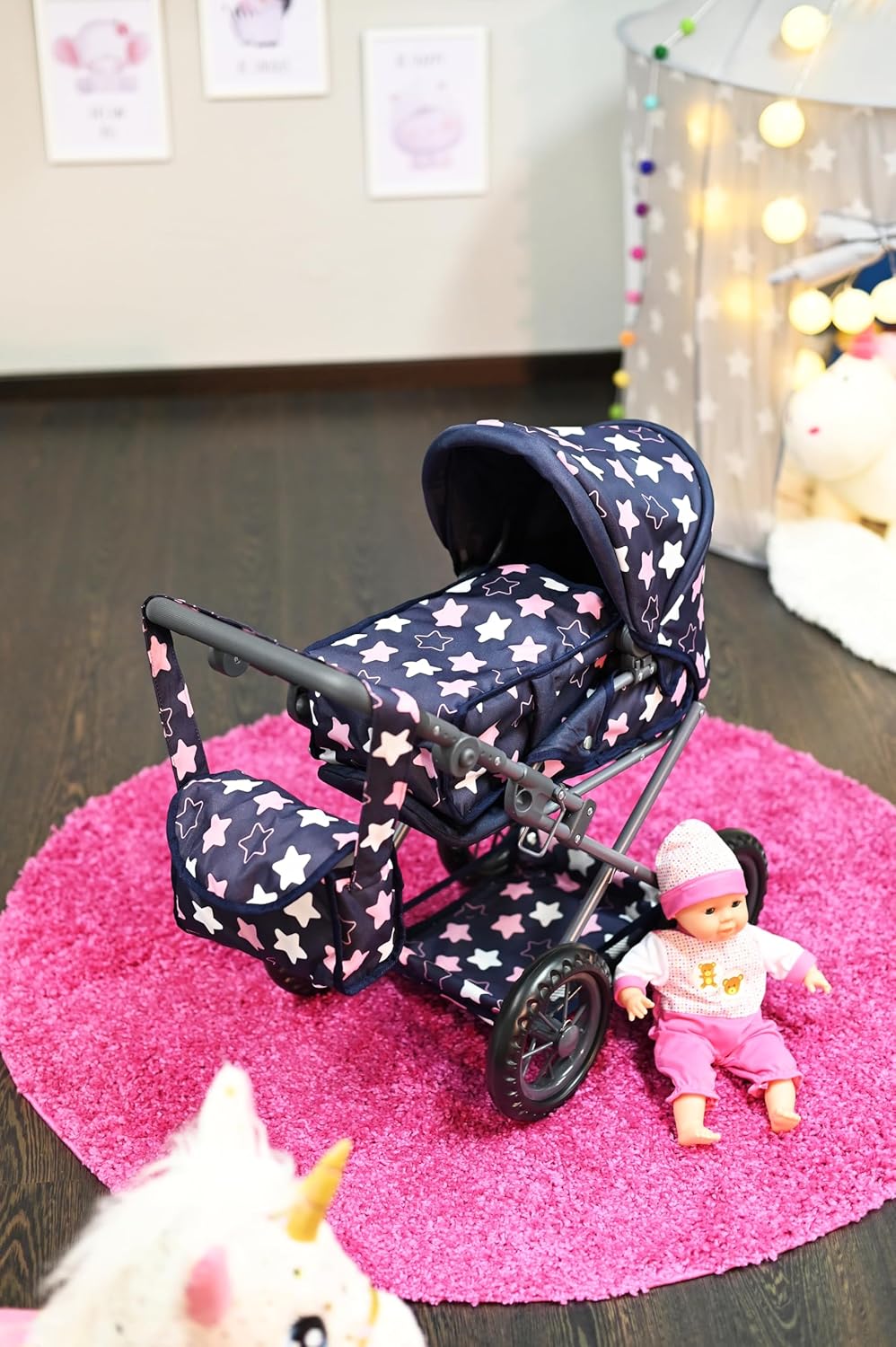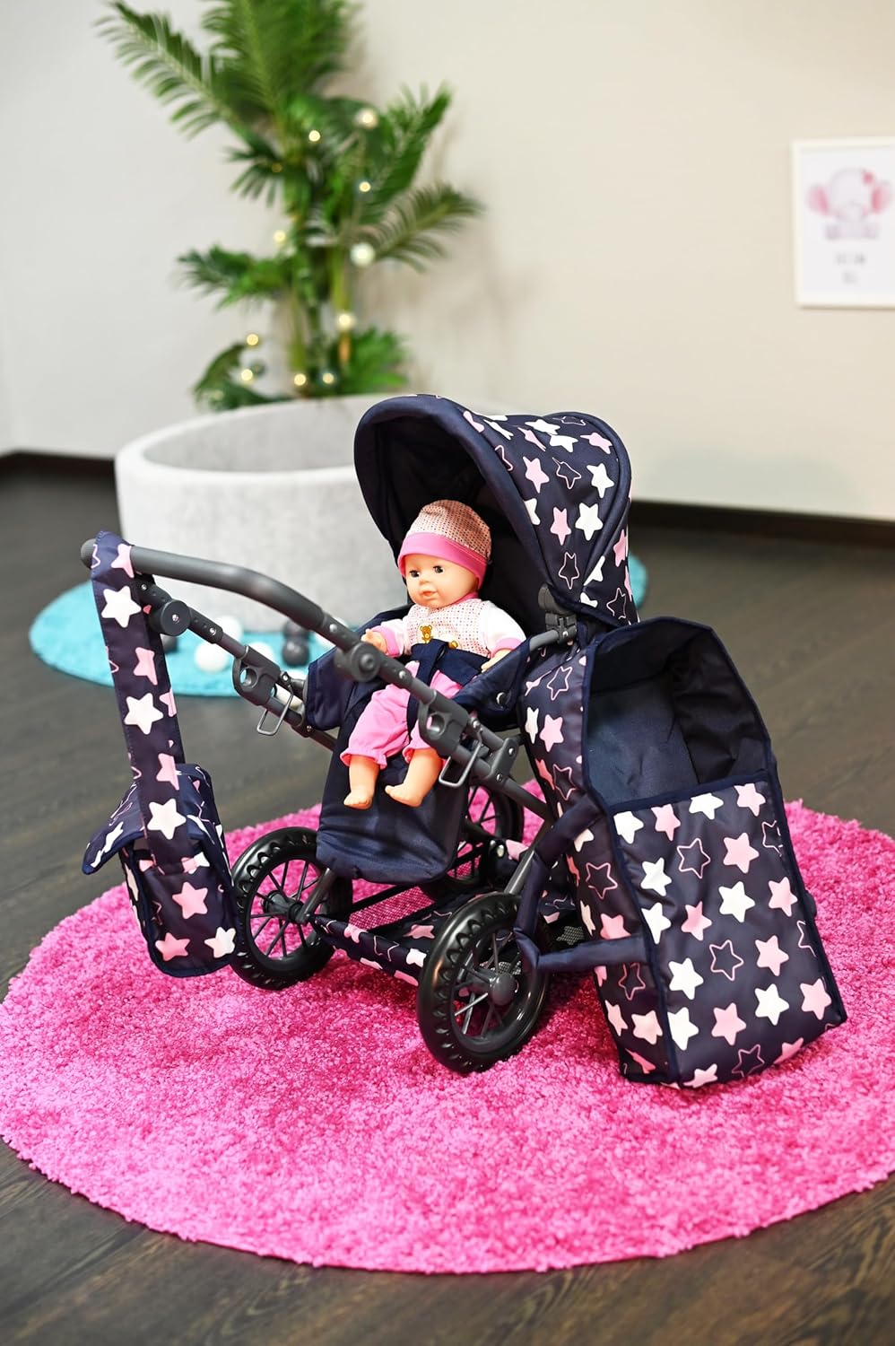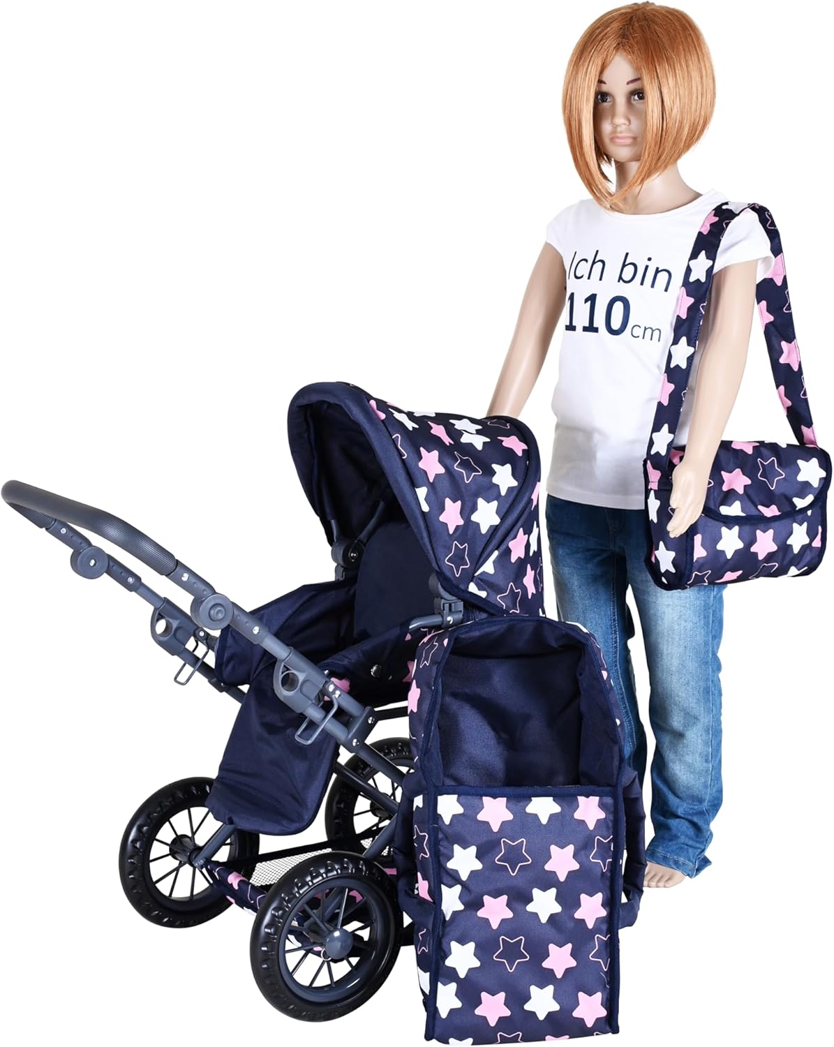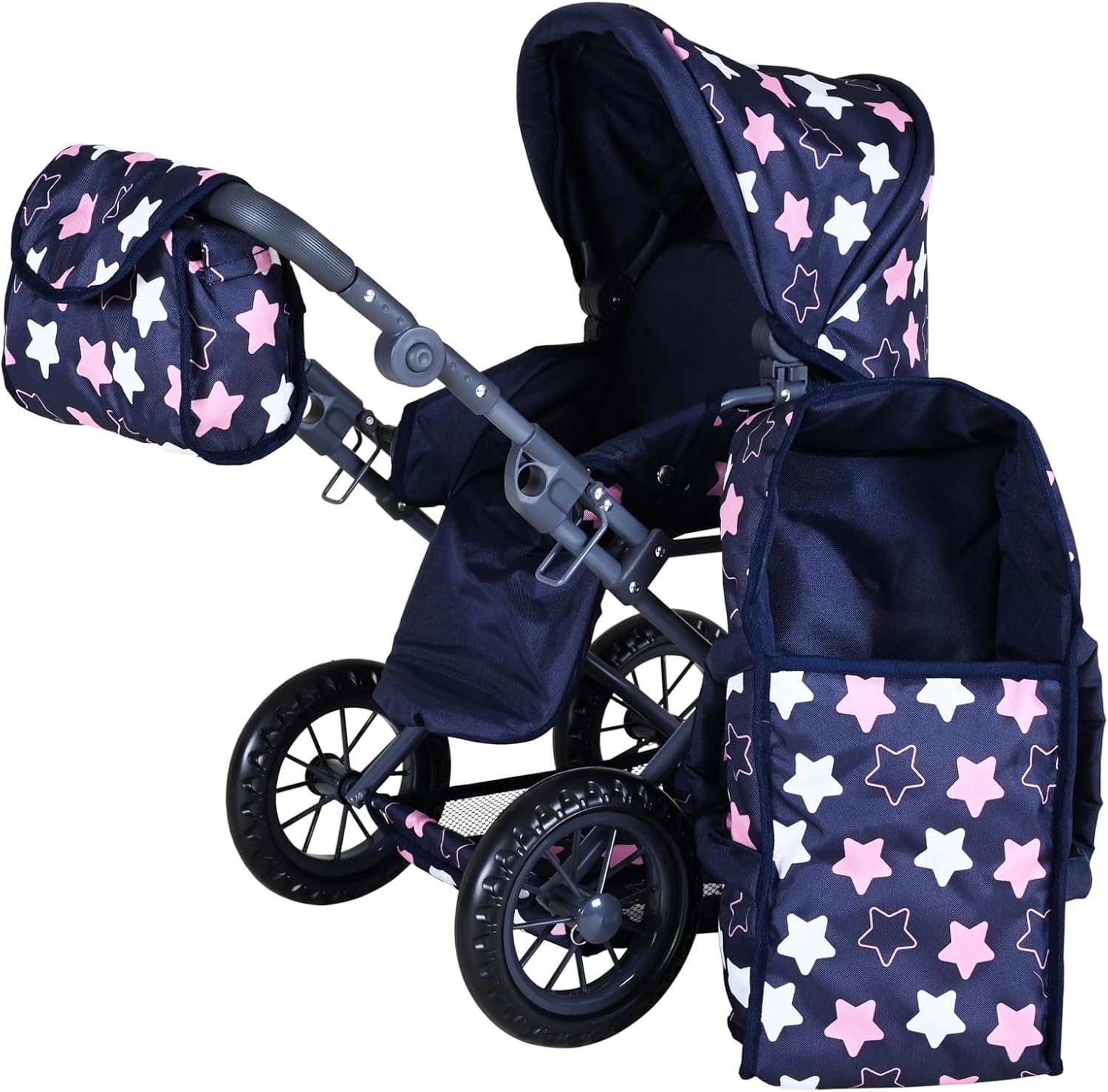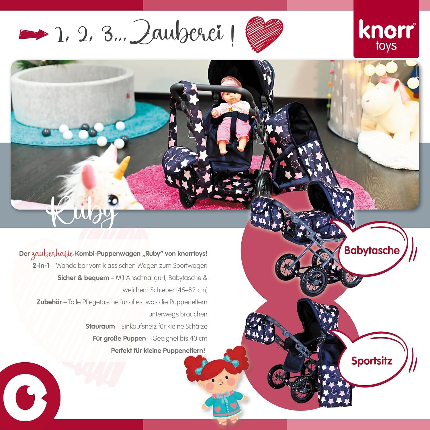 Possibilità di trasformazione in auto sportiva Include borsa per il trasporto e la manutenzione e cursore regolabile in alto (circa 34-62 cm) Per bambole fino a circa 40 cm