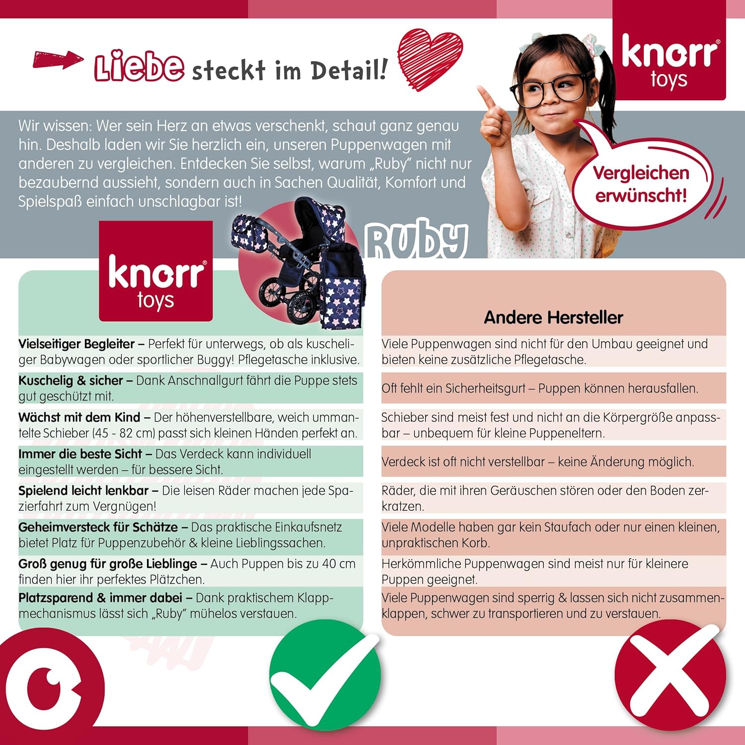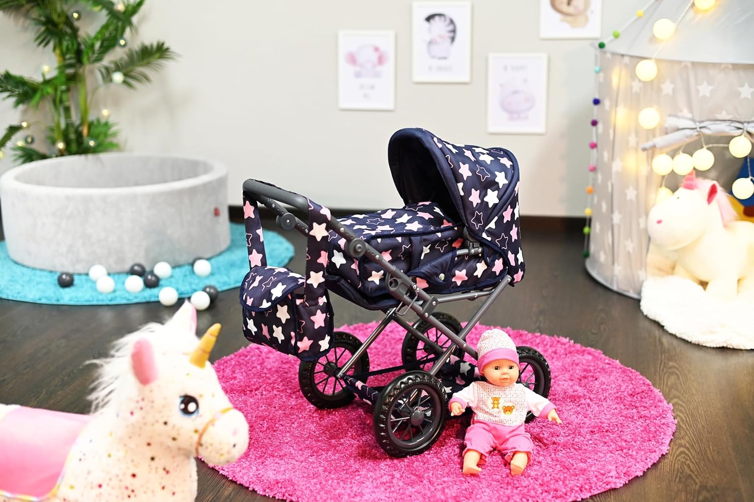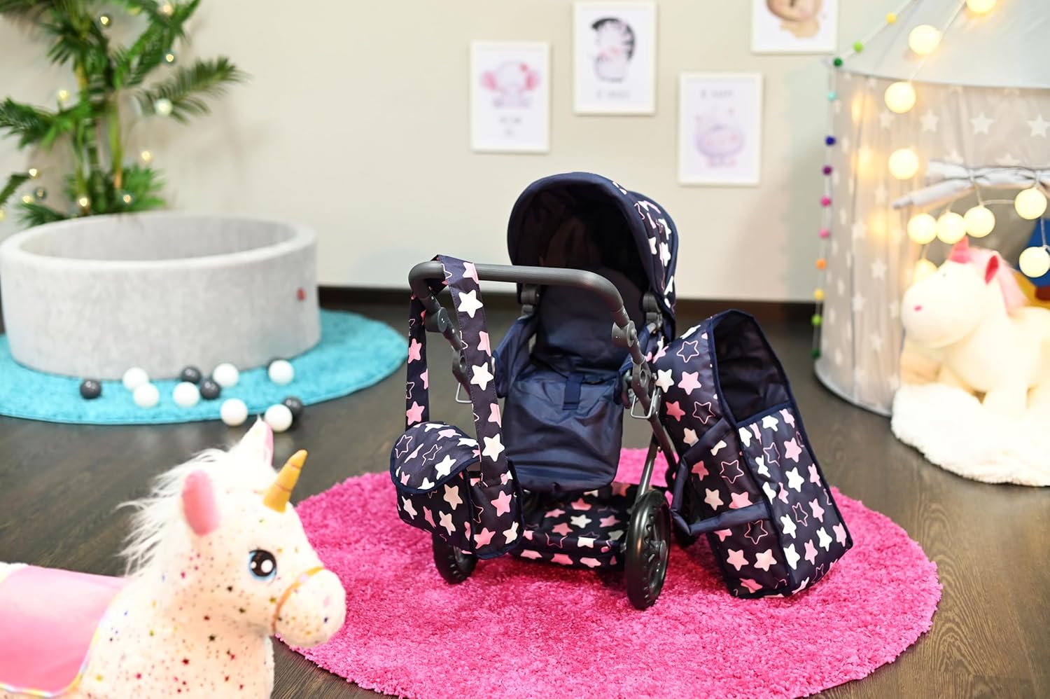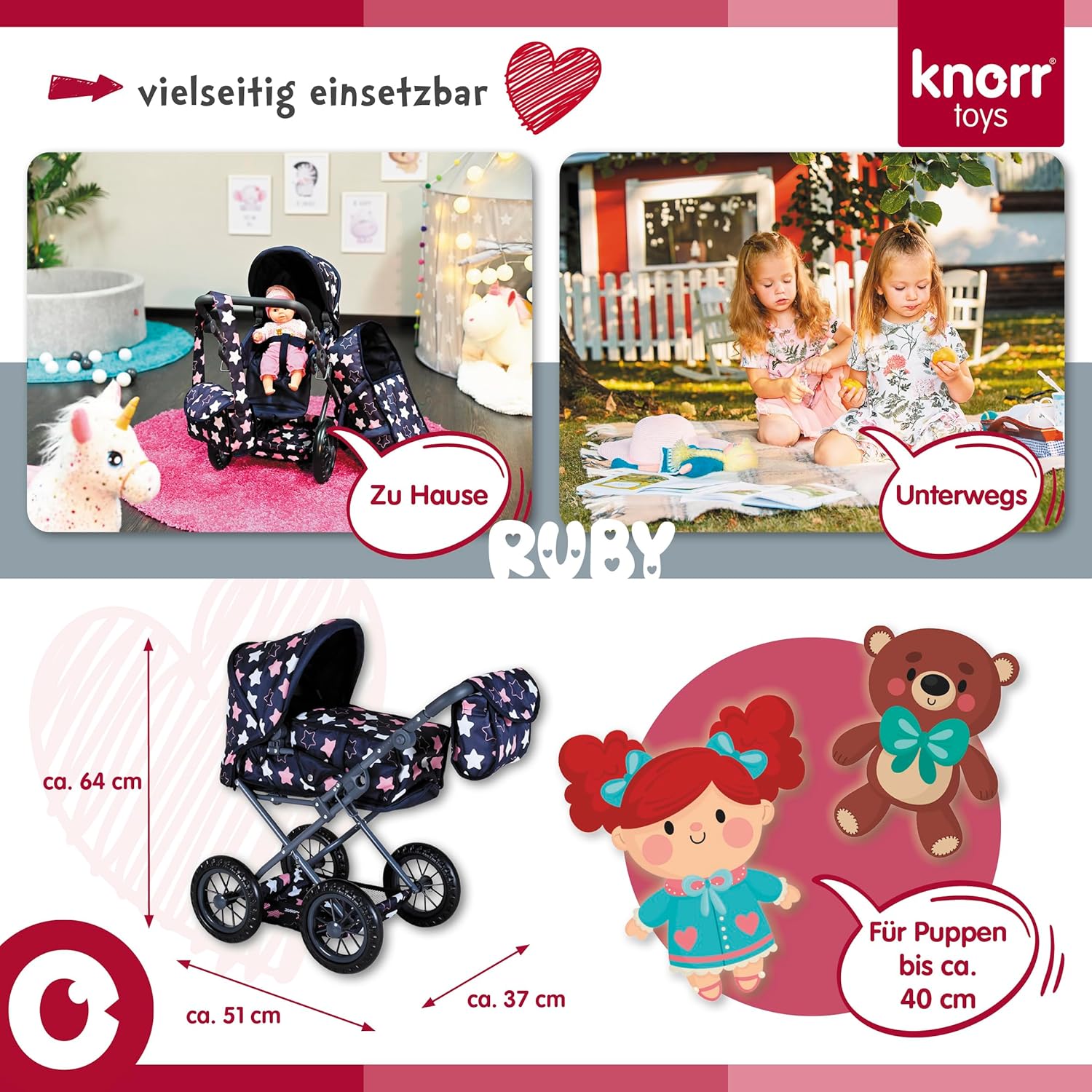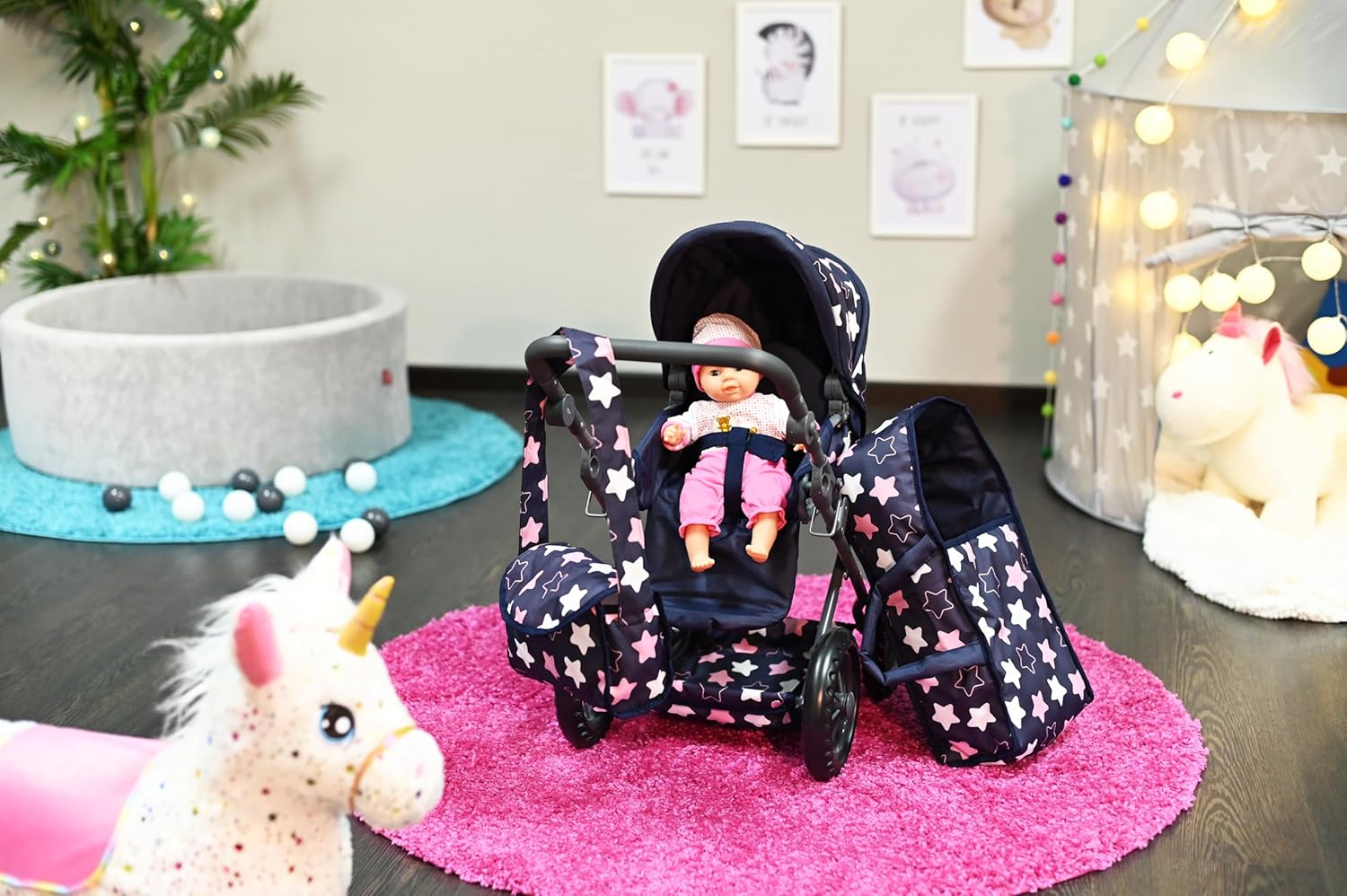 Possibilità di trasformazione in auto sportiva Include borsa per il trasporto e la manutenzione e cursore regolabile in alto (circa 34-62 cm) Per bambole fino a circa 40 cm