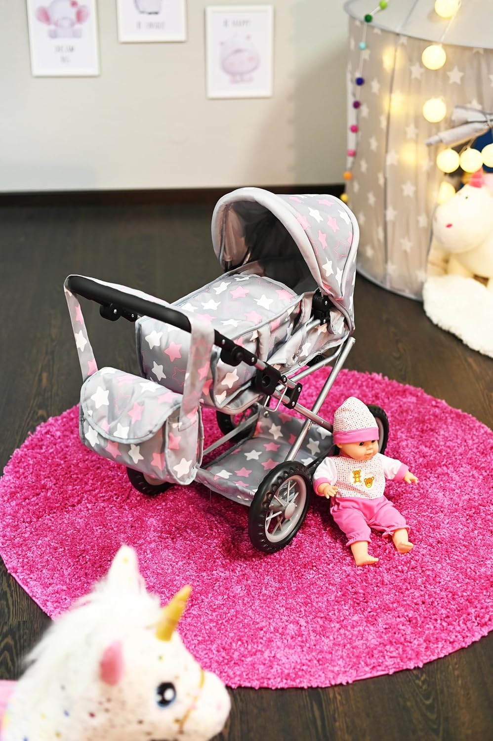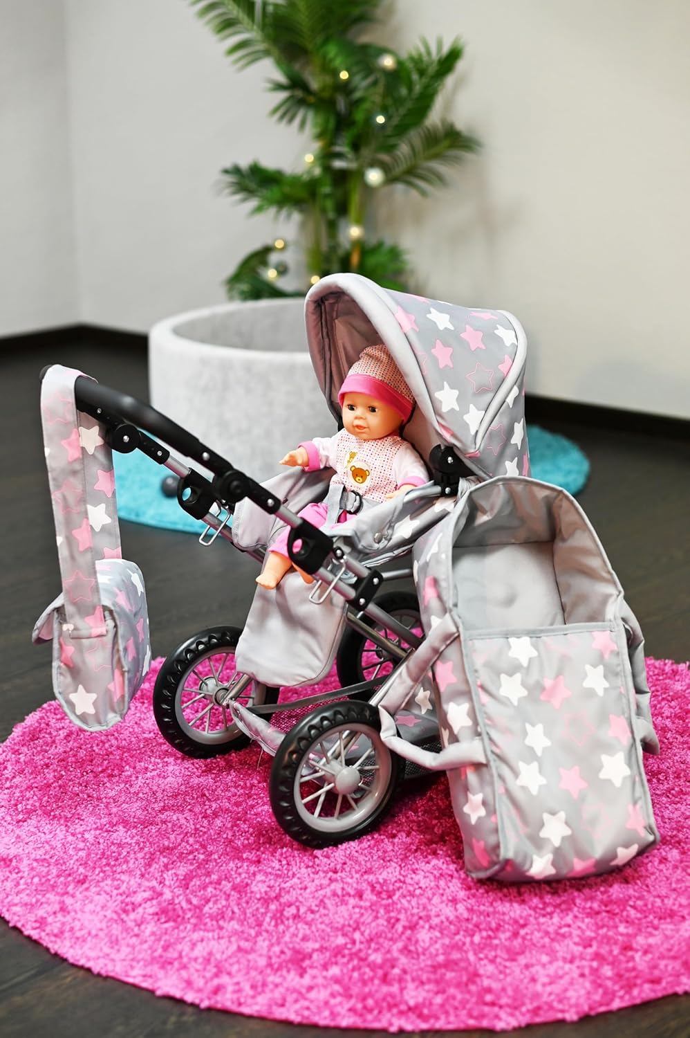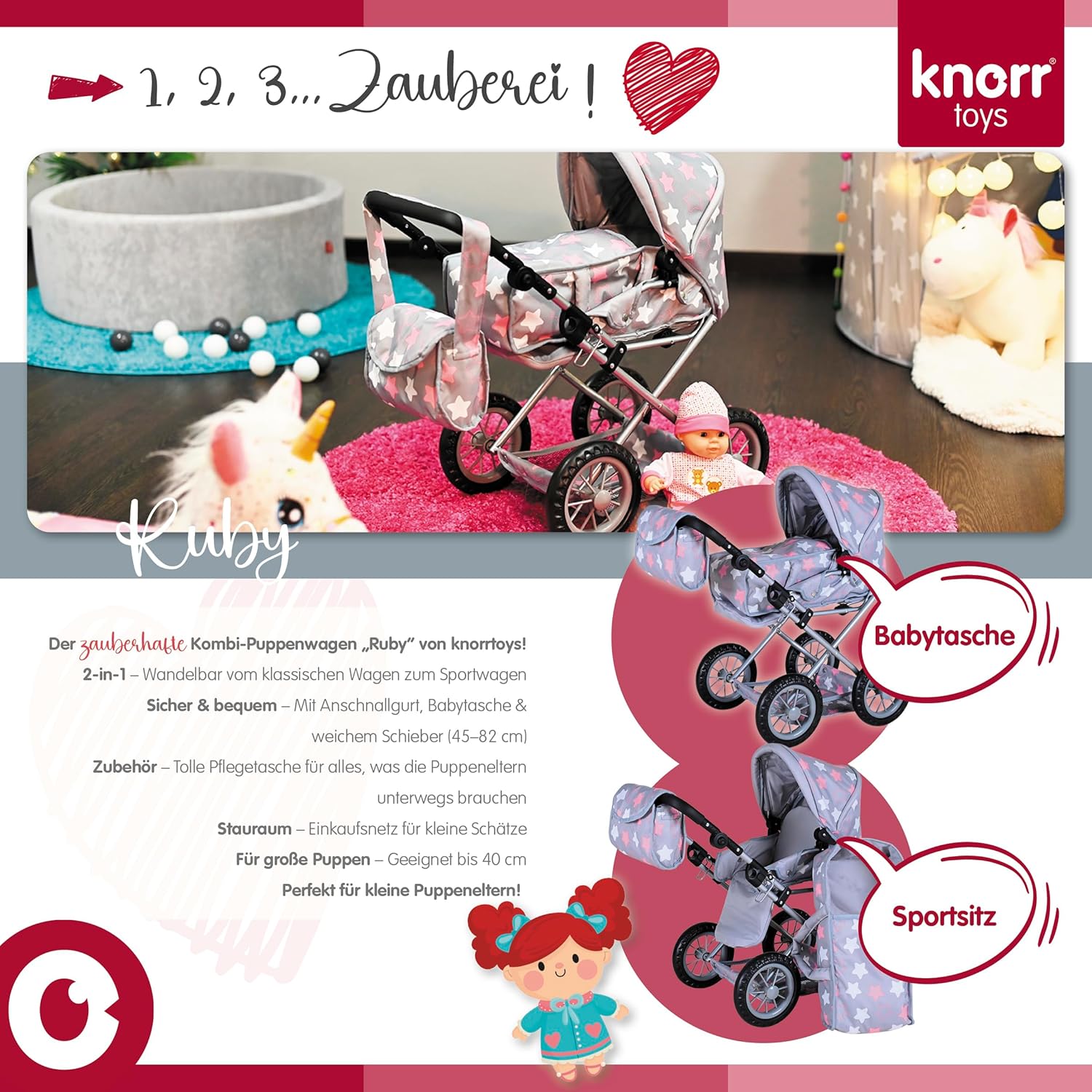 Possibilità di trasformazione in auto sportiva Include borsa per il trasporto e la manutenzione e cursore regolabile in alto (circa 34-62 cm) Per bambole fino a circa 40 cm