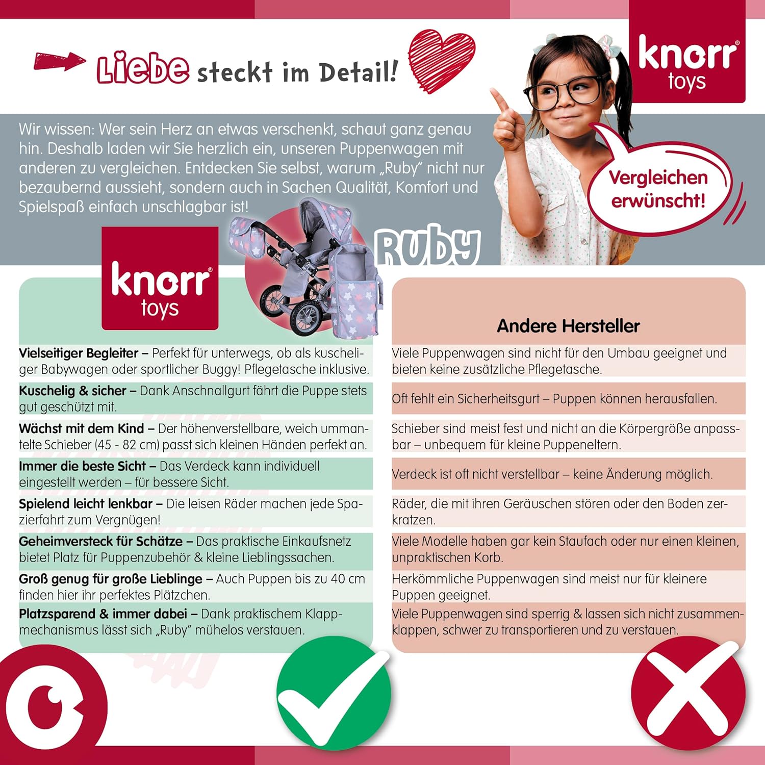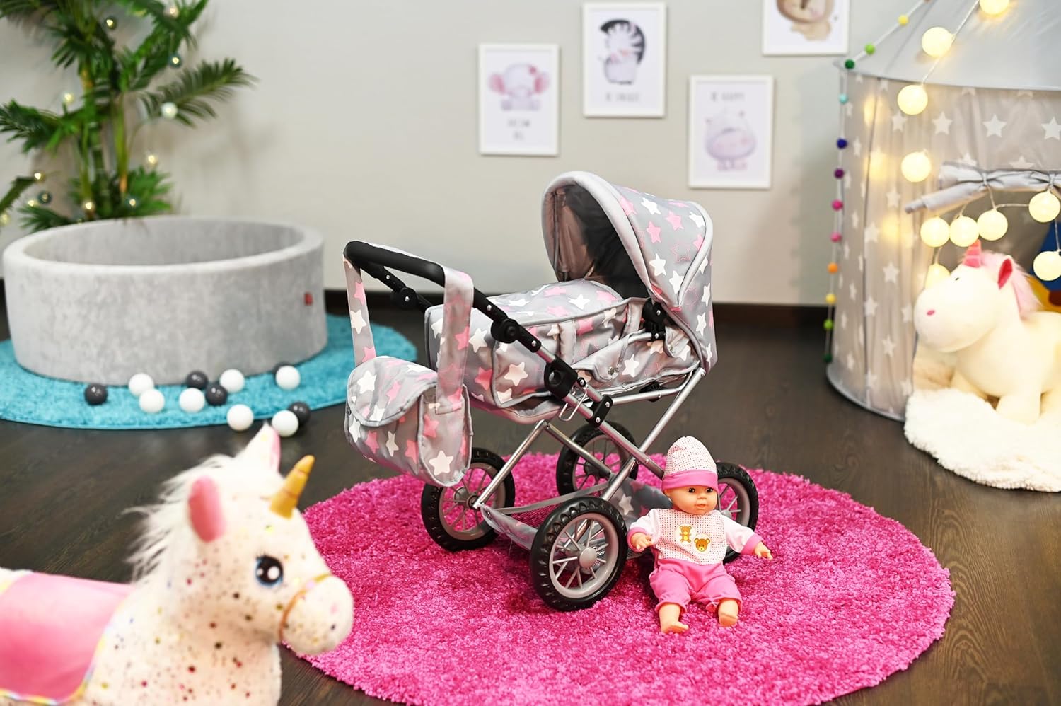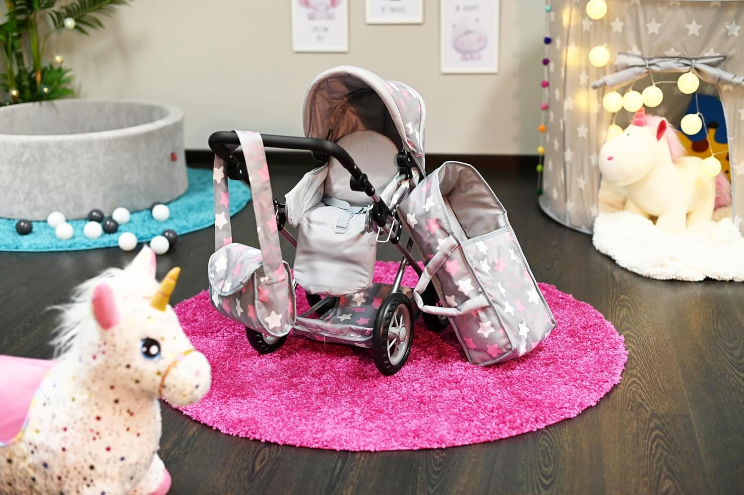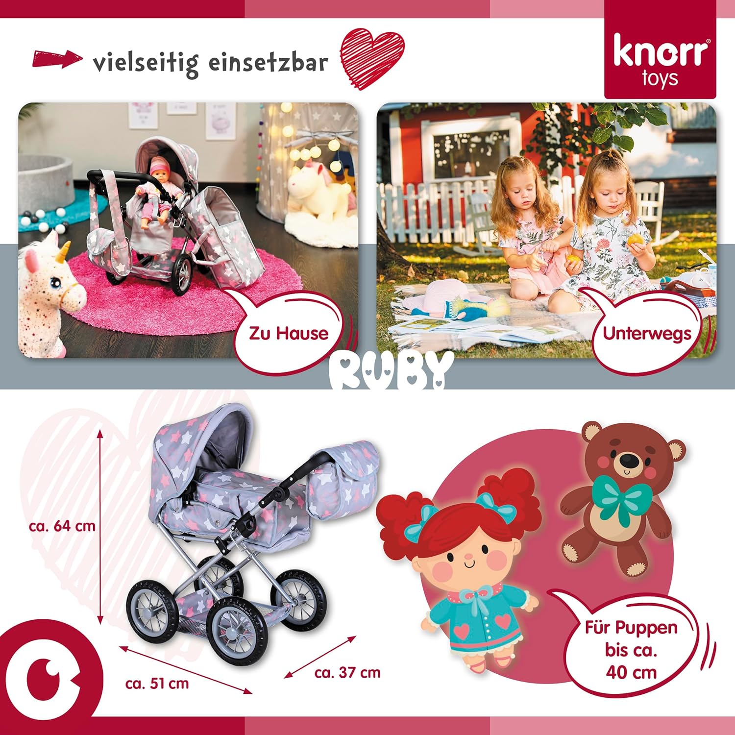 Possibilità di trasformazione in auto sportiva Include borsa per il trasporto e la manutenzione e cursore regolabile in alto (circa 34-62 cm) Per bambole fino a circa 40 cm