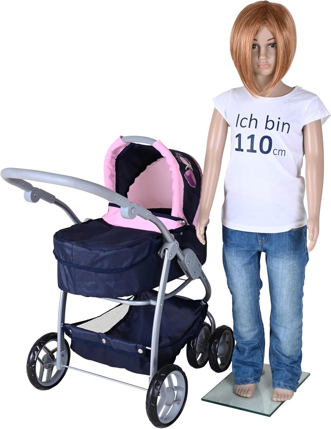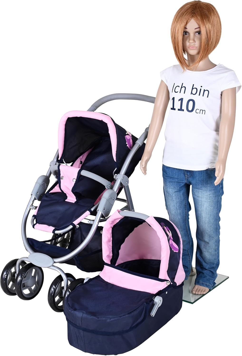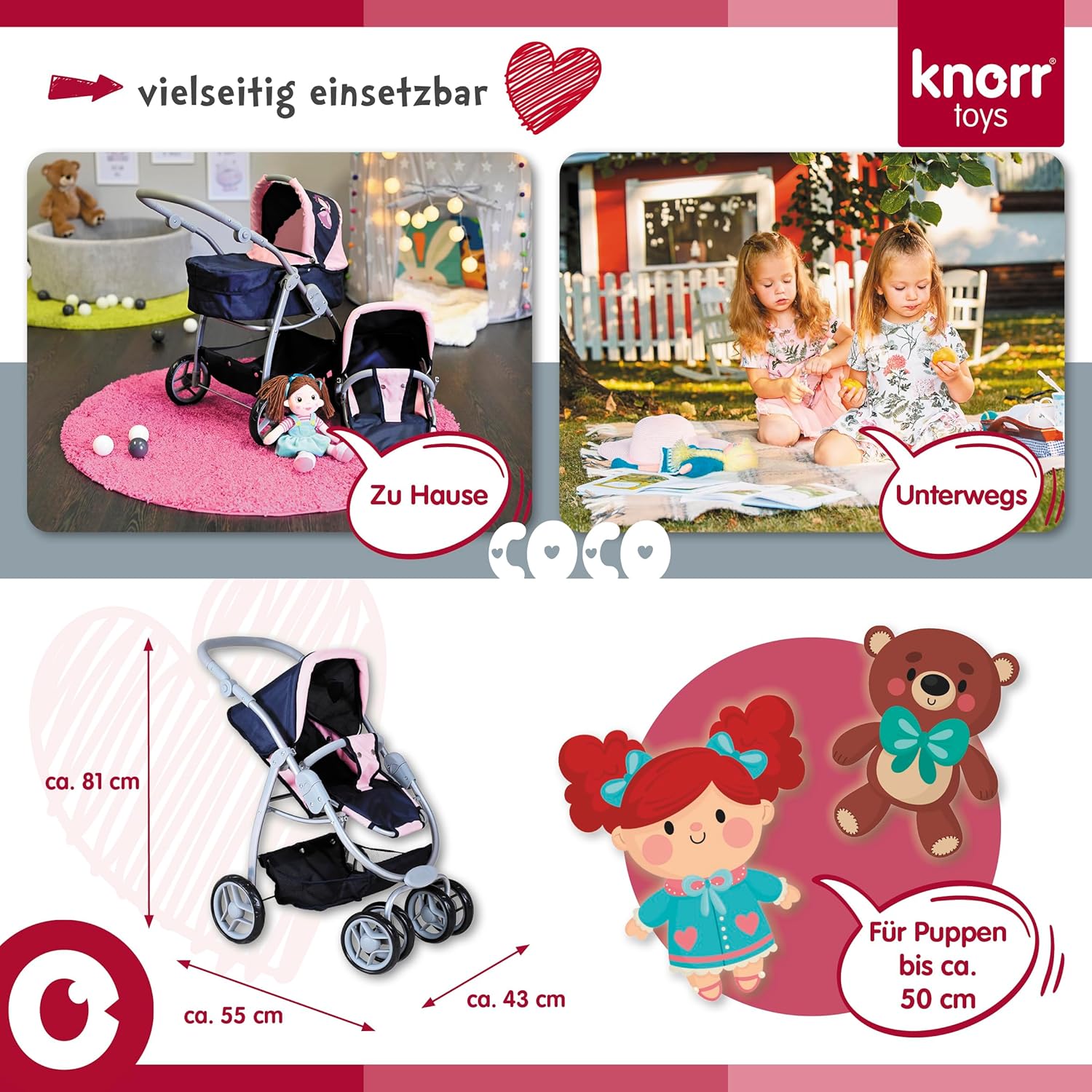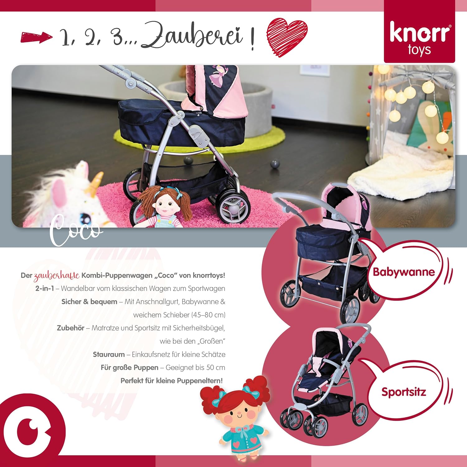 Possibilità di trasformazione in auto sportiva Tettuccio regolabile e maniglione regolabile in altezza con rivestimento morbido (circa 45-80 cm) Per bambole fino a circa 50 cm