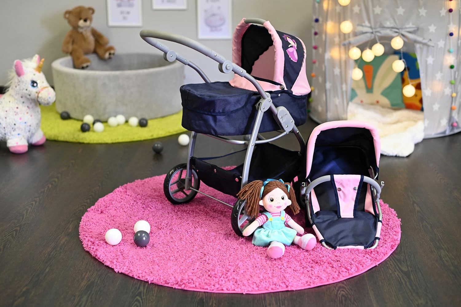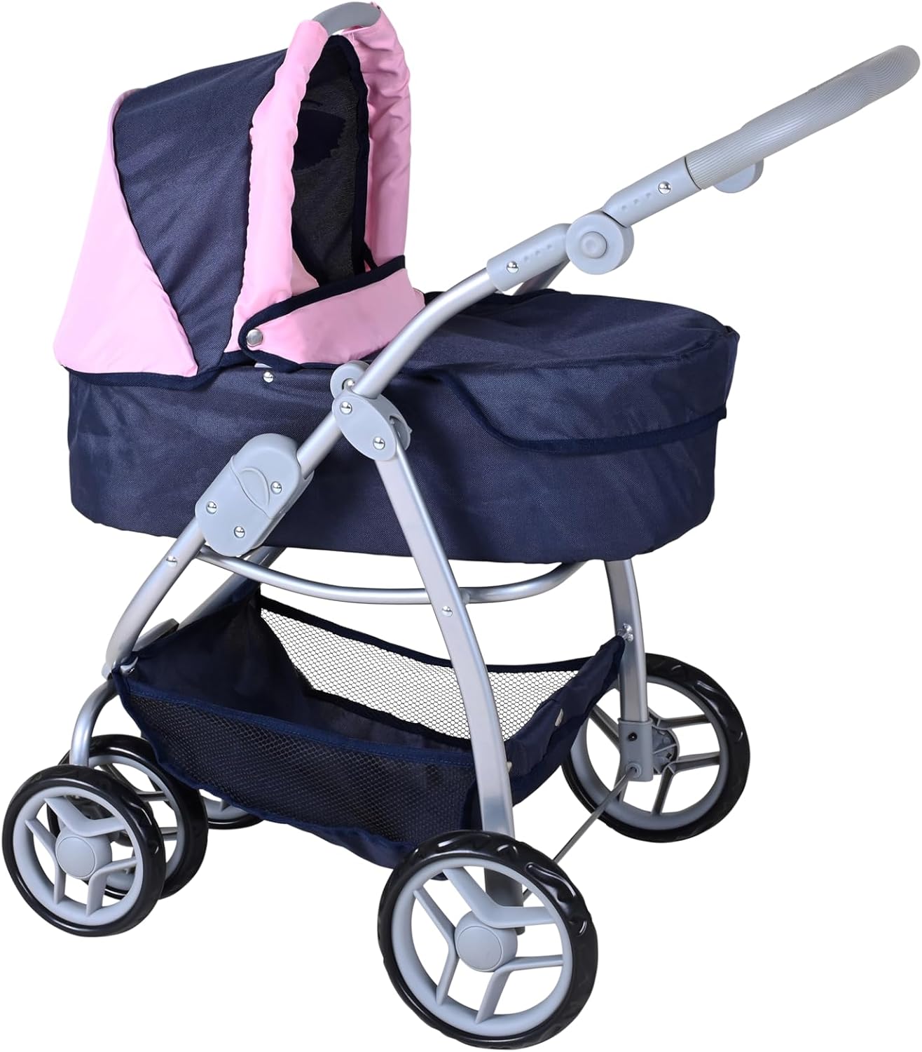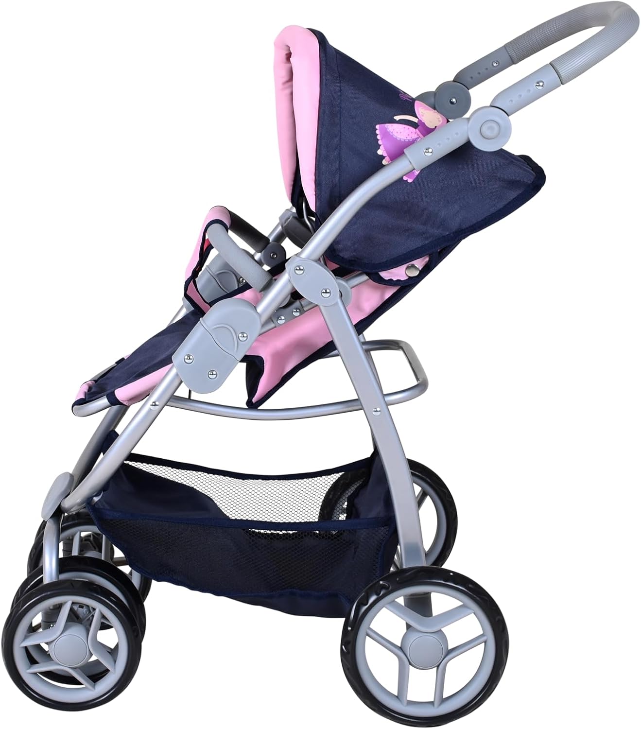 Possibilità di trasformazione in auto sportiva Tettuccio regolabile e maniglione regolabile in altezza con rivestimento morbido (circa 45-80 cm) Per bambole fino a circa 50 cm