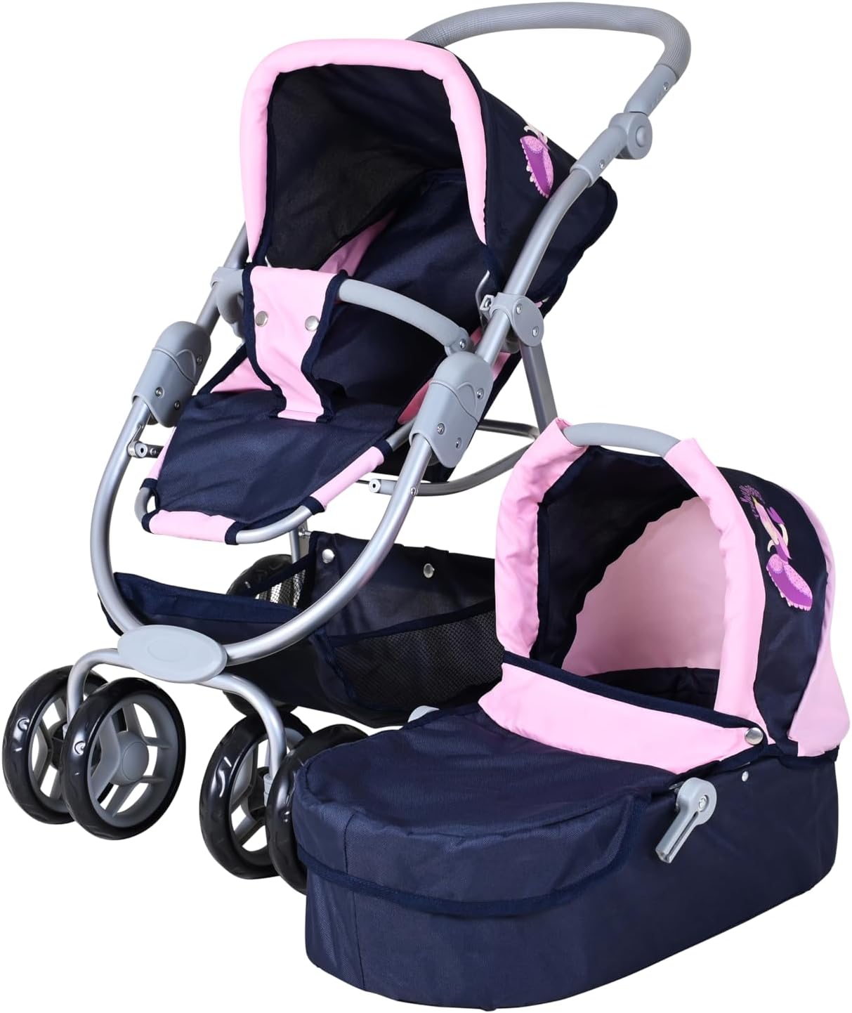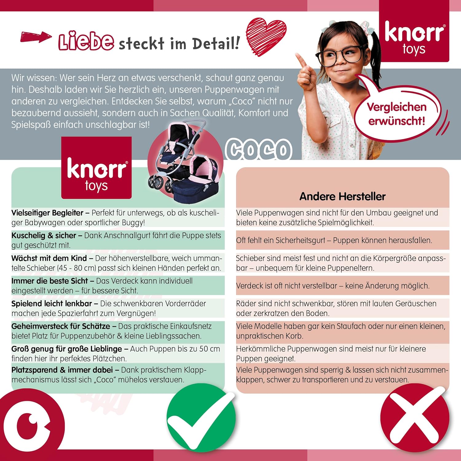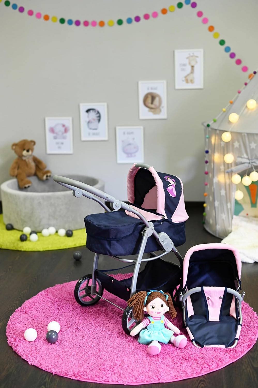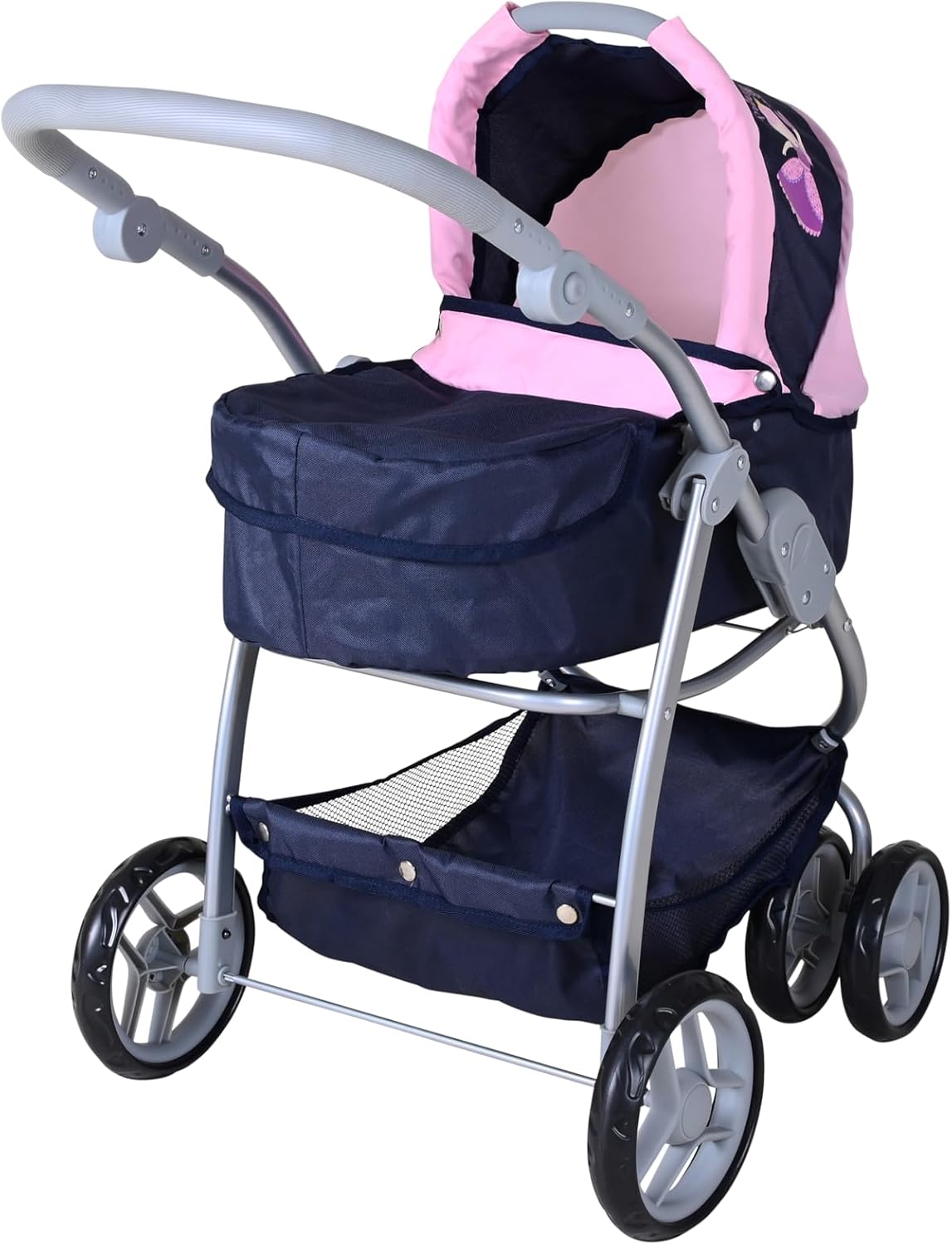 Possibilità di trasformazione in auto sportiva Tettuccio regolabile e maniglione regolabile in altezza con rivestimento morbido (circa 45-80 cm) Per bambole fino a circa 50 cm