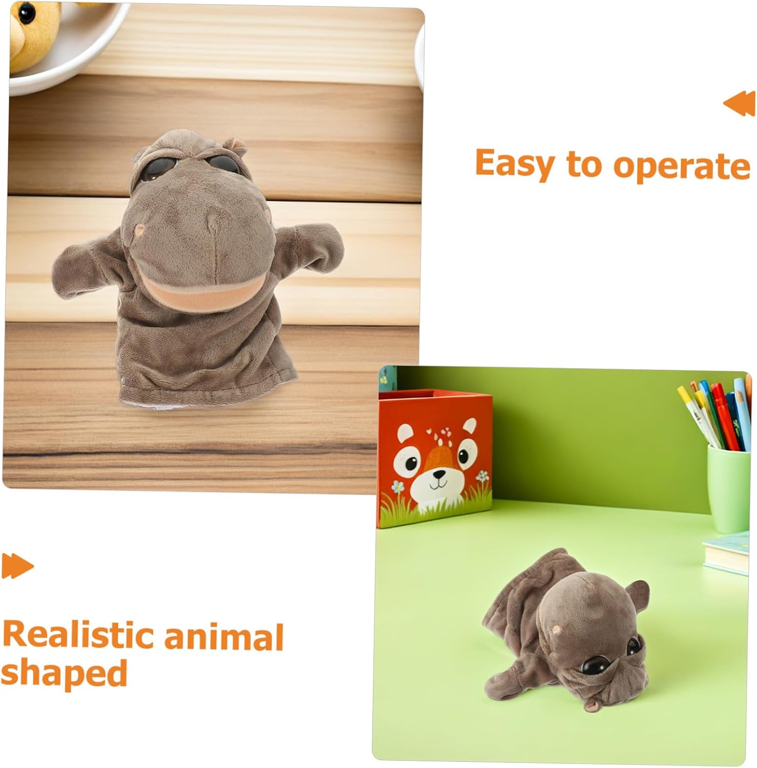Strumenti di sviluppo: burattini a mano per supportare lo sviluppo iniziale, migliorare le capacità di comunicazione e narrazione in un ambiente divertente, pupazzi interattivi, movimento espressivo di ippopotami di peluche: burattini a mano per un meccanismo realistico della bocca per la narrazione espressiva, dare vita a scene di fiabe con pupazzi, animali di peluche interattivi, pupazzi di animali da dito Comfort e portabilità: i pupazzi di peluche sono realizzati con materiali morbidi e abbastanza leggeri per essere maneggiati facilmente, a casa, all'asilo o durante le gite all'aperto. Burattino a mano interattivo, gioco di burattini a mano per l'ispirazione del gioco di ruolo: il nostro peluche a forma di burattino a forma di animale è progettato per l'uso interattivo come burattino giocattolo, migliorando le abilità di burattinaio e incoraggiando la creatività nei bambini di tutte le età. Bambola di peluche, bambola di peluche Apprendimento creativo: burattini a mano con animali e marionette da dito dei cartoni animati ti incoraggiano a inventare storie, migliorare le tue abilità linguistiche e conoscere gli animali in modo giocoso, giochi di ruolo con marionette e bambole di peluche