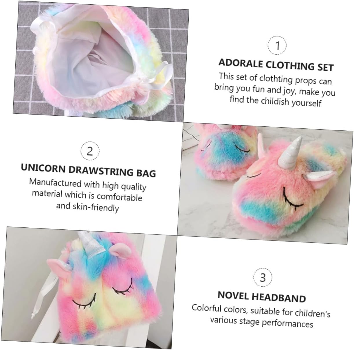 Borsa con cordoncino per unicorno: con questo set di costumi, puoi interpretare il ruolo di un unicorno sul palco, copricapo squisito Oggetti di scena per costumi da unicorno: realizzati in materiale con manico e senza paura di ammaccature, pantofole calde Oggetti di scena per cosplay di cartoni animati: possono essere utilizzati per tutte le occasioni speciali come feste in maschera, feste, costumi, ecc., accessori per costumi da unicorno Copricapo del costume: adorabile design di unicorno, tutti gli accessori del costume sono pieni di fasce per unicorno infantili Borsa con cordoncino colorata: morbide pantofole sono molto comode e calde da indossare, pantofole