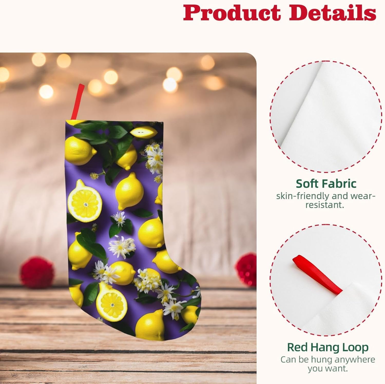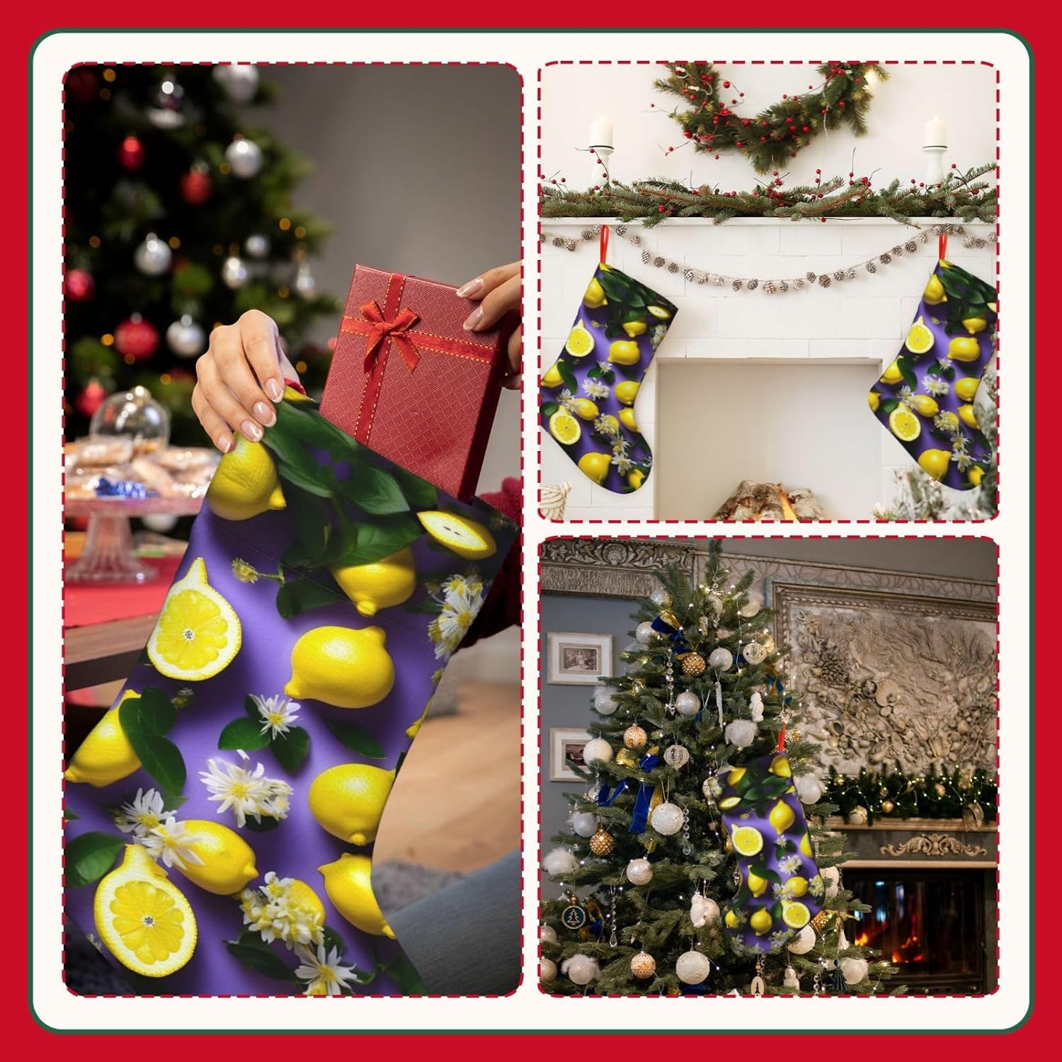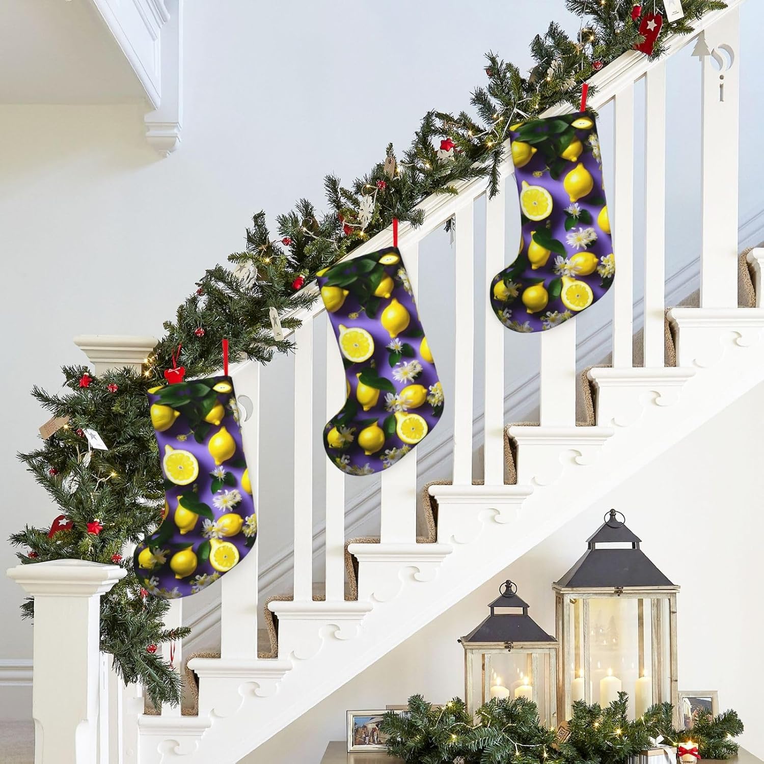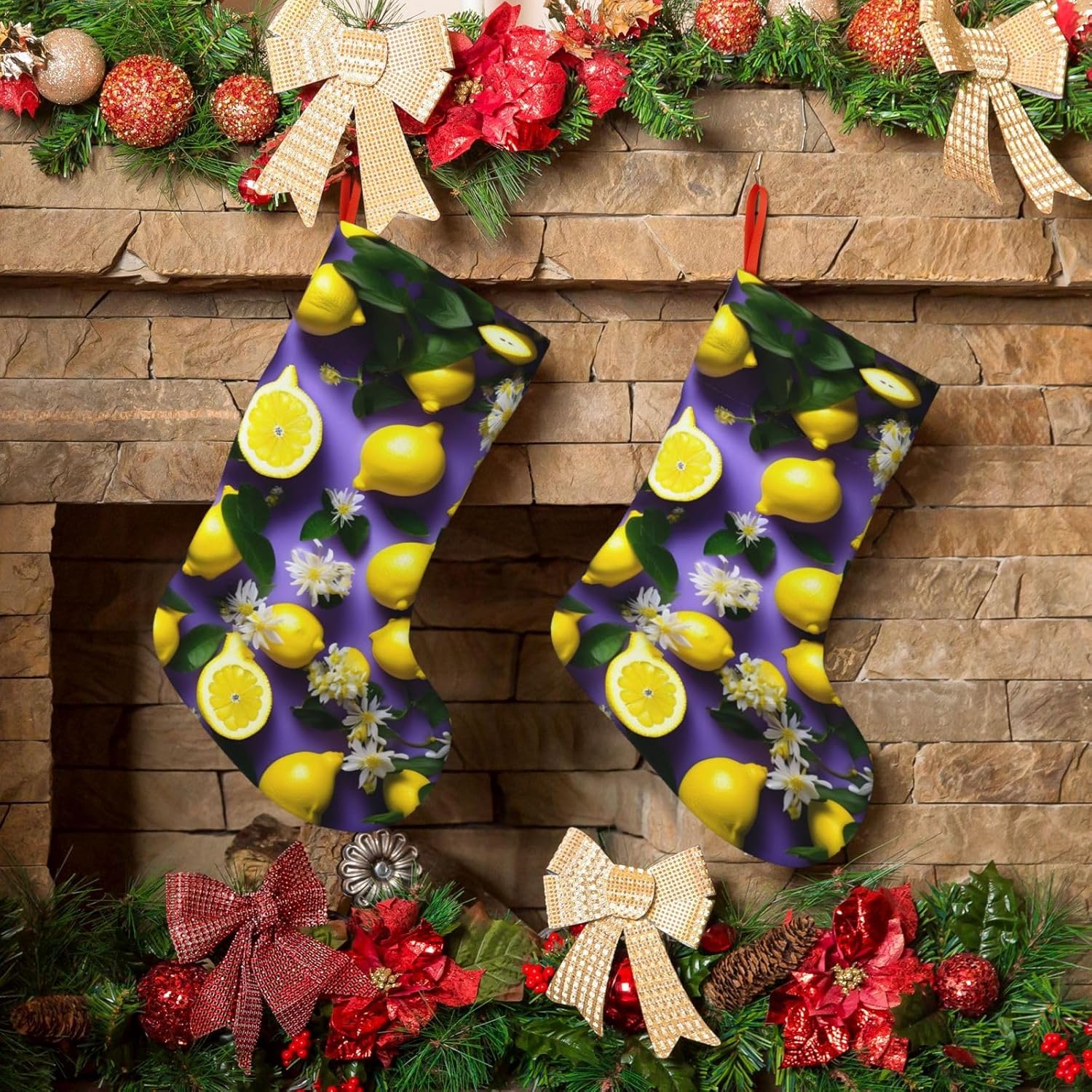 KoNsev Calza di Natale da 45,7 cm per ragazzi e ragazze, grandi calze di Natale per vacanze in famiglia, festa di Natale, stampa di limoni e fiori